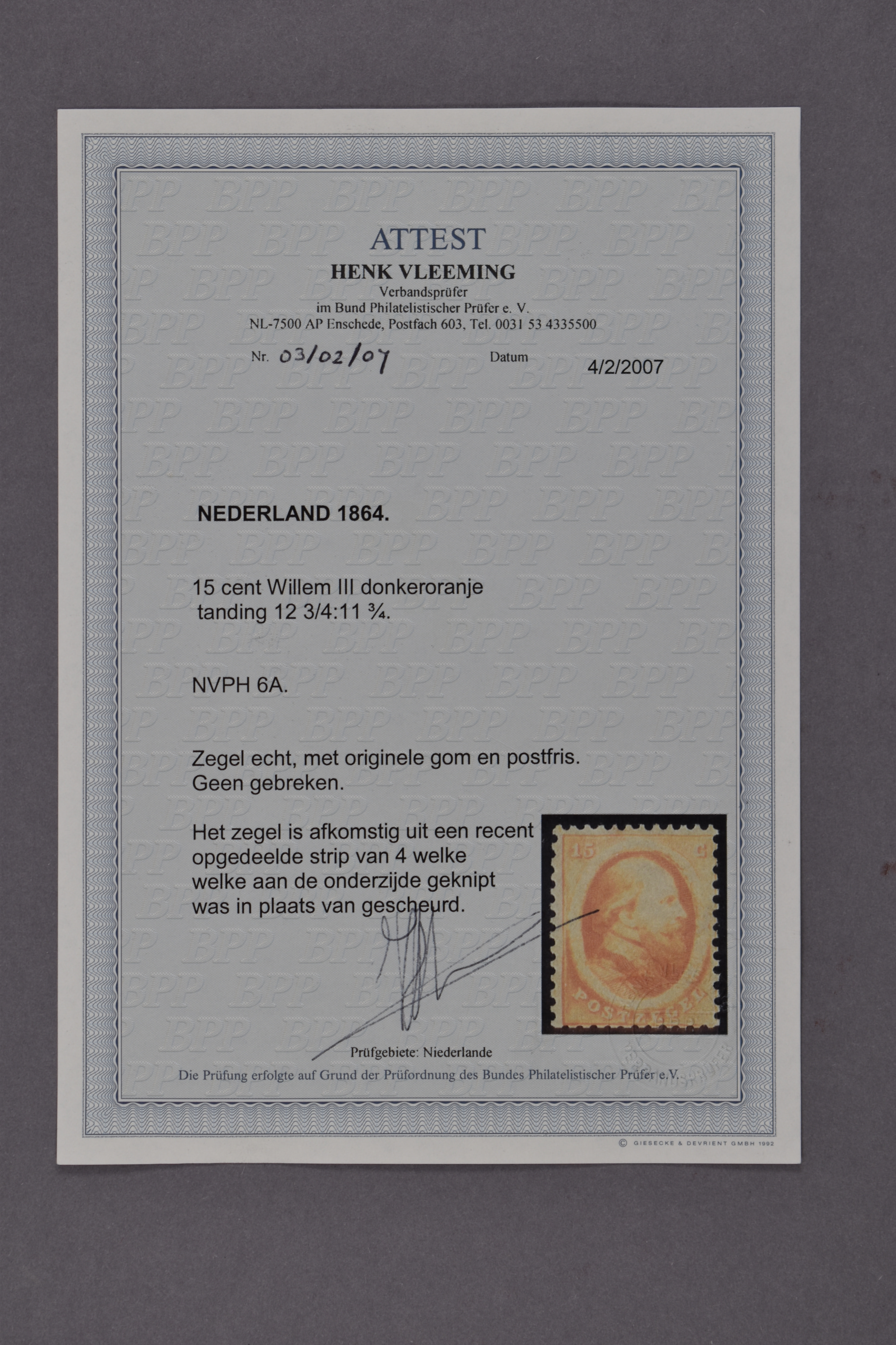1105 nh image6A, 15 cent donkeroranje, postfris prachtex. met certificaat Vleeming (2007) € 7000 (Image) (Image2)