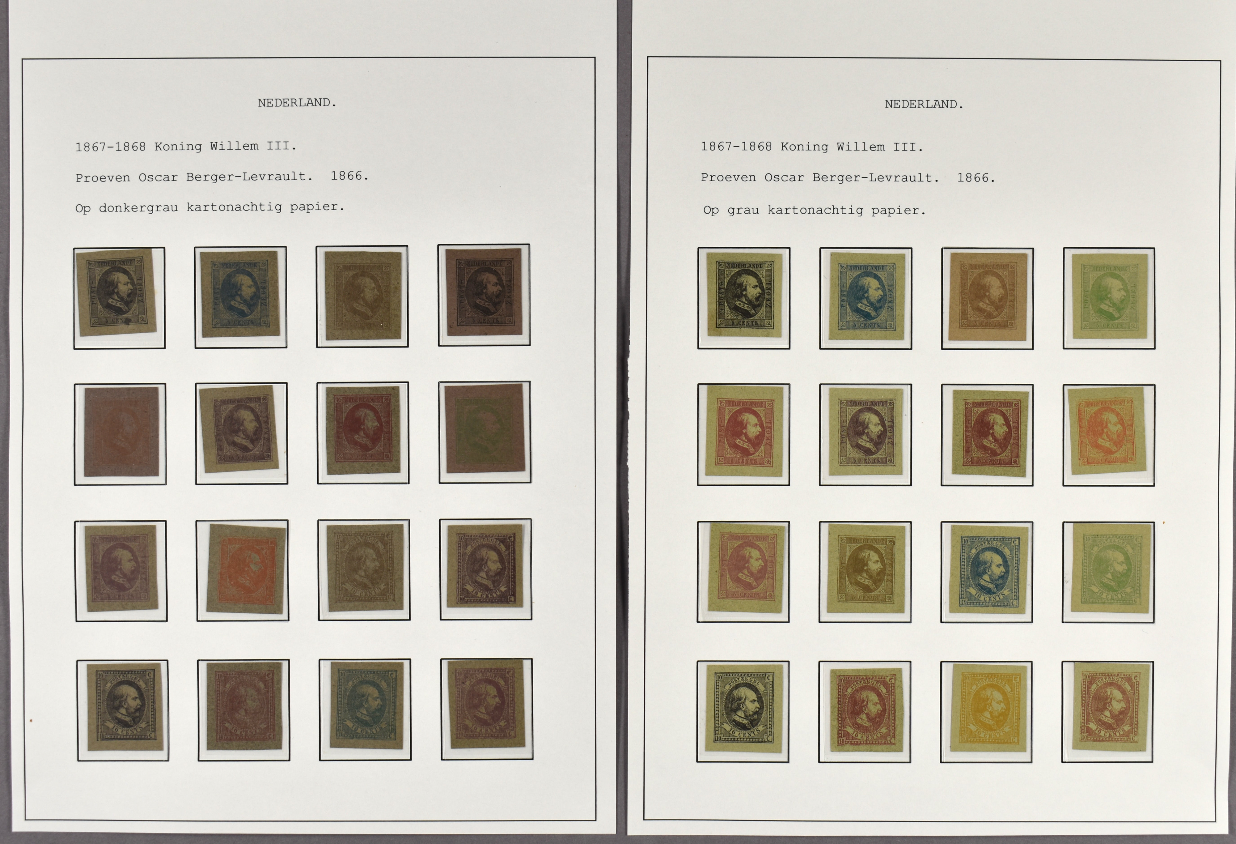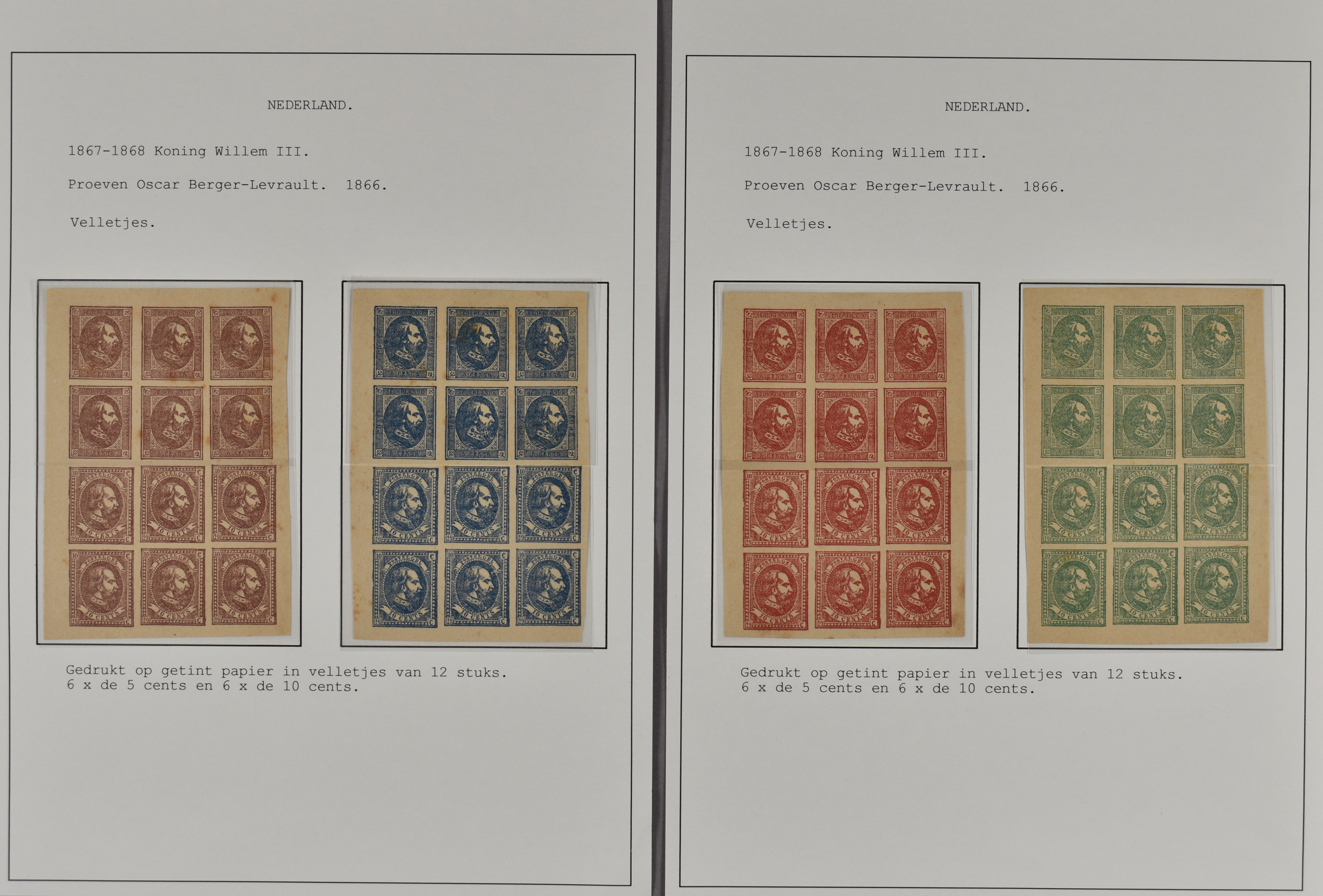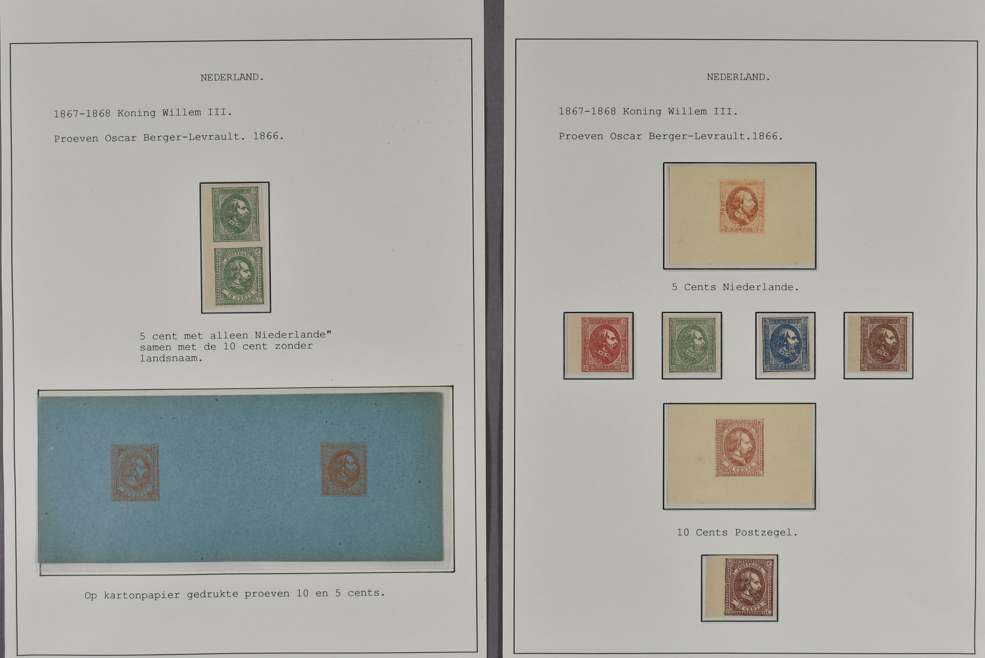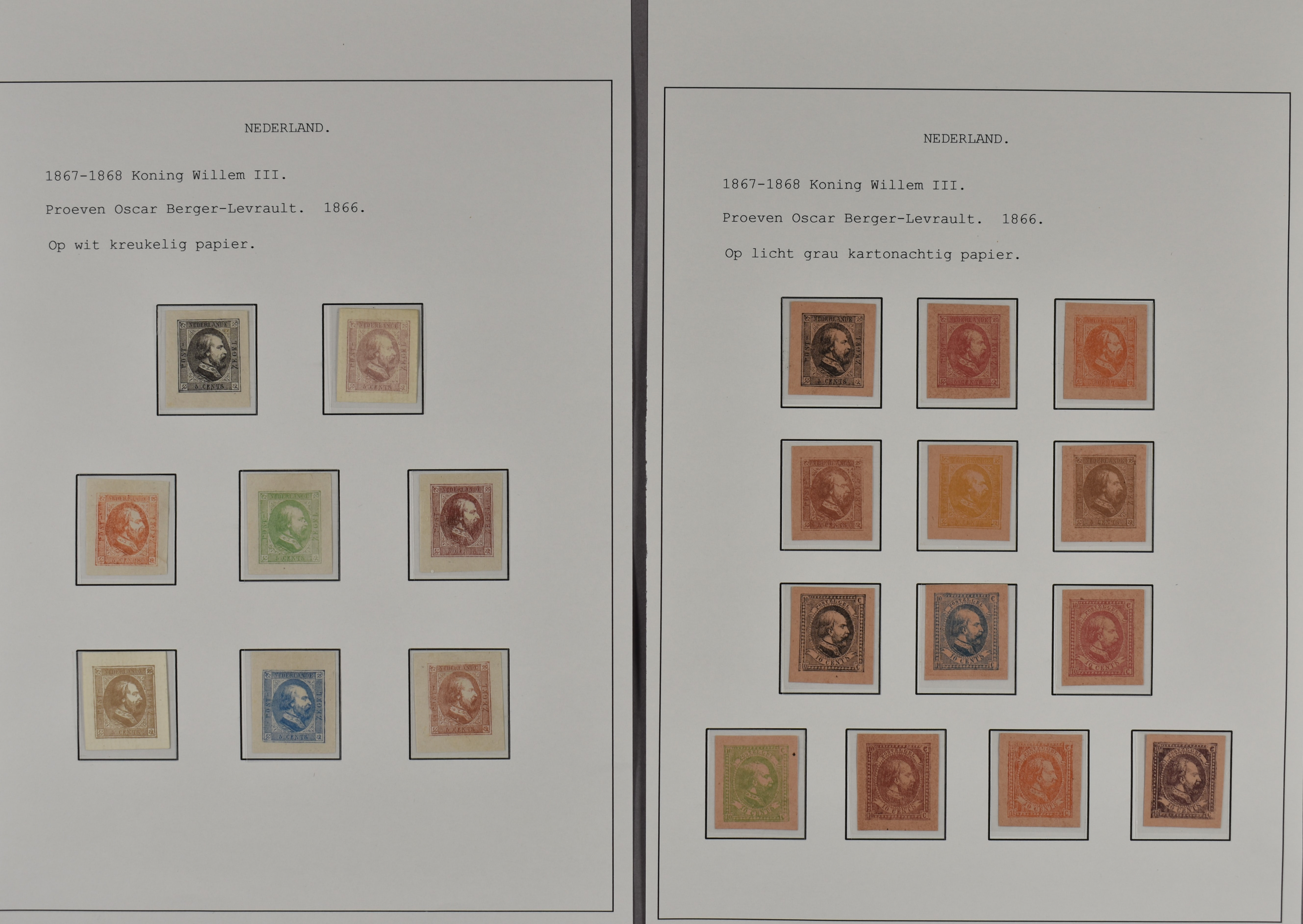 1107 (og) imagePC27a en PC27b, proeven van Oscar Berger-Levrault van de 5 en de 10 cent in verschillende kleuren en op meerdere papiersoorten. Totaal ruim 100 losse exemplaren, 1 velletje van 2 ex. op kartonpapier en 4 velletjes van 12 stuks. Interessant kavel! (Image) (Image2) (Image3) (Image4) (Image5)