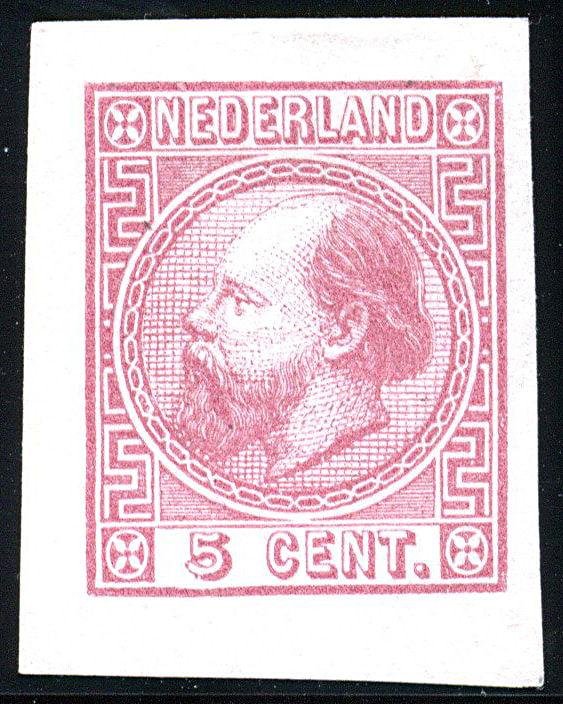 1108 (og) imagePC51v, proef van Oscar Berger-Levrault uit juni 1868 van de 5 cent karmijn op dun wit papier (wmk. str.€), afkomstig uit velletje van 4. Prachtex. Hfl. 250 (Image)