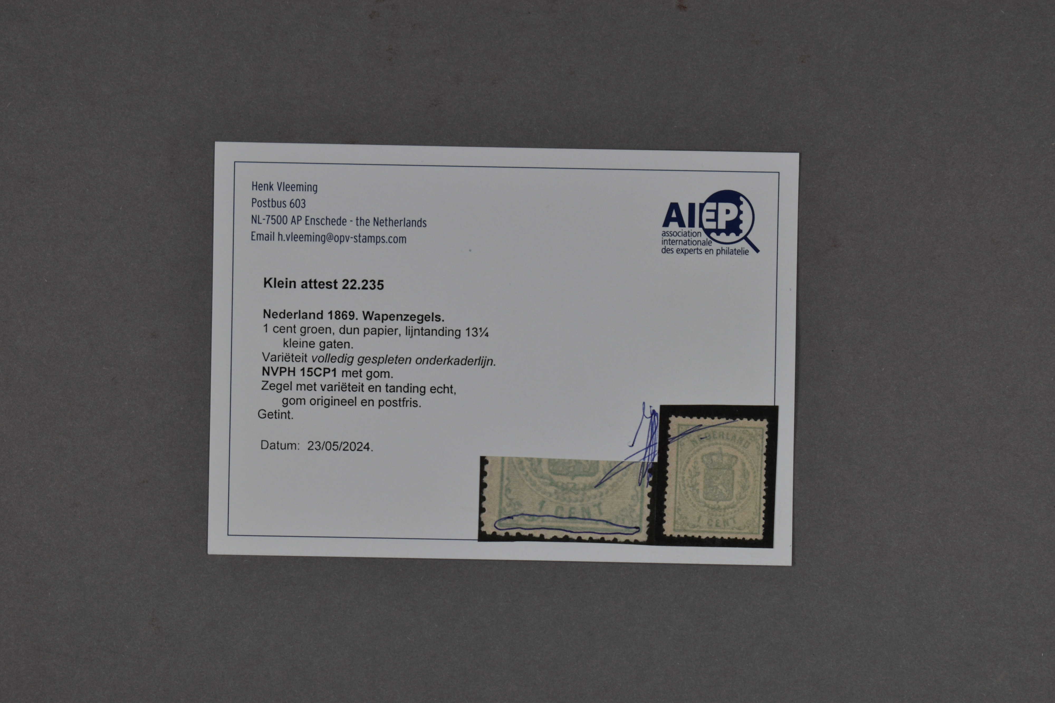15P1, 1 cent groen, Lt. 13¼ kl.g., met plaatfout "volledig gespleten onderlijn", postfris prachtex. met iets getinte gom. Klein attest Vleeming (2024) Cat.wrd. NVPH € 1500++, Mast: liefhebbersprijs (Image) (Image2)