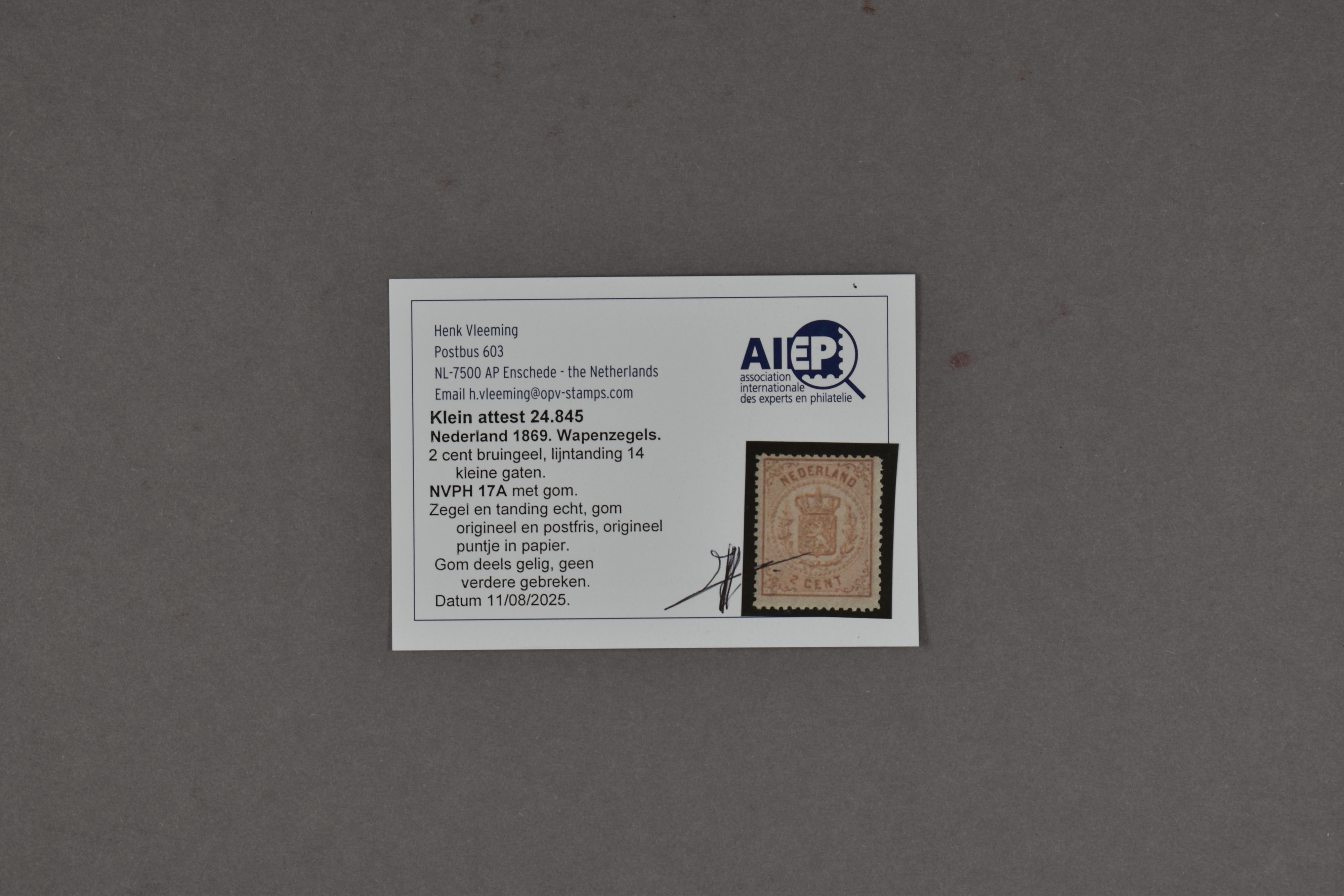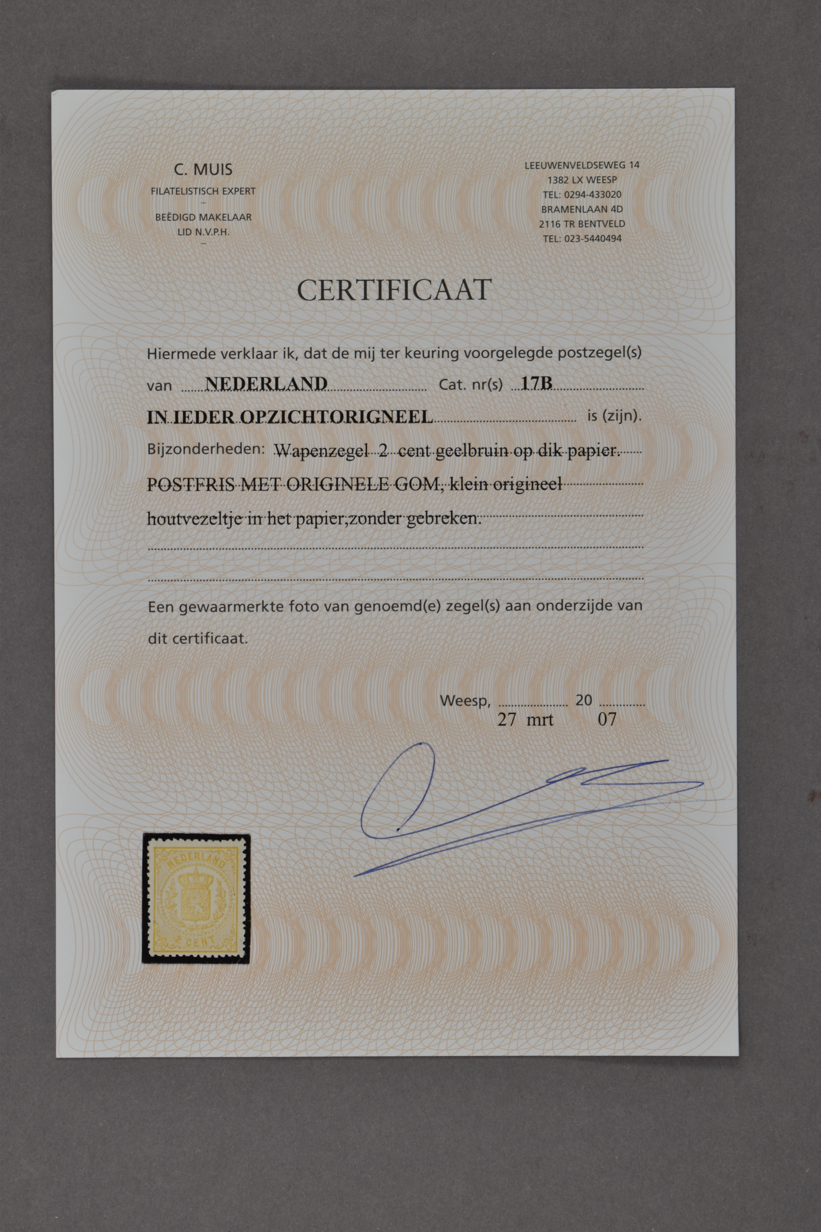 17A, Wapenzegel, 2 cent bruingeel, Kt. 14 kl.g., postfris prachtex. met certificaat Vleeming (2025) € 600 (Image) (Image2)