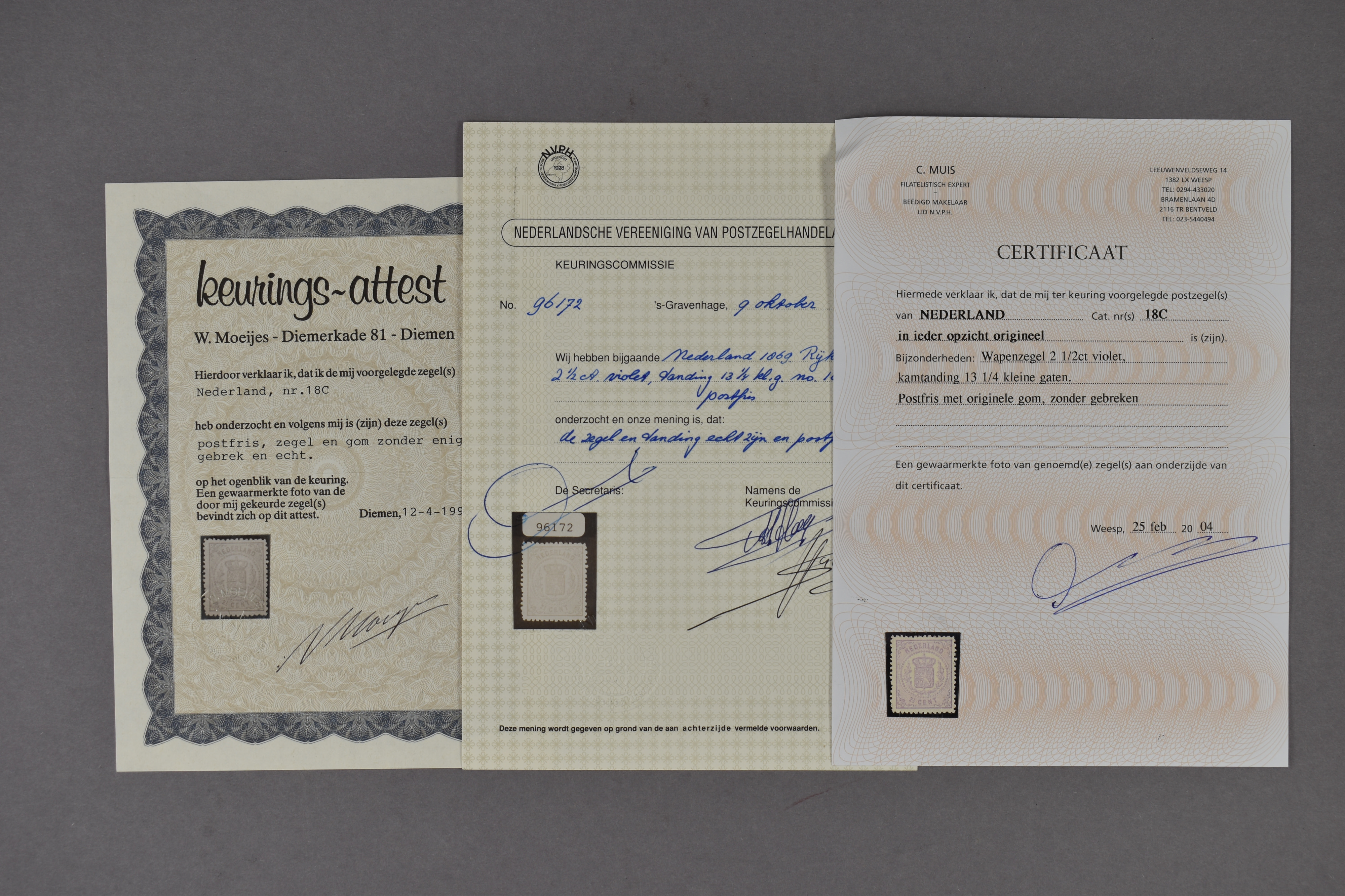18C, 2½ cent violet, Kt. 13¼ kl.g., postfris prachtex. met certificaten Moeijes (1995), NVPH (1996) en Muis (2004) € 6000 (Image) (Image2)
