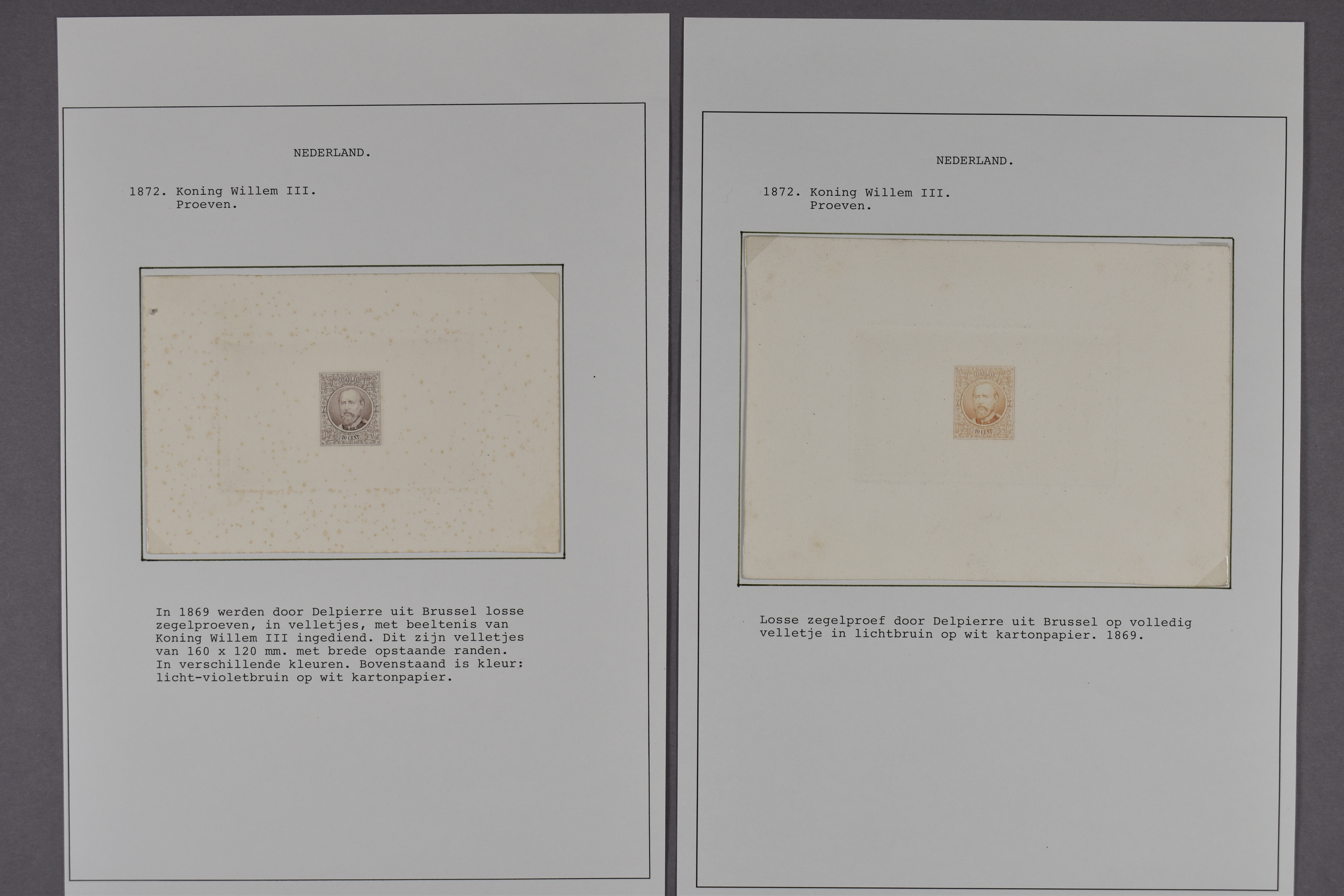 PC79d en PC79g, zegelproeven in lichtbruin en licht violet-bruin van Delpierre in velletjes, resp. pracht en zeer fraai ex. Hfl. 700 (Image) (Image2)