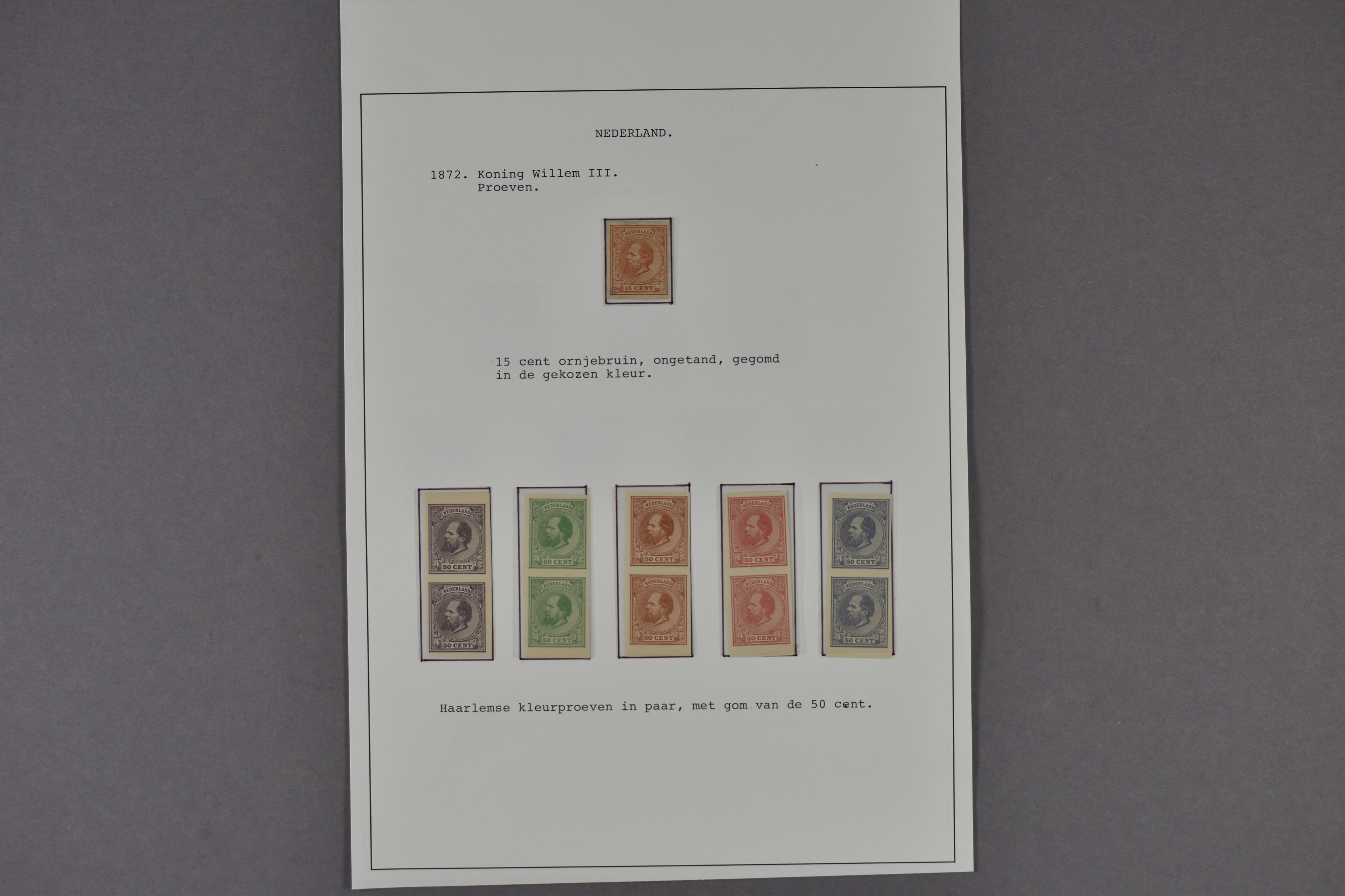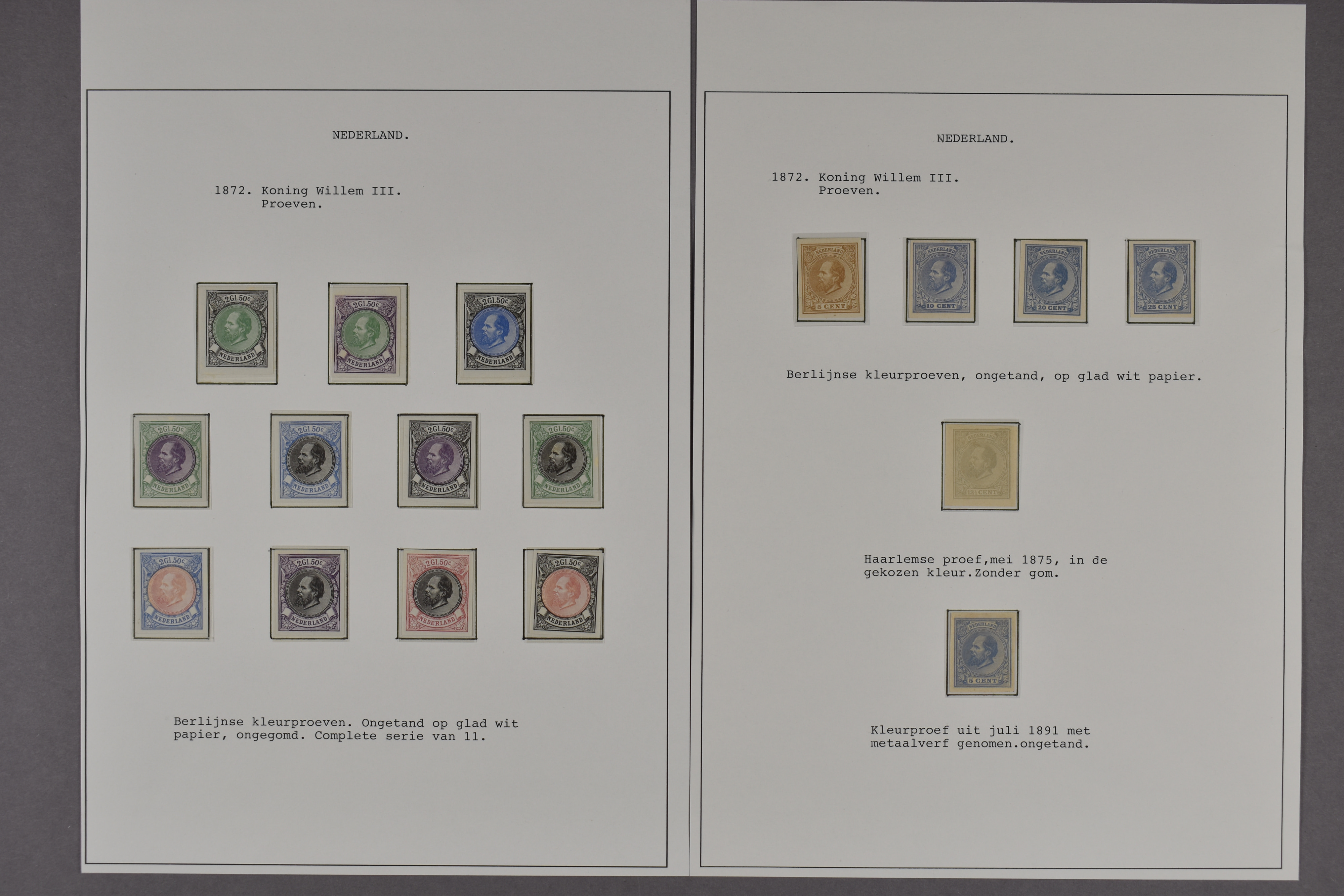 Emissie 1872, Berlijnse en Haarlemse kleurproeven, ongetand, zonder en met gom, waarbij gekozen kleuren. (Image) (Image2)