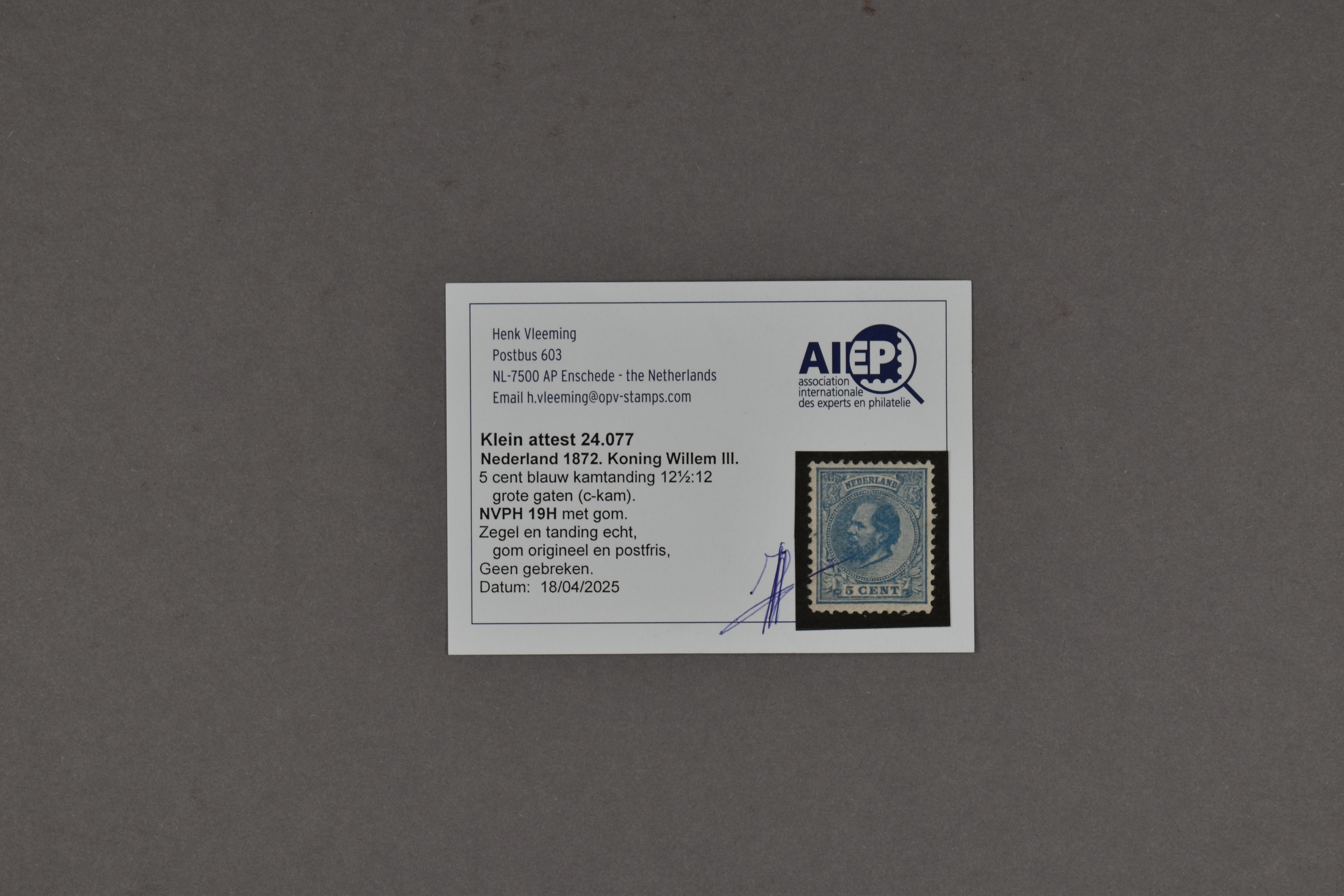 19H, 5 cent blauw, Kt. 12½ x 12 gr.g. (c-kam), postfris prachtex. met klein attest Vleeming (2025) € 400 (Image) (Image2)