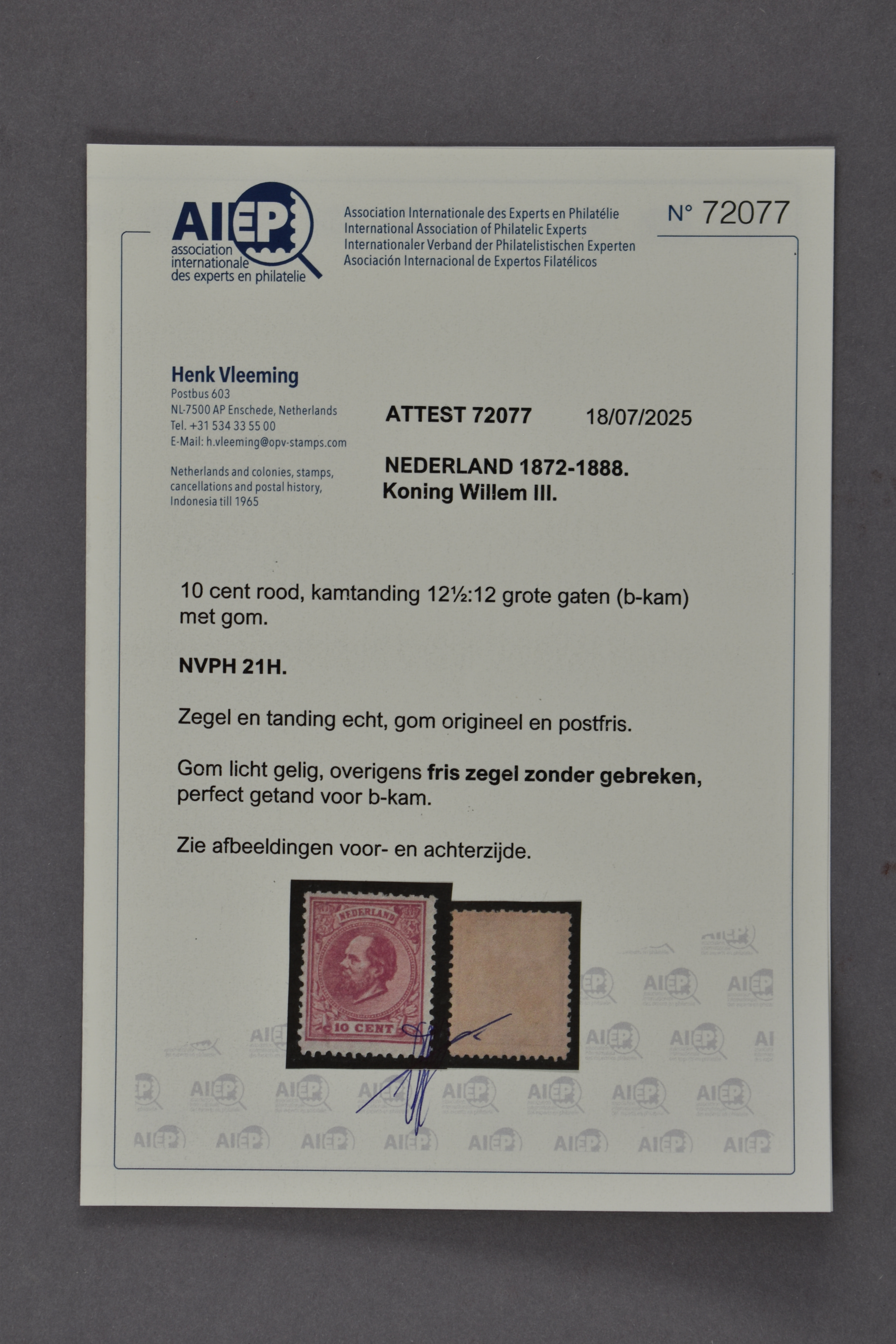 21H, 10 cent rood, Kt. 12½ : 12 gr. g. (b-kam), iets gelige gom, postfris prachtex. met cert. Vleeming (2025): "...perfect getand voor b-kam", € 550