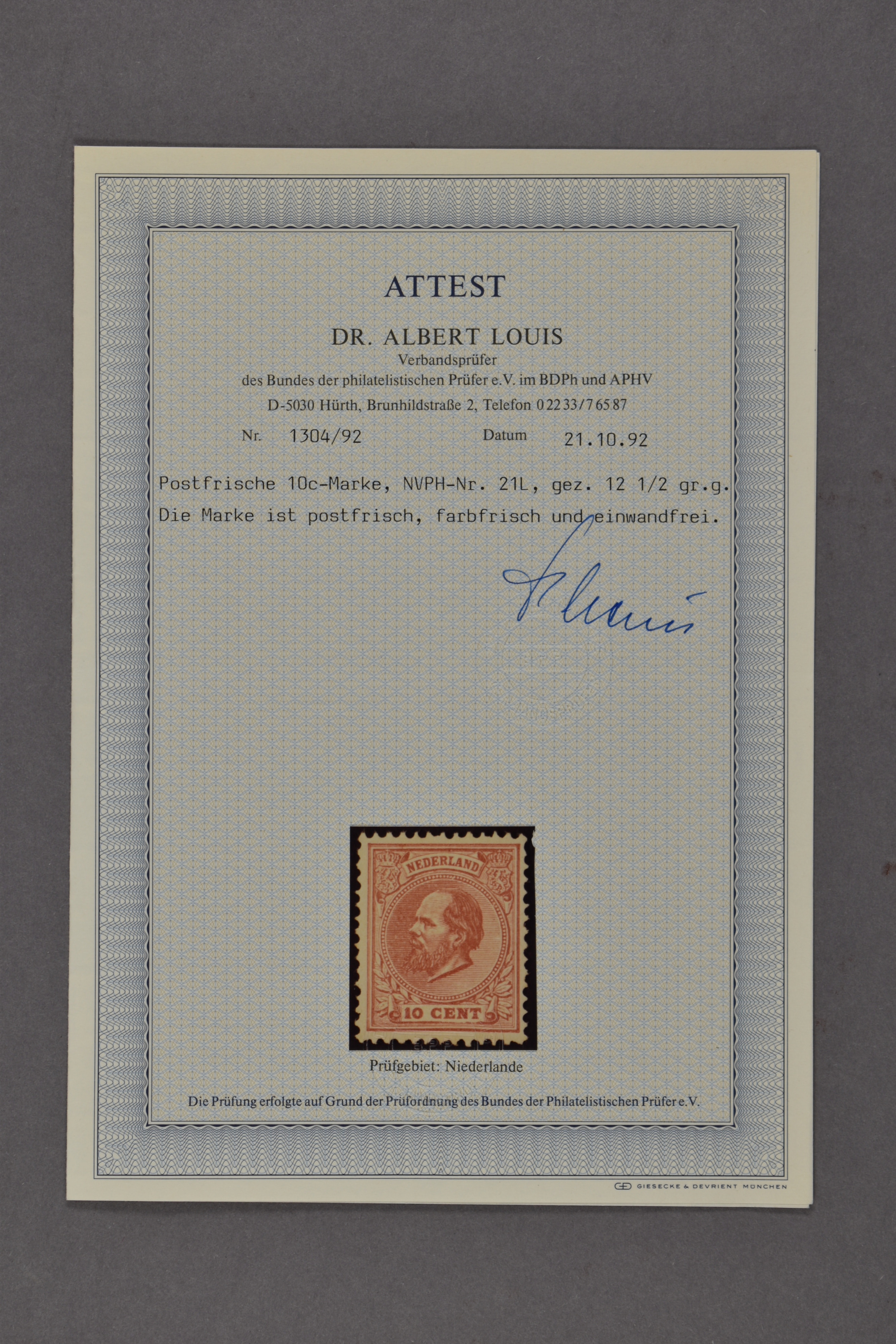 21L, 10 cent rood, Kt. 12½, postfris prachtex. met certificaat Dr. Louis (1992) € 600 (Image) (Image2)