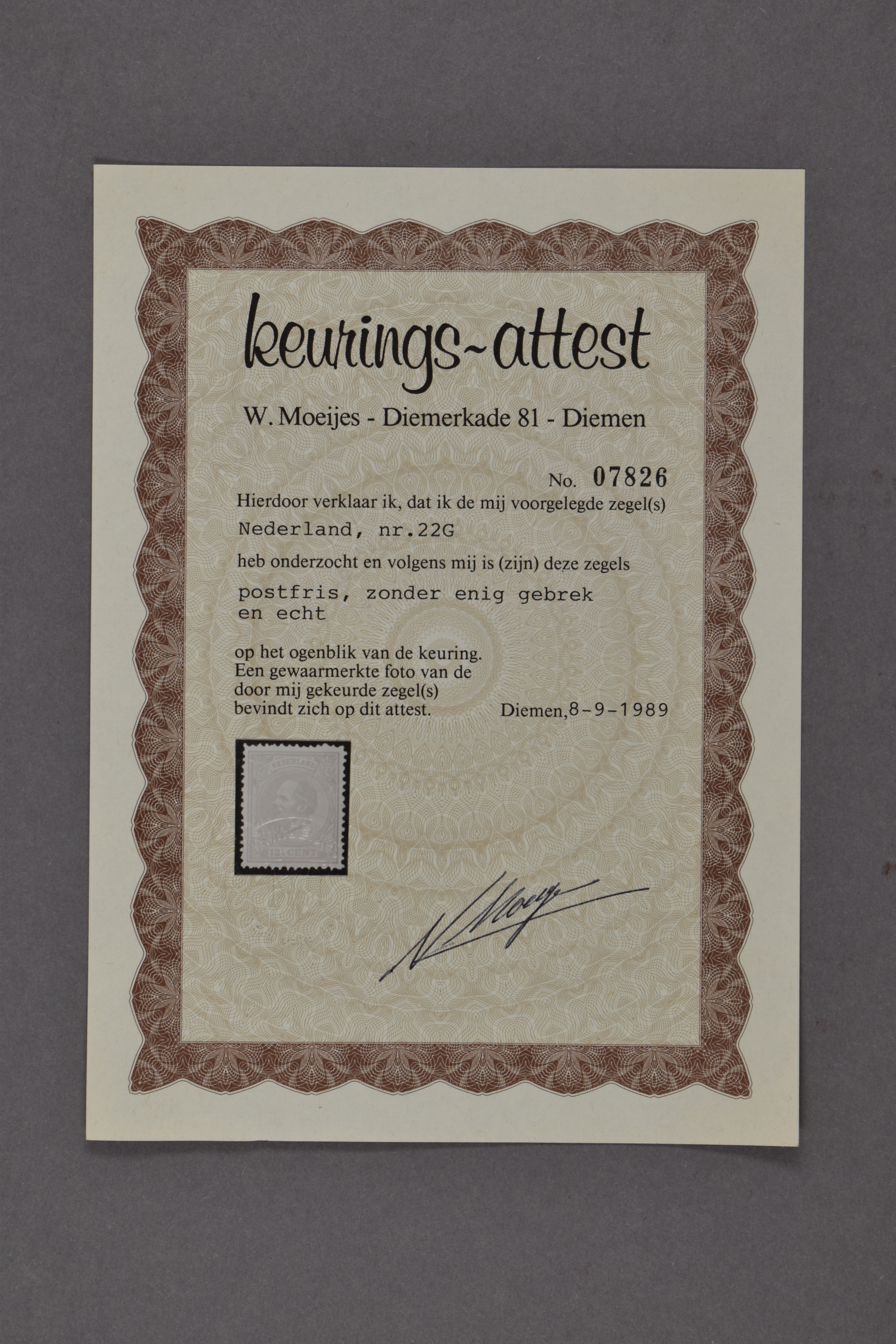 22G, 12½ cent grijs, Kt. 13½ x 13¼, postfris prachtex. met certificaat Moeijes (1989) € 650 (Image) (Image2)