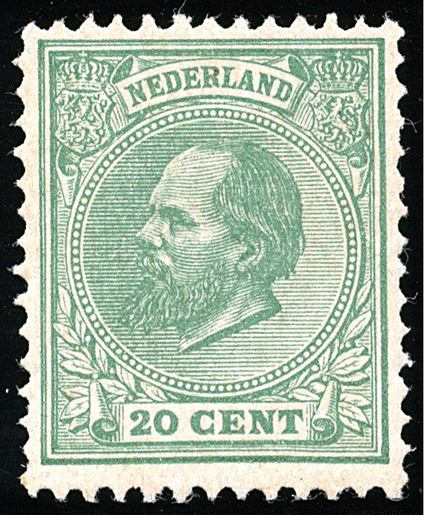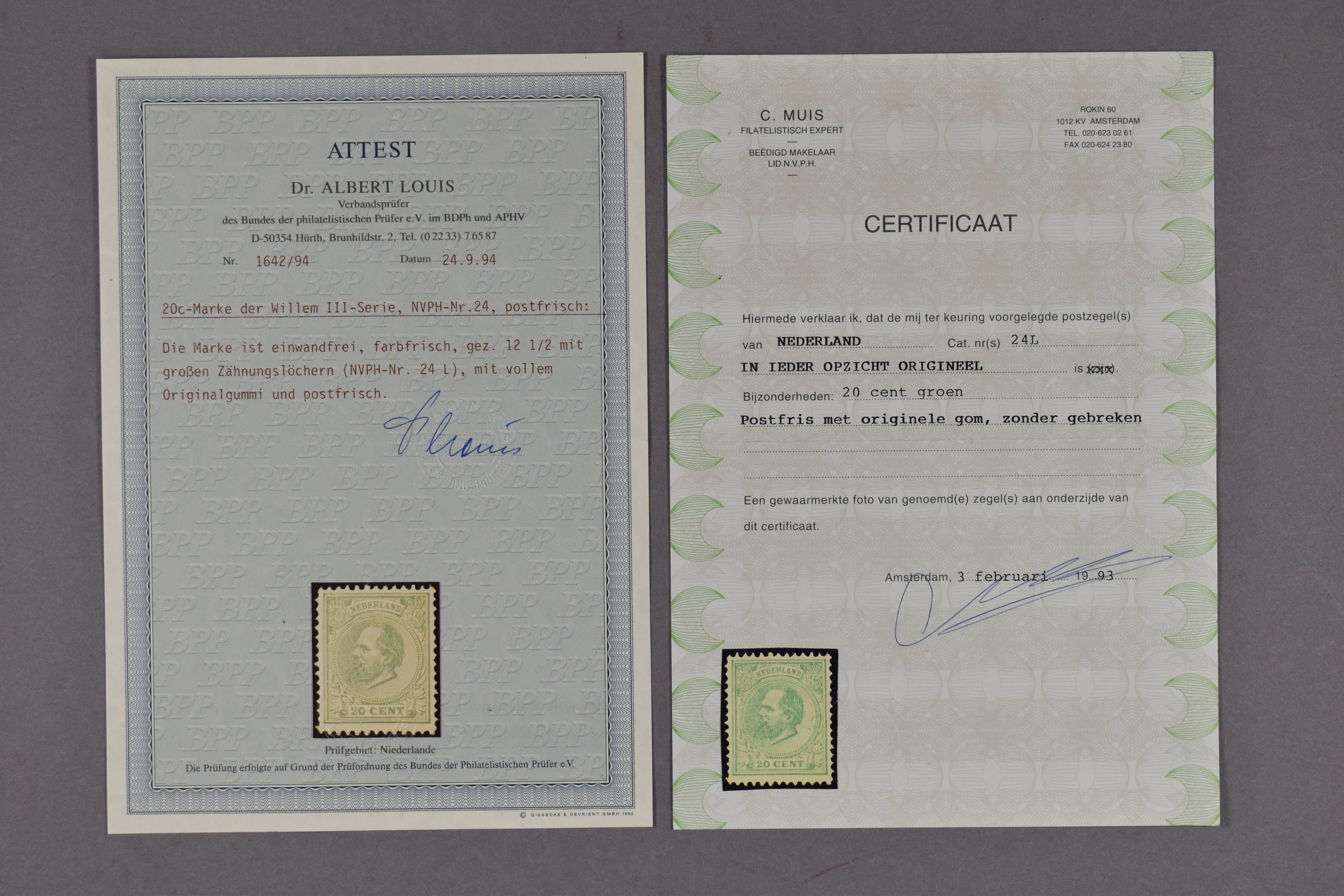 24L. 20 c ent groen, Kt. 12½ gr. g., postfris prachtex. met certificaten Muis (1993) en Dr.Louis (1994) € 8500 (Image) (Image2)