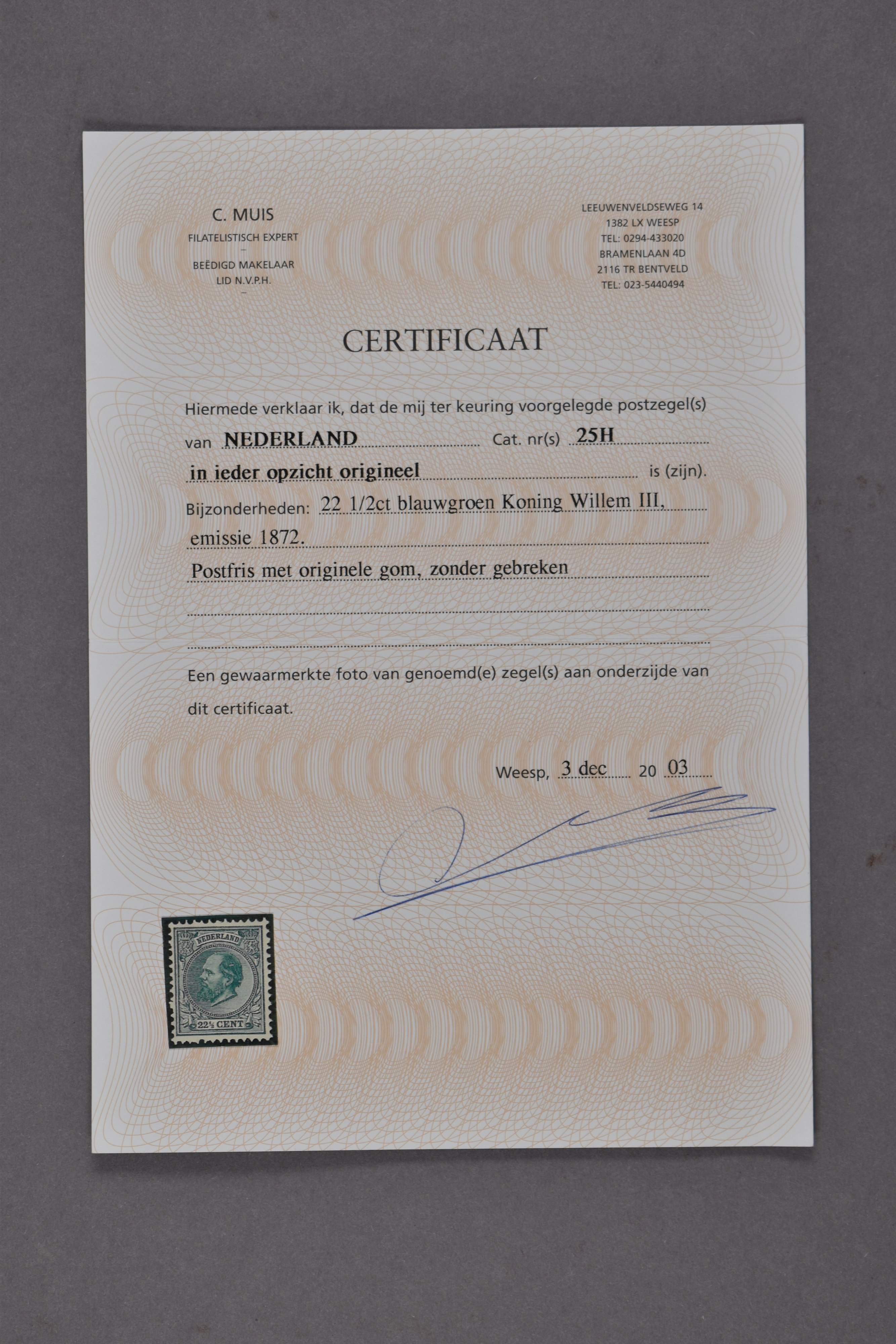 25H, 22½ cent blauwgroen, Kt. 12½ x 12 gr.g., postfris prachtex. met certificaat Muis (2003) € 1650 (Image) (Image2)