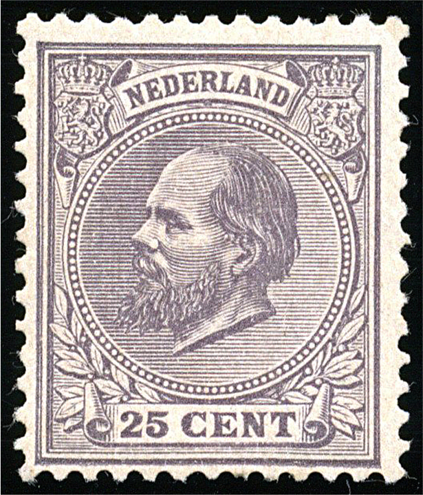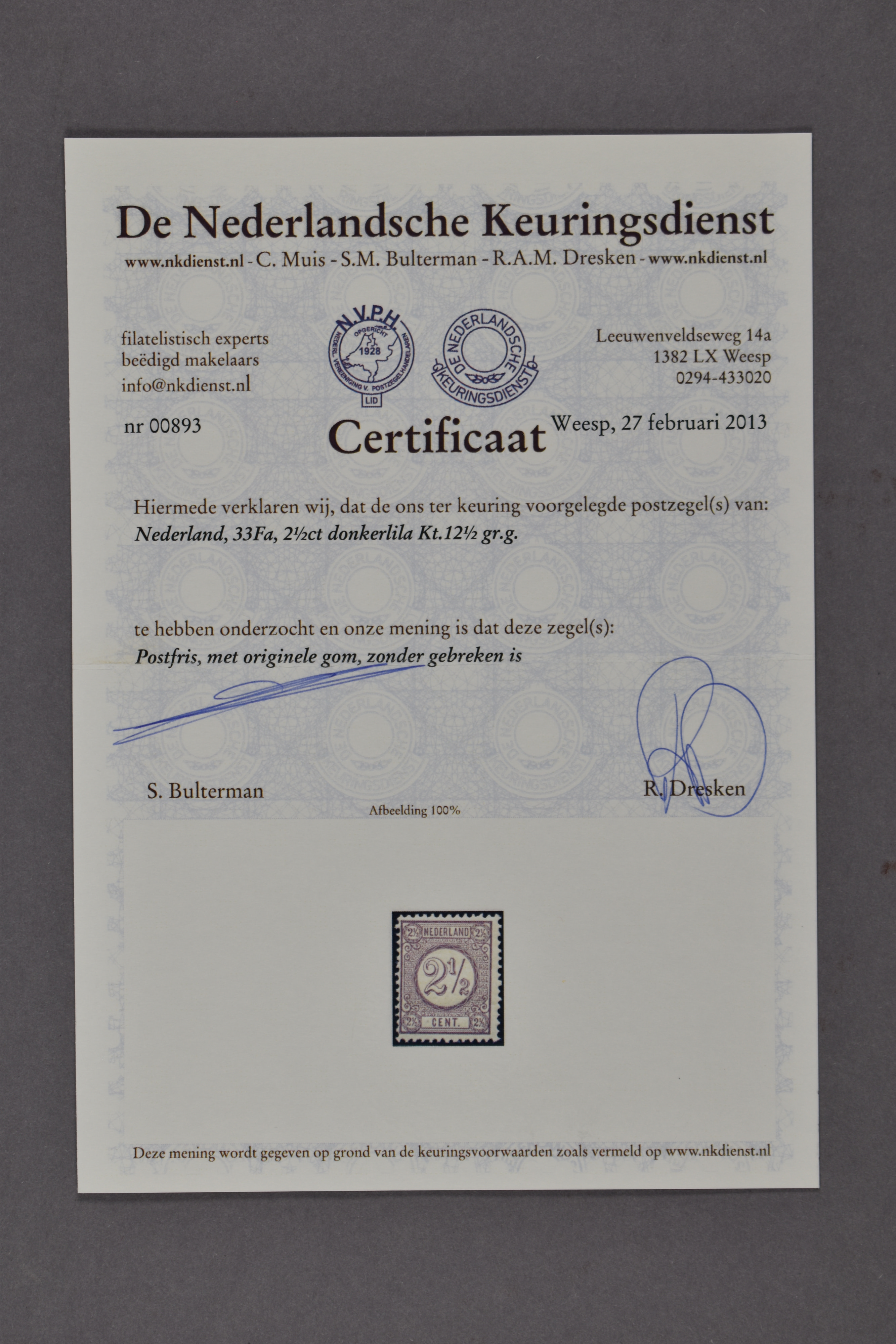 33Fa, 2½ cent donkerlila, Kt. 12½ gr.g., postfris prachtex. met certificaat NKD (2013) € 1150 (Image) (Image2)