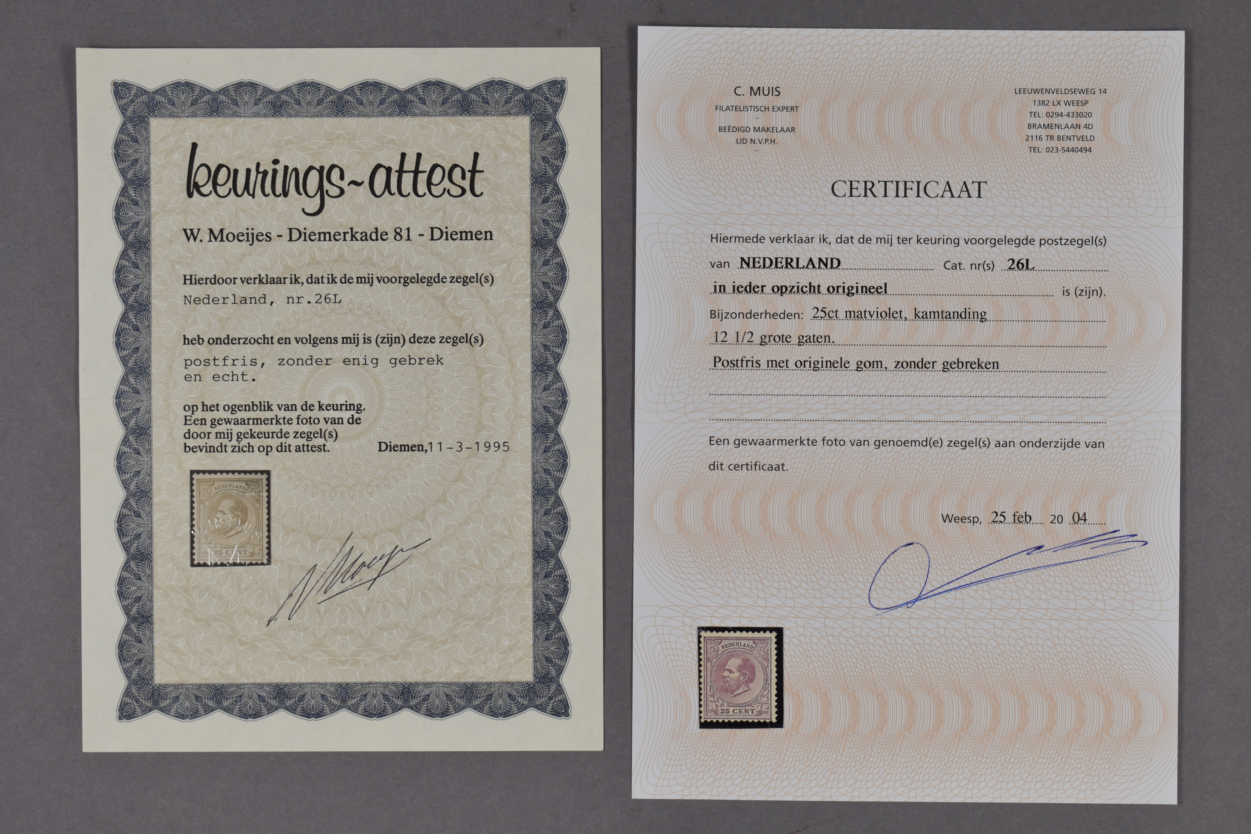 26L, 25 cent matviolet, Kt. 12½ gr.g., postfris prachtex. met certificaten Moeijes (1995) en Muis (2004) € 8000 (Image) (Image2)
