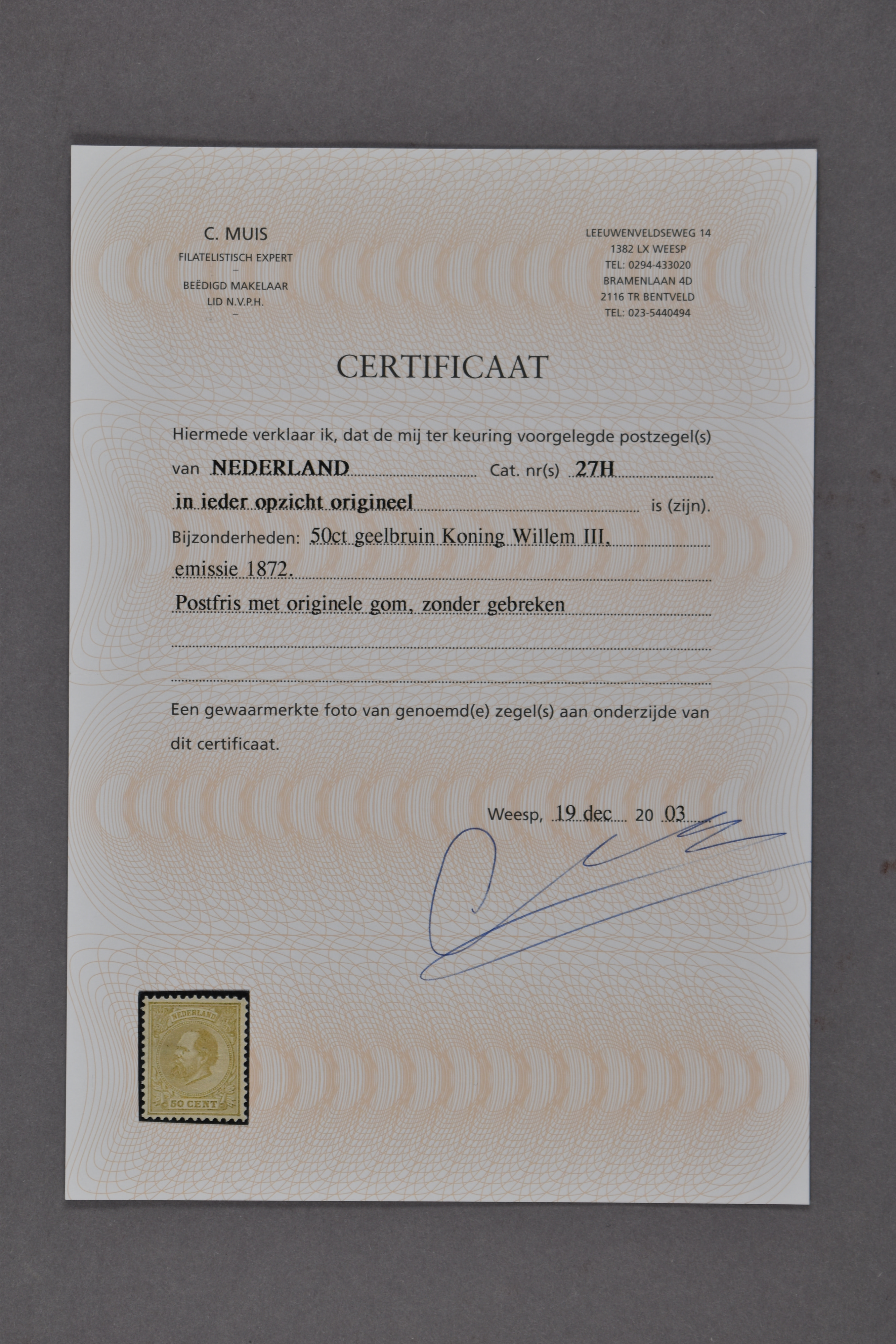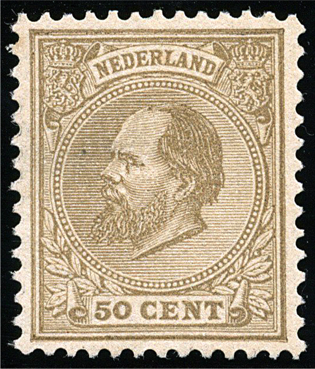 27H, 50 cent geelbruin, Kt. 12½ x 12 gr.g., postfris prachtex. met enkele minieme originele zwarte puntjes in het papier en met certificaat Muis (2003) € 9500