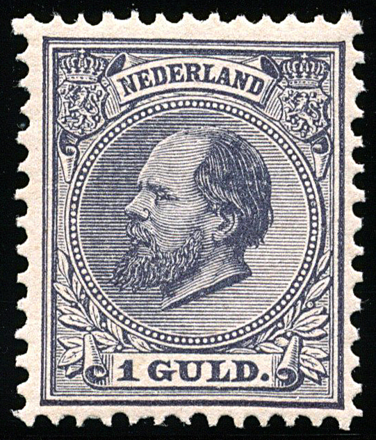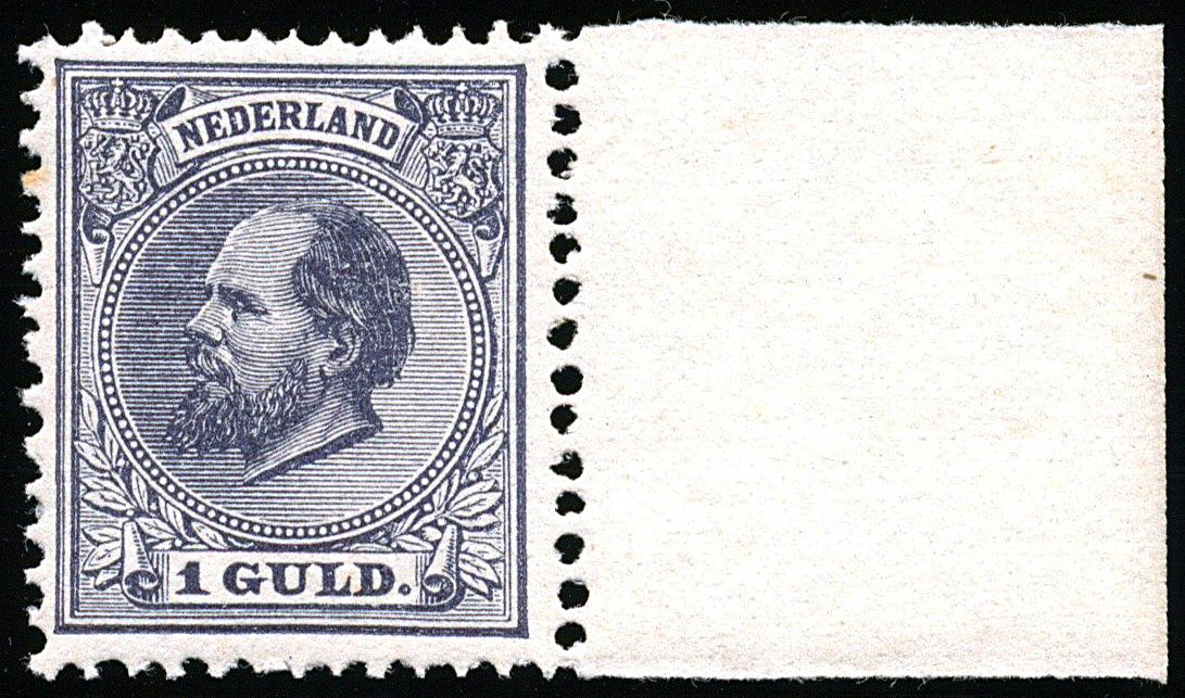 28, 1 gulden grijsviolet, postfris prachtex. met rechter velrand, nauwelijks waarneembaar bruin tandpuntje en certificaat Vleeming (2019) € 3000
