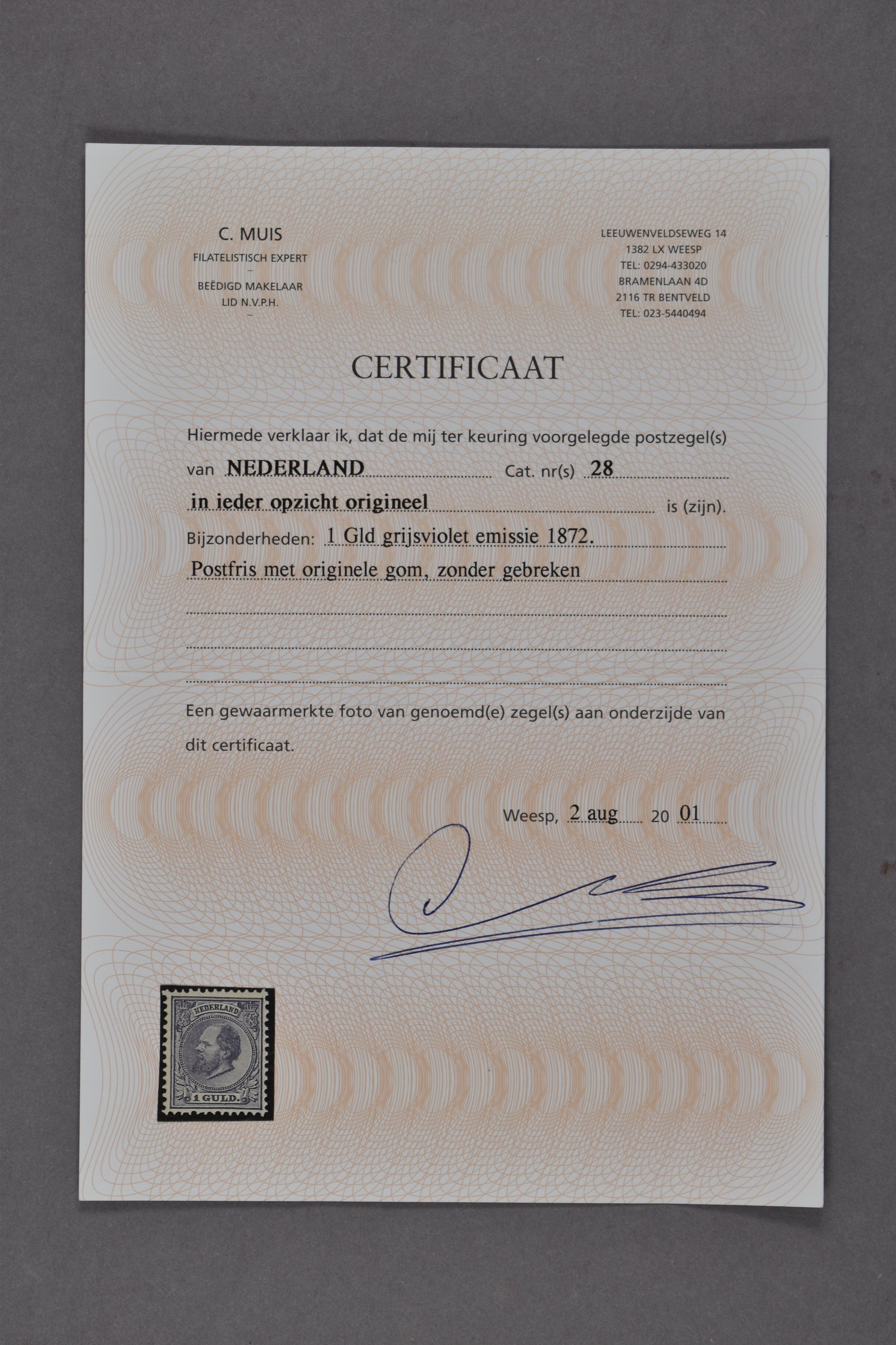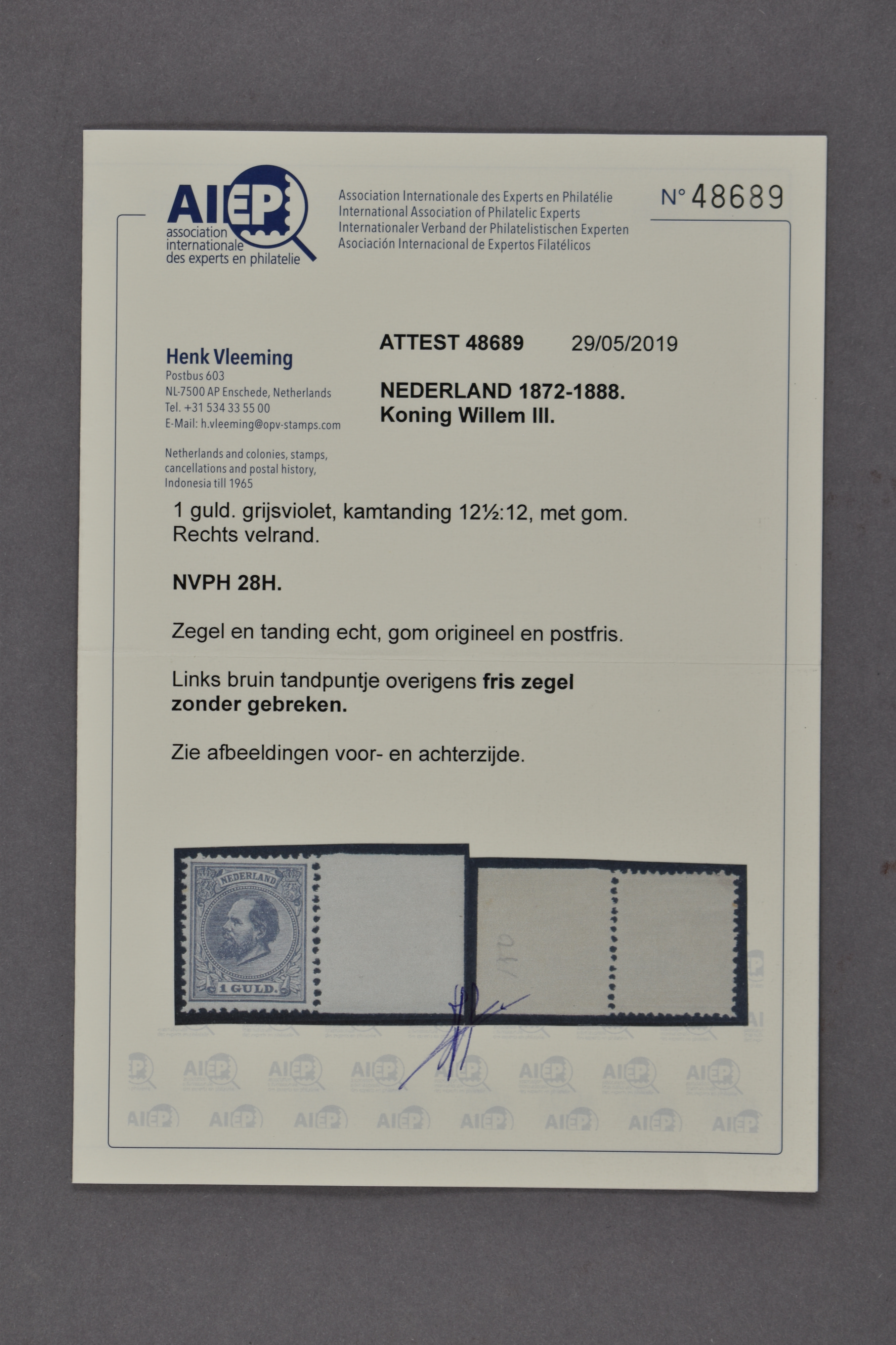 28H, 1 gulden grijsviolet, Kt. 12½ x 12 gr.g., postfris prachtex. met certificaat Muis (2001) € 3000 (Image) (Image2)