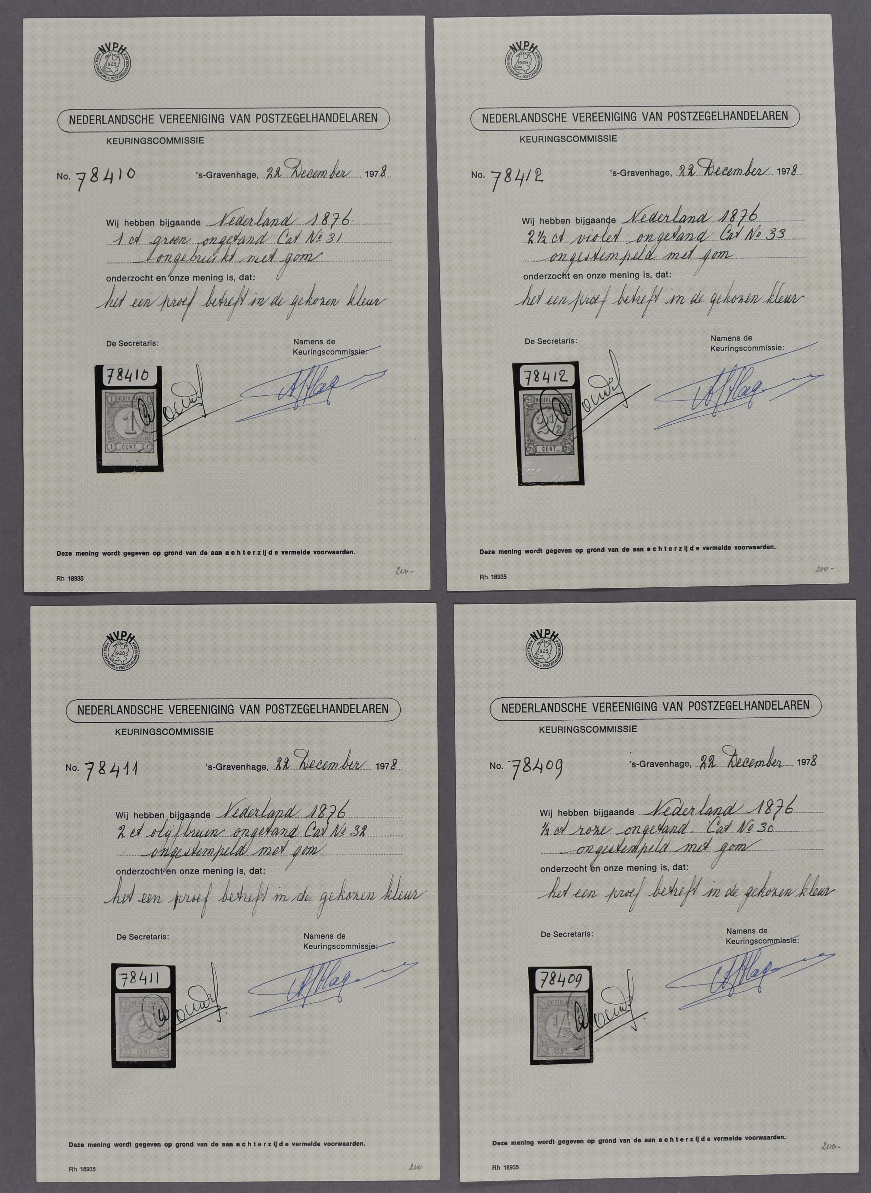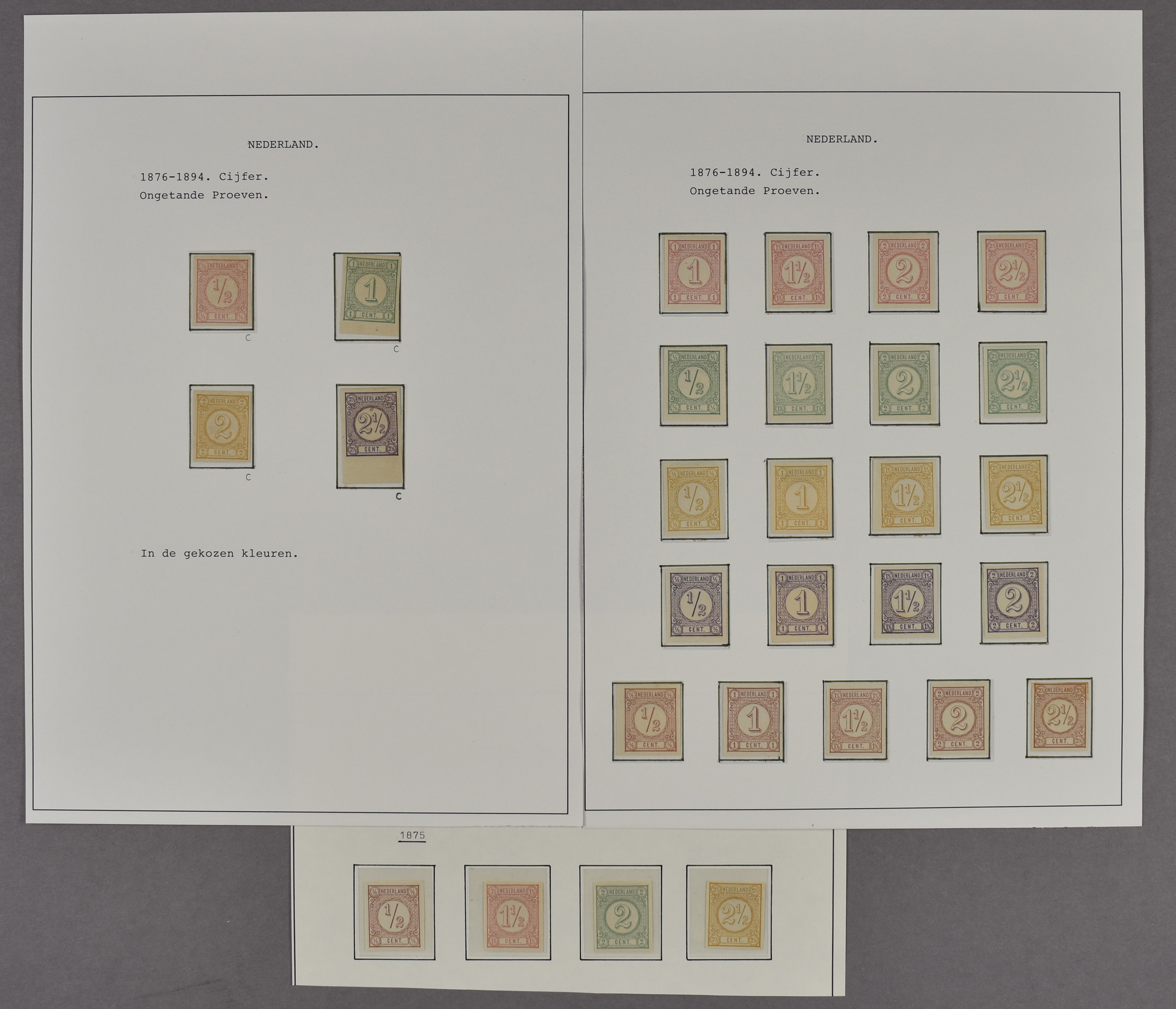 Emissie 1876 Cijfer. Ongetande, ongegomde kleurproeven PC98 t/m PC102, compleet inclusief de gekozen kleuren. Deze laatste met certificaten NVPH (1978)