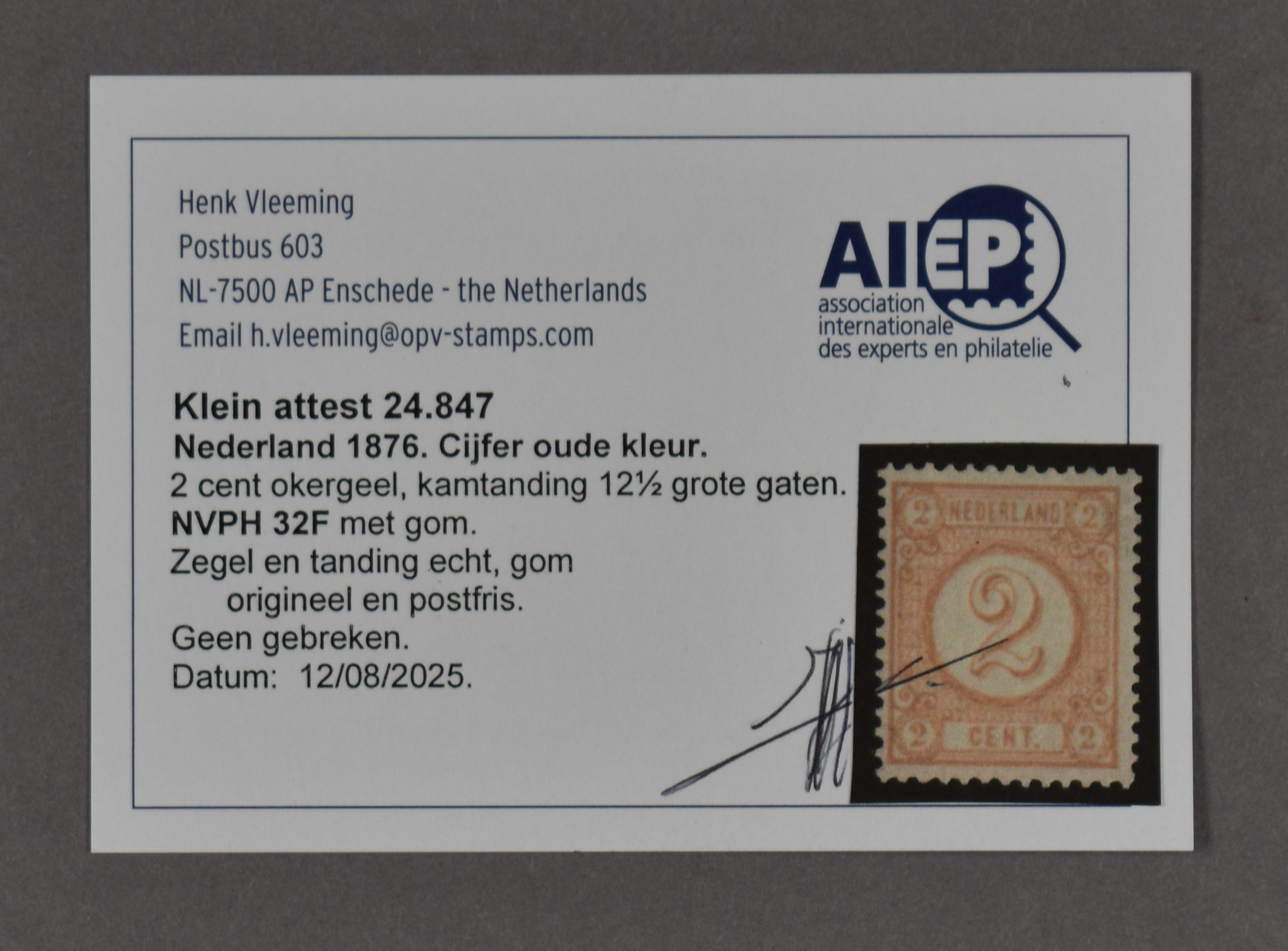 32F, 2 cent okergeel, Kt. 12½ gr.g., postfris prachtex. met klein attest Vleeming (2025) € 400 (Image) (Image2)