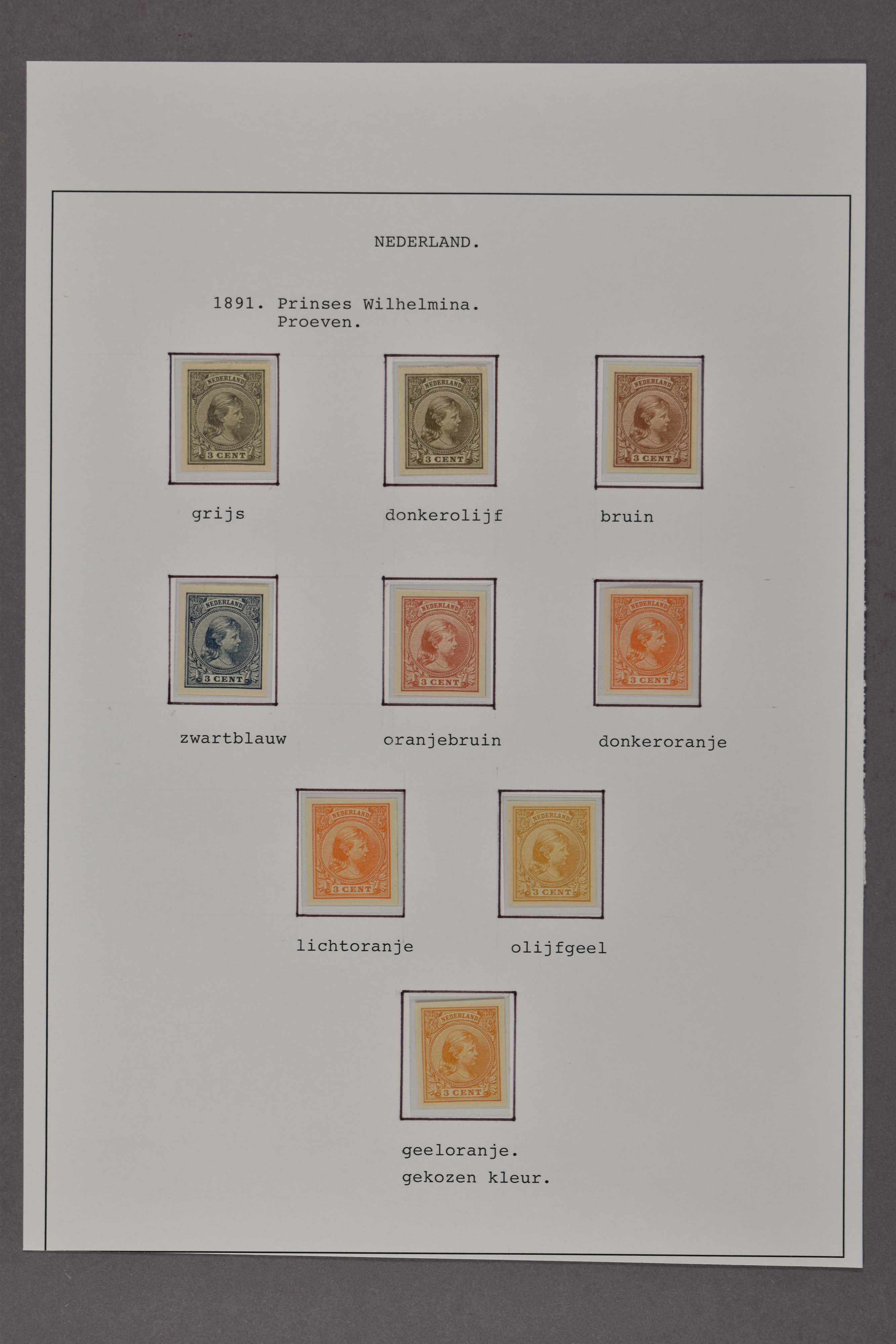 PC114, 9 ongetande, ongegomde kleurproeven van de 3 cent Hangend Haar, waarbij de gekozen kleur. (Image) (Image2)