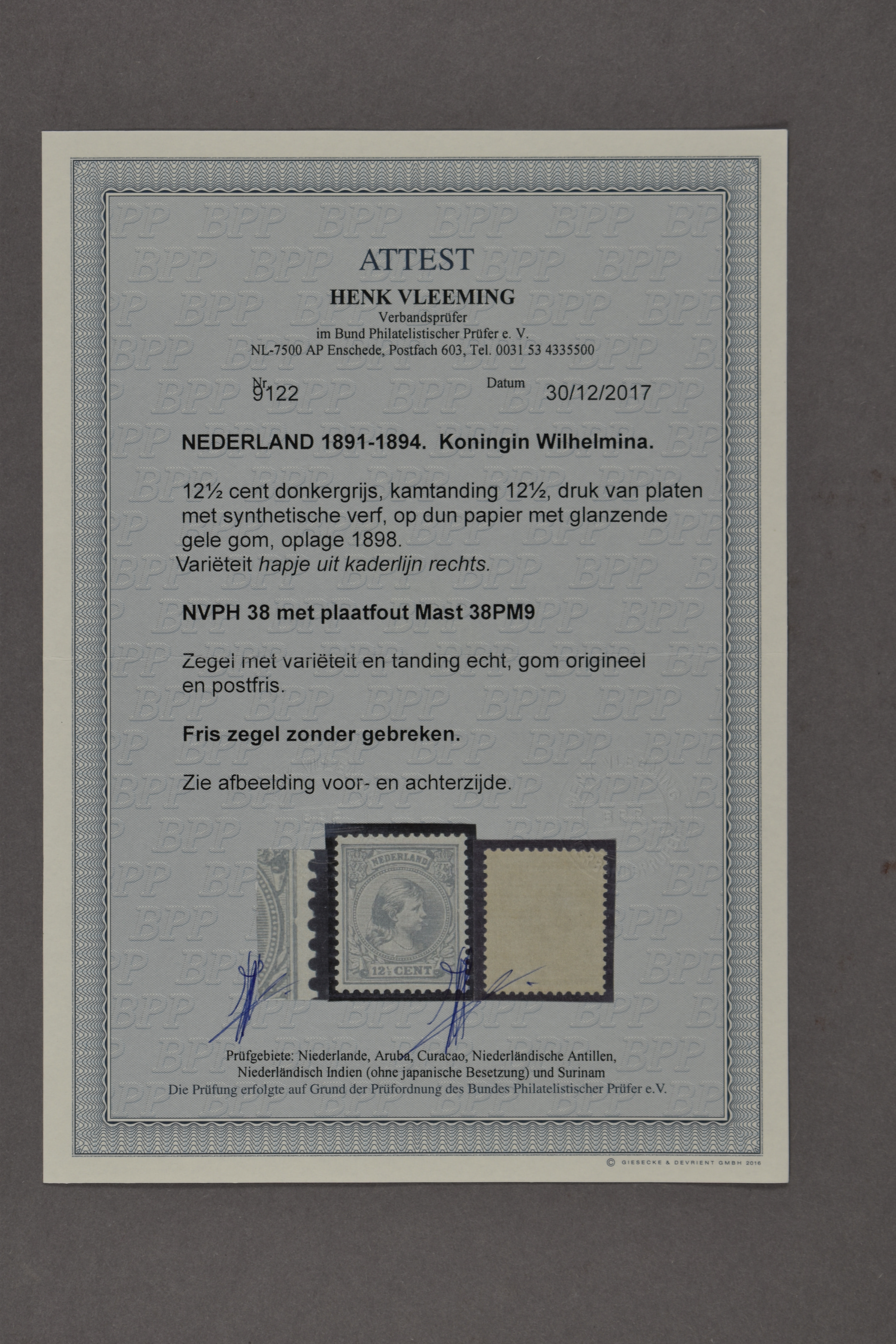 38PM9, 12½ cent donkergrijs met plaatfout "hapje uit rechter kaderlijn" , postfris prachtex met certificaat Vleeming (2017) Mast € 880 (Image) (Image2)