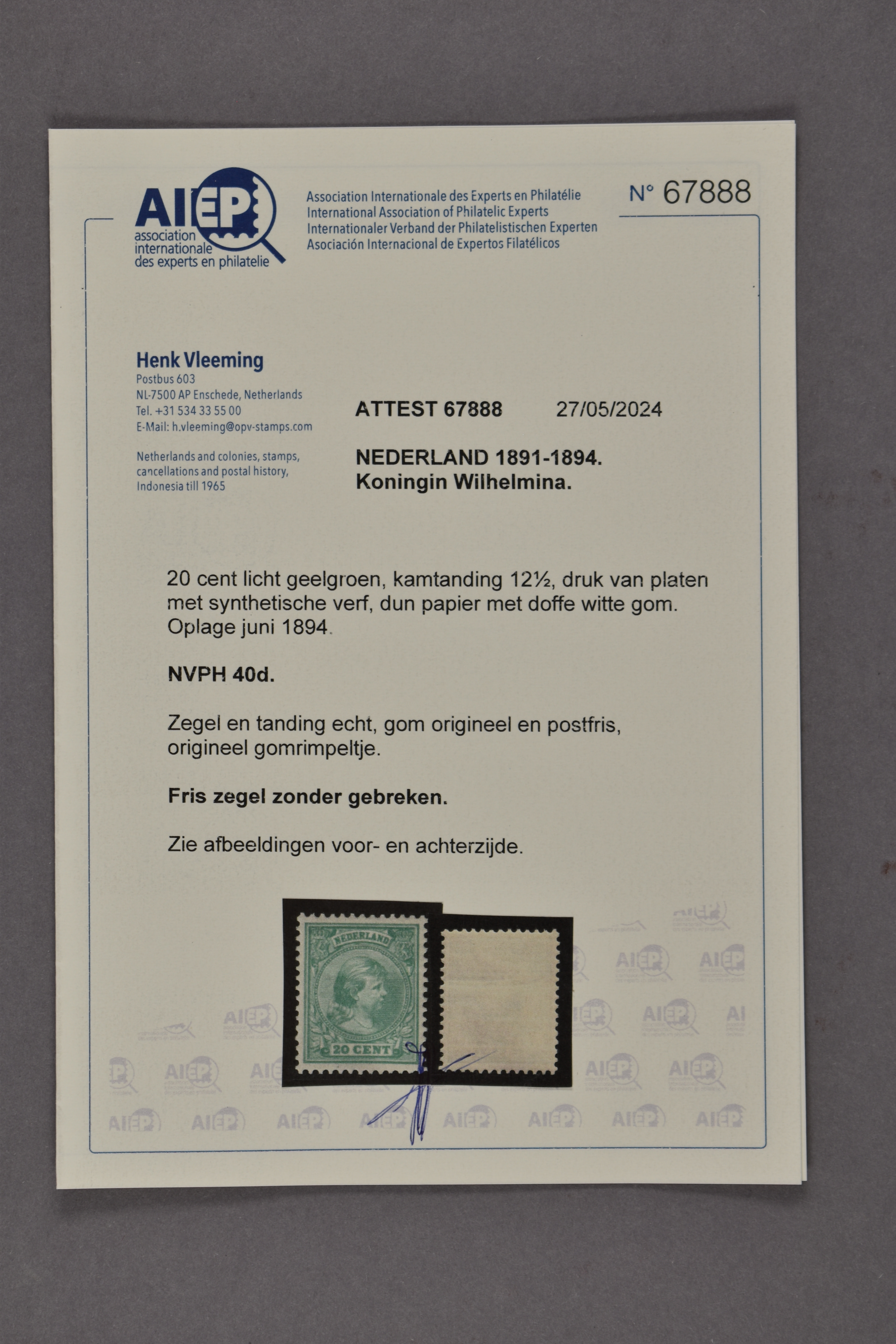40d, 20 cent geelgroen, postfris prachtex. met certificaat Vleeming (2024) € 675 (Image) (Image2)