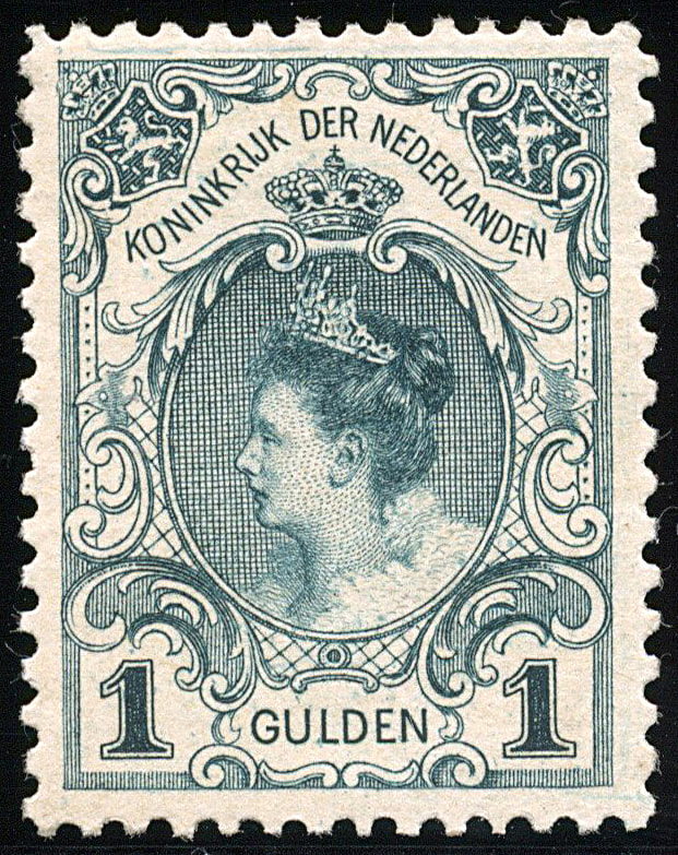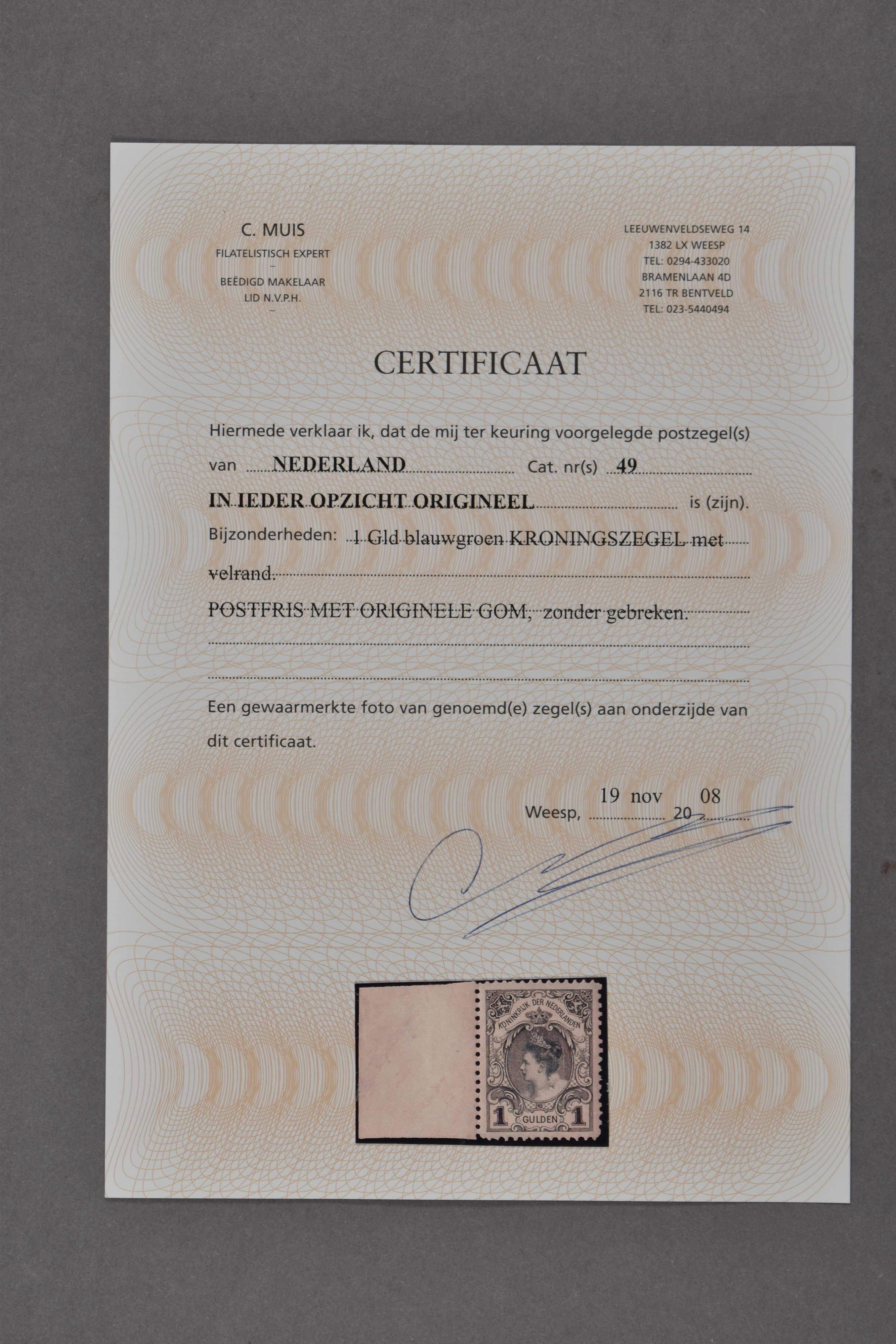 49, 1 gulden blauwgroen, zgn. Kroningsgulden, postfris prachtex. met linker velrand en certificaat Muis (2008) € 1500 (Image) (Image2)
