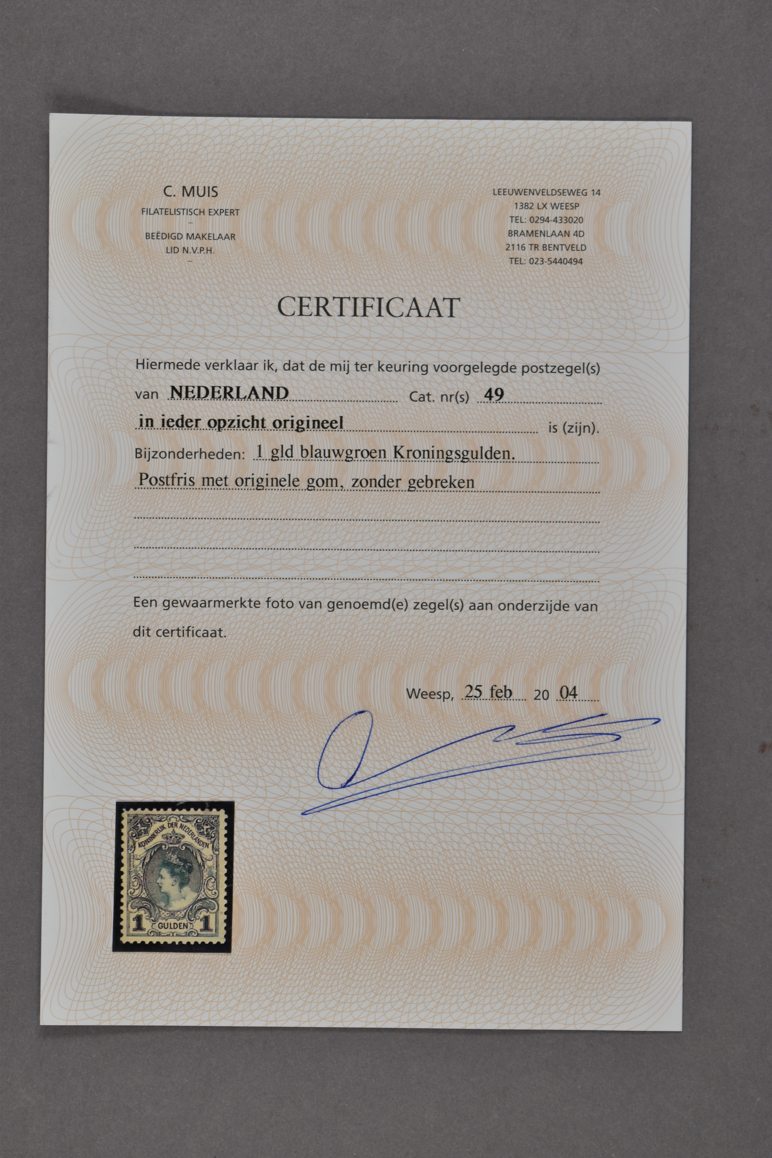 49, 1 gulden blauwgroen, zgn. Kroningsgulden, postfris prachtex. met certificaat Muis (2004) € 1500 (Image) (Image2)