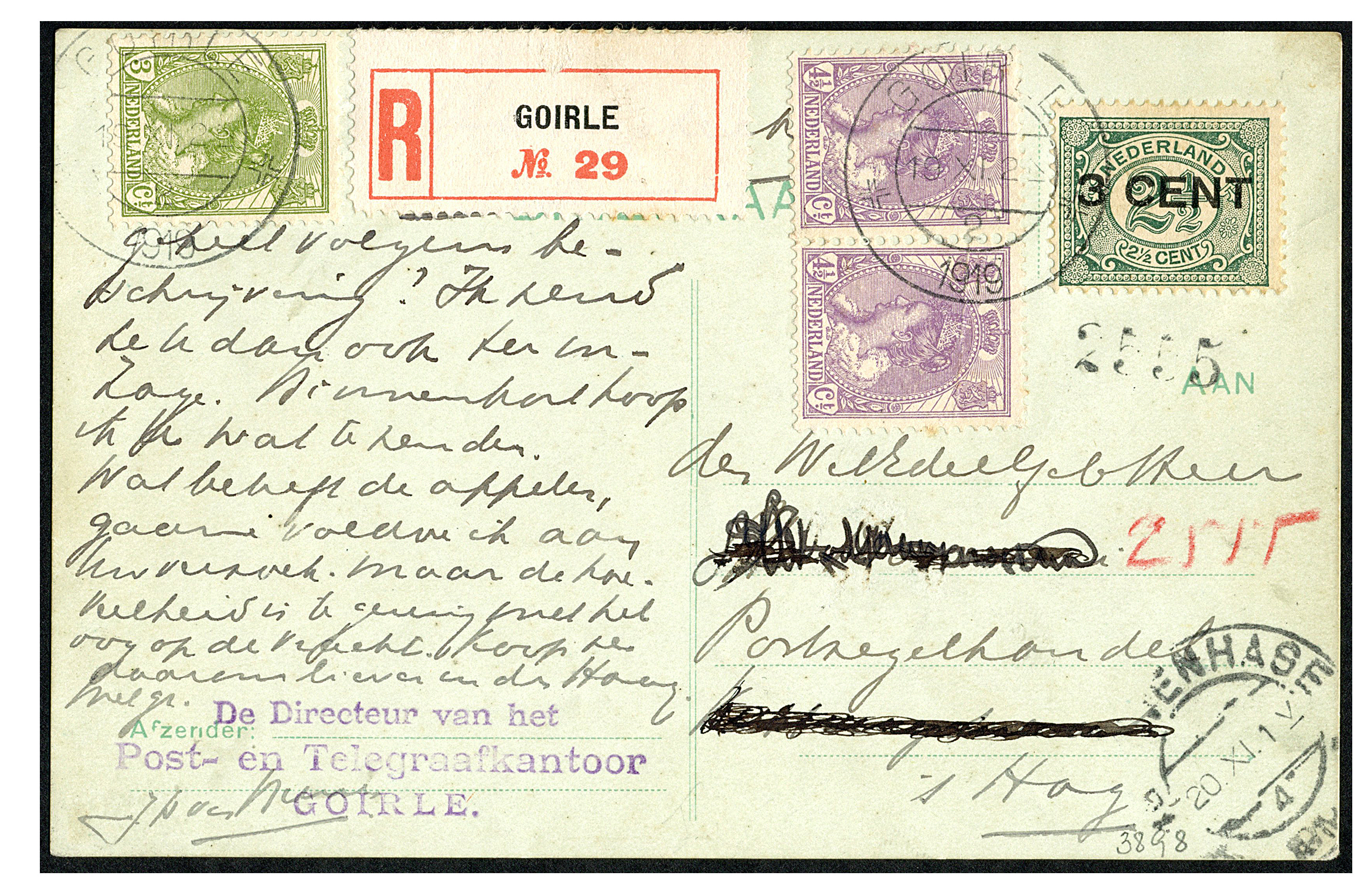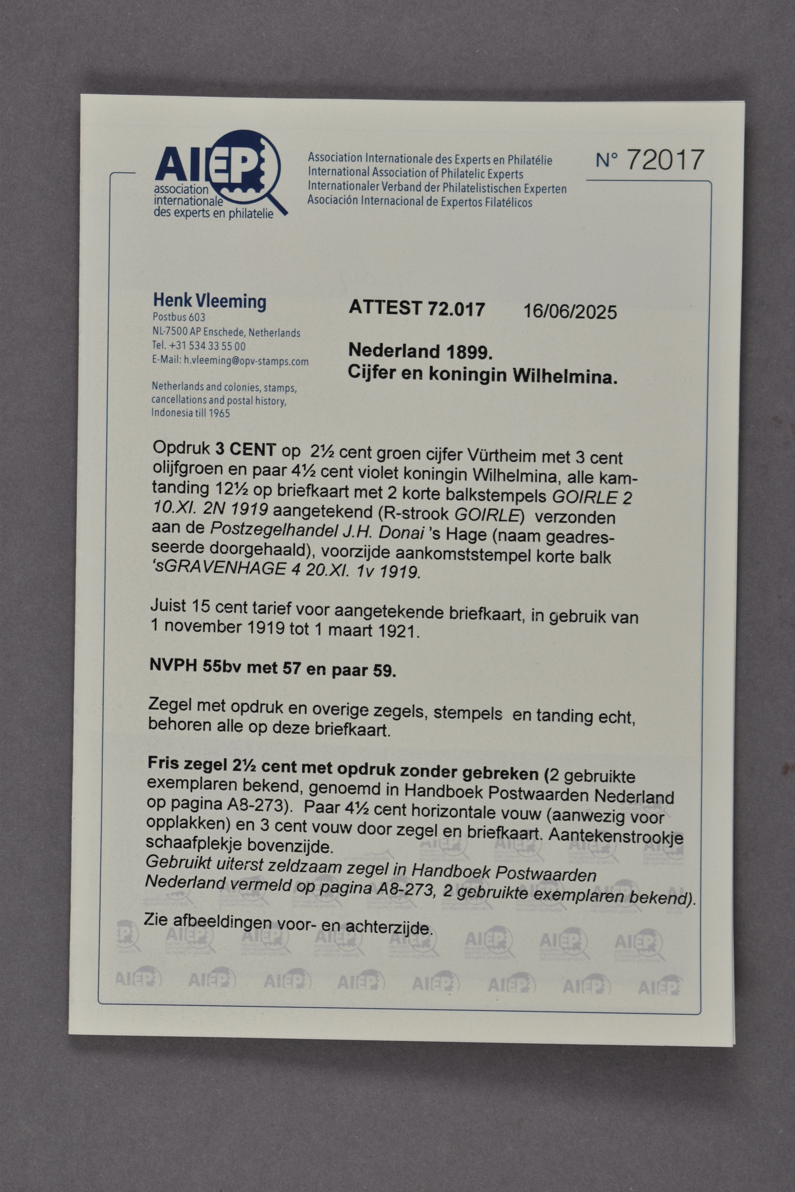 55vb, opdruk 3 CENT op 2½ cent groen type Vürtheim in combinatie met nrs. 57 en 59(2) op briefkaart van Goirle 10.XI.1919 naar 's-Gravenhage. Uiterst zeldzaam prachtex. (2 gebruikte exemplaren bekend) met uitgebreid certificaat Vleeming