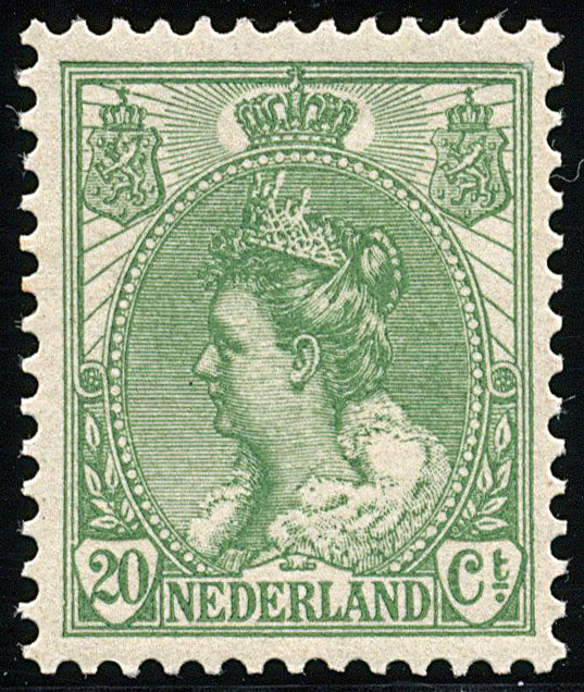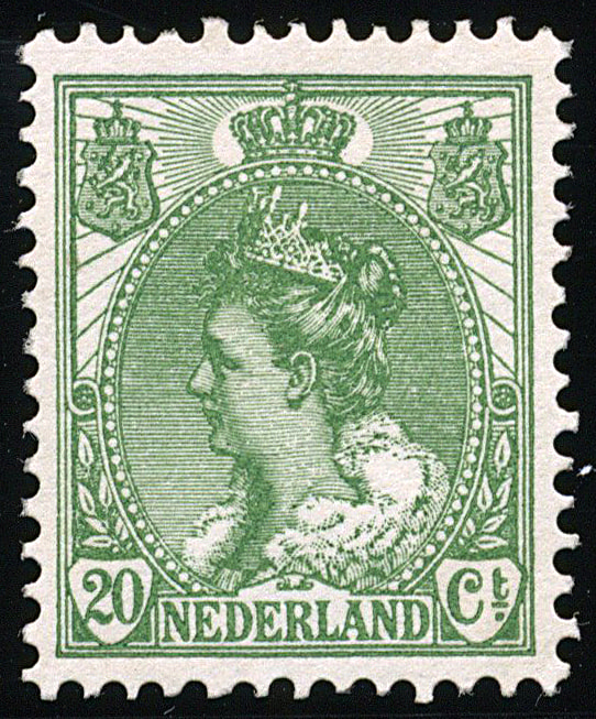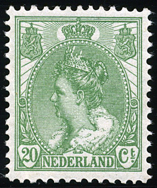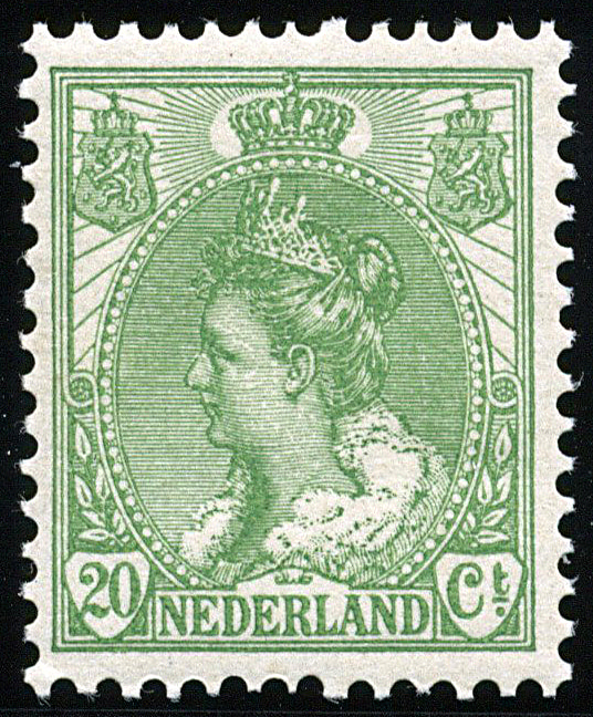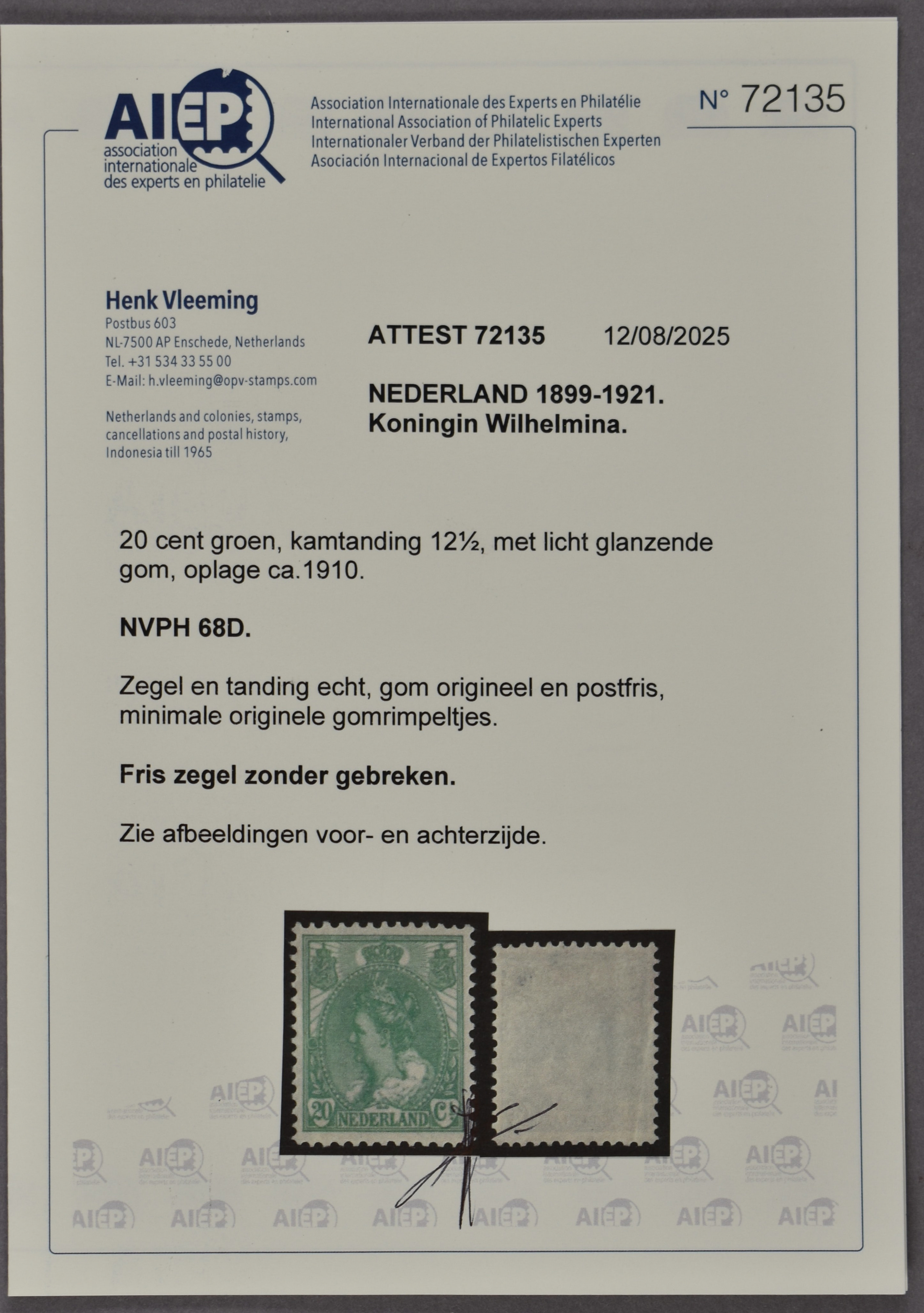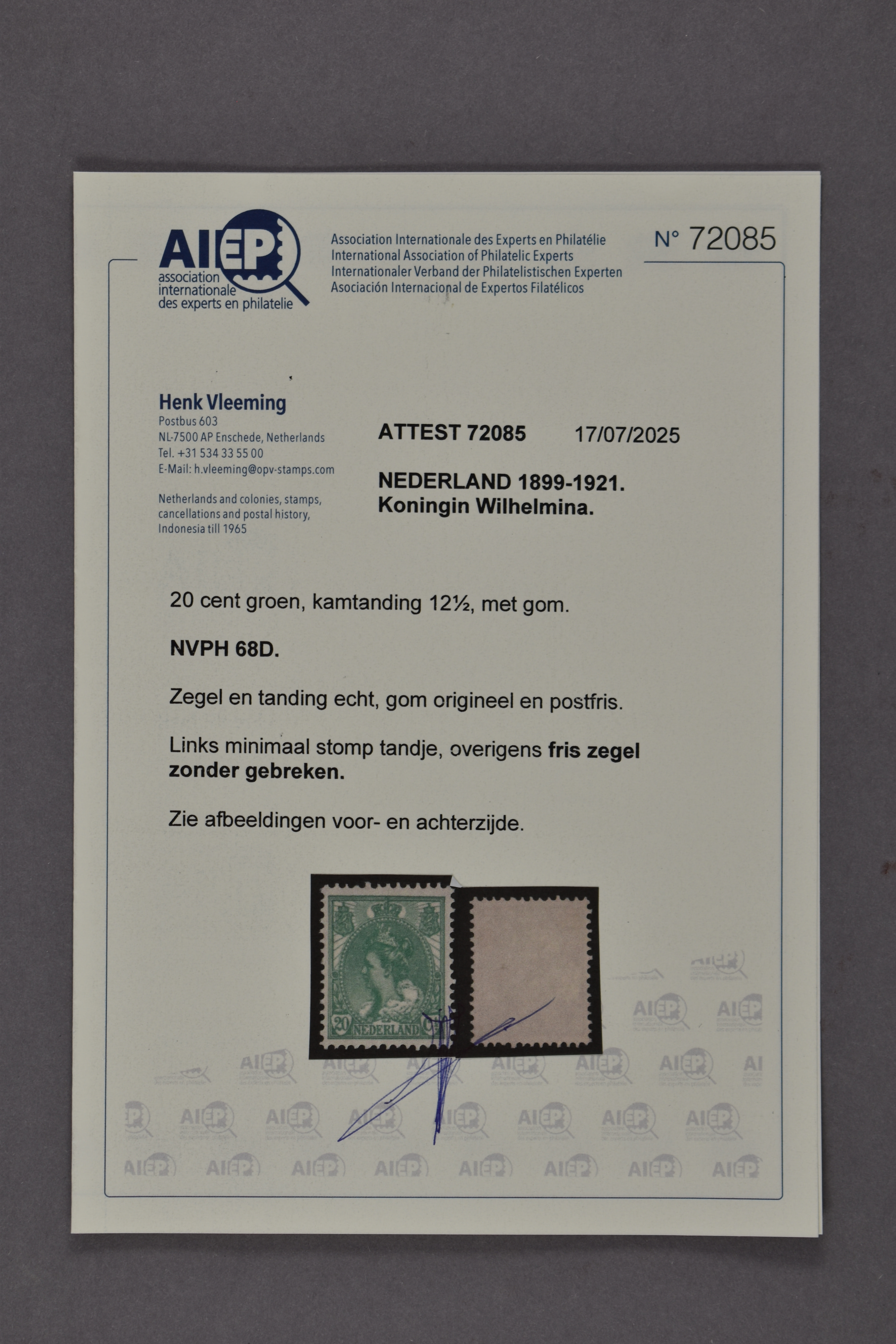 68, 20 cent groen, postfris, vrijwel prachtex. met certificaat Vleeming (2025): "...links minimaal stomp tandje...", € 1600 (Image) (Image2)