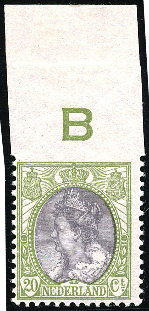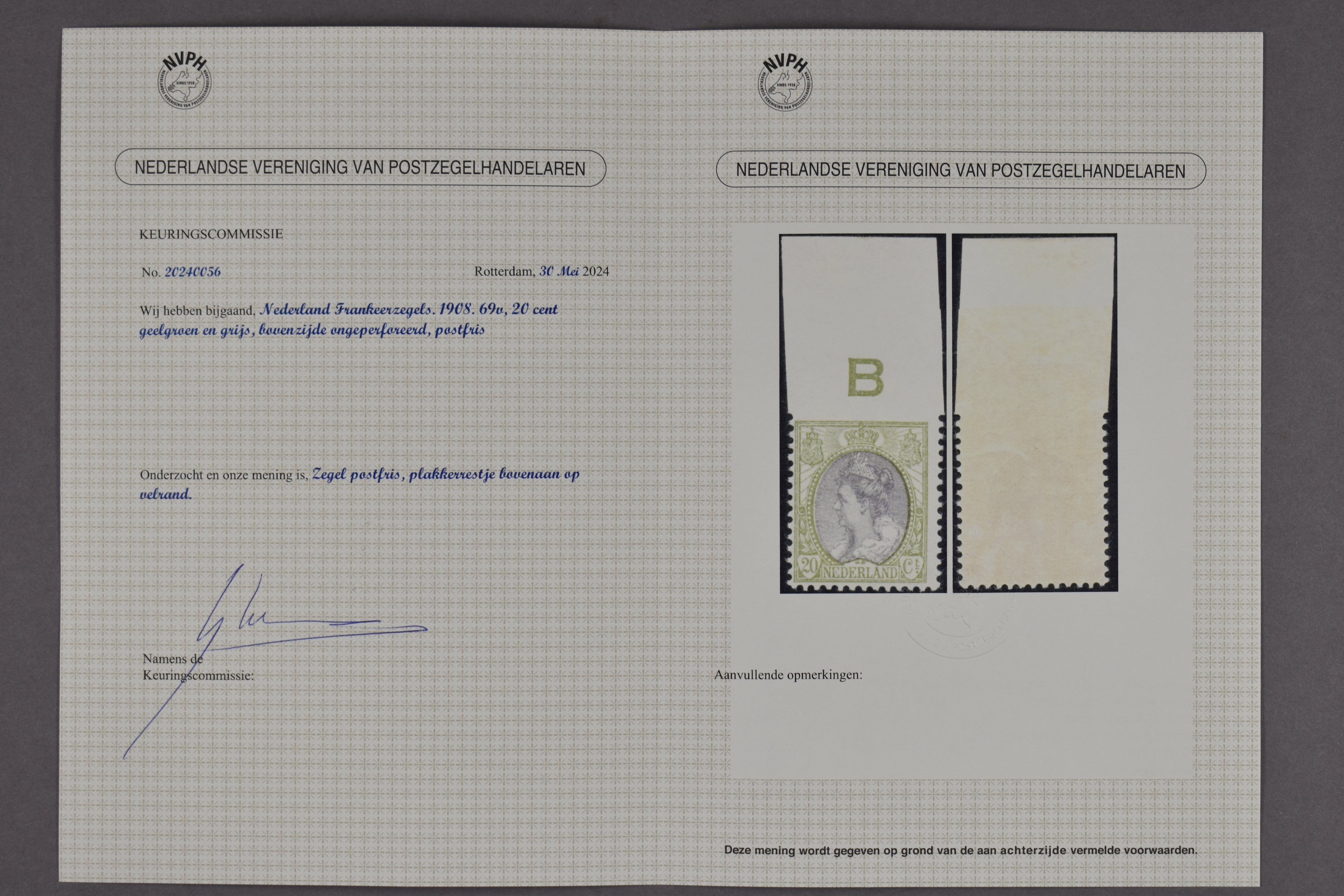 69v, 20 cent geelgroen en grijs met variëteit: "bovenzijde ongeperforeerd", postfris, met klein plakkerrestje aan de bovenzijde van de velrand. Certificaat NVPH (2024) € 2000 (Image) (Image2)