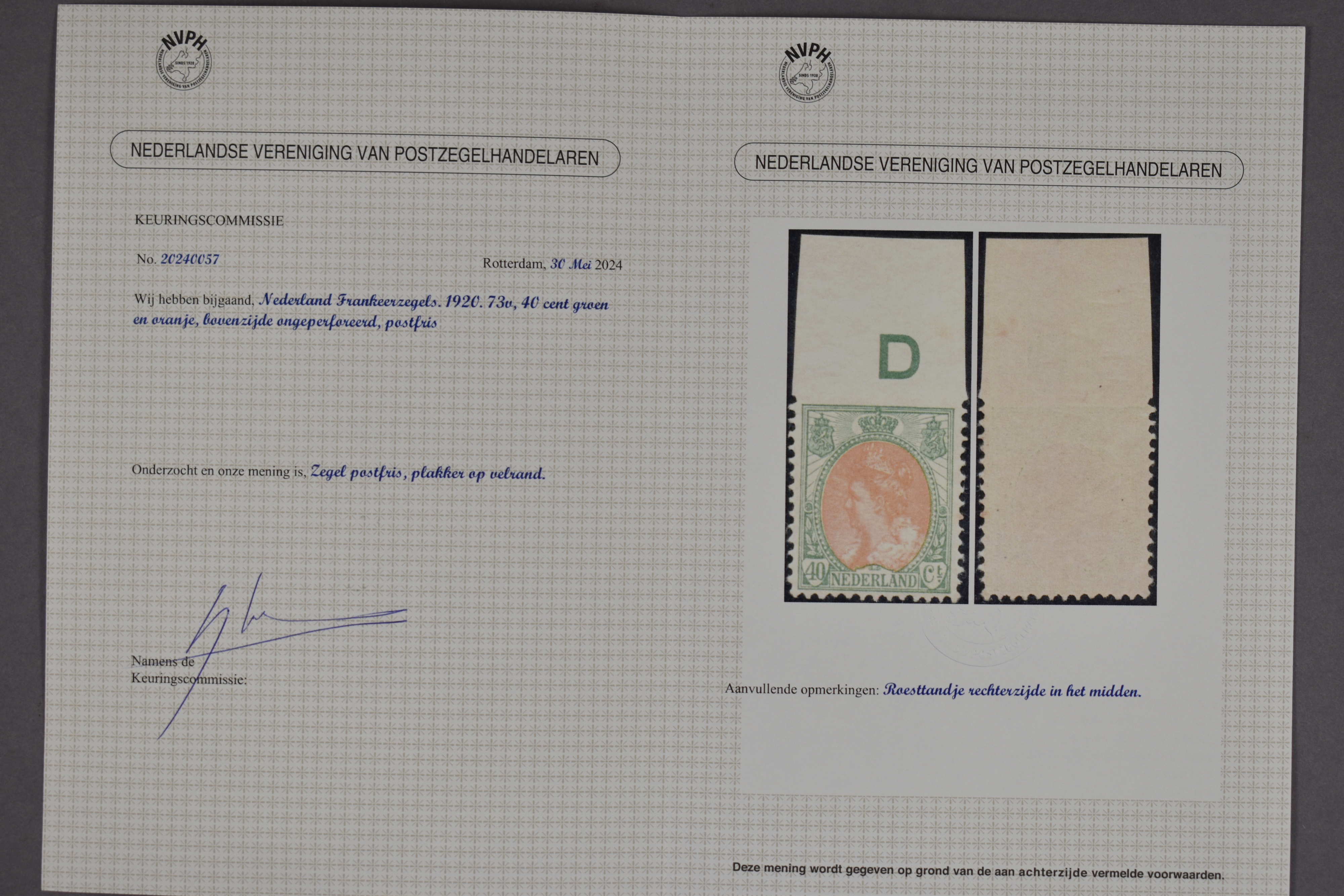 73v, 40 cent groen en oranje met variëteit: "bovenzijde ongeperforeerd", postfris prachtex. met minimaal roestpuntje en klein plakkerrestje aan de bovenzijde van de velrand. Certificaat NVPH € 6000 (Image) (Image2)