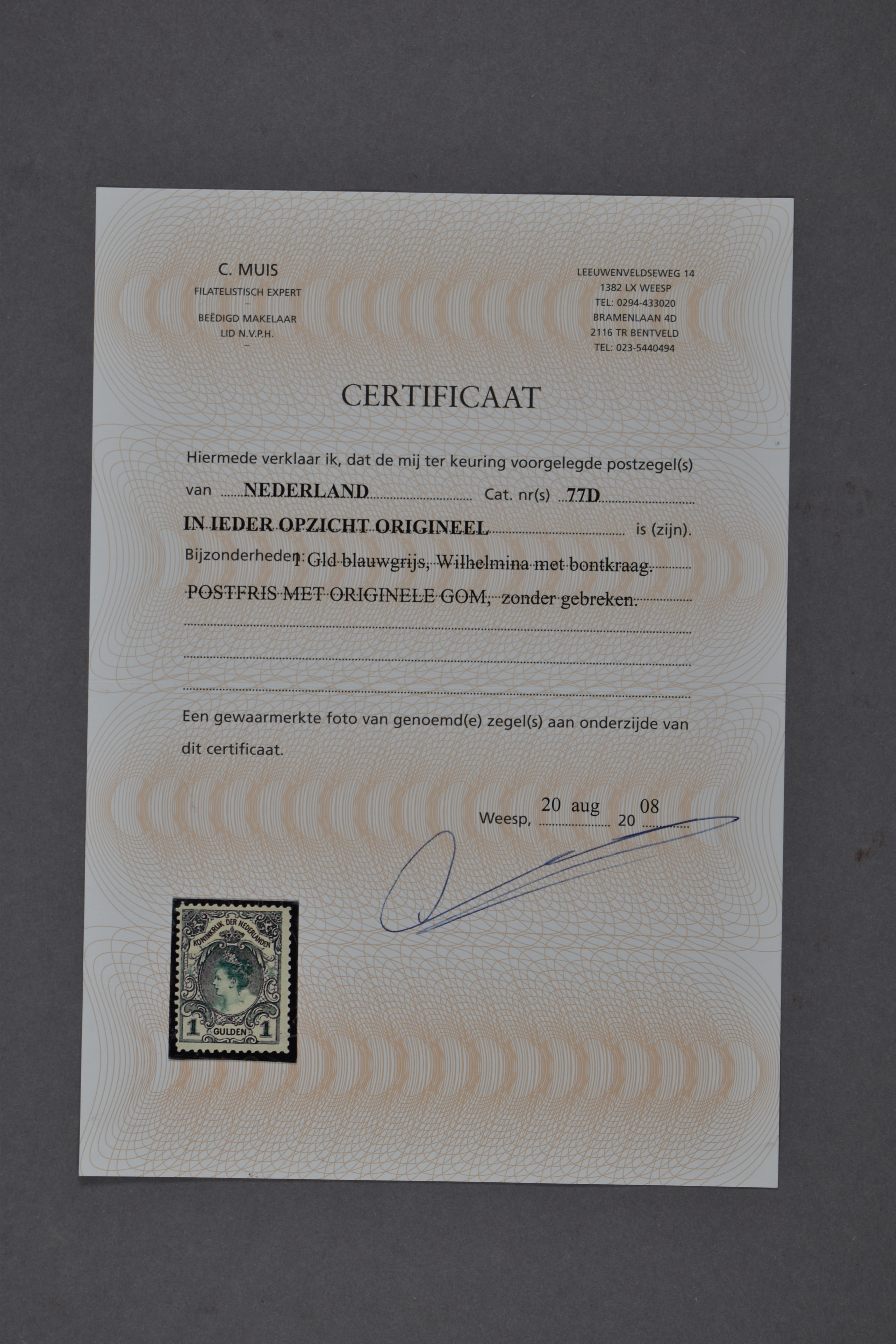 77D, 1 gulden blauwgroen, Lt. 11½, postfris prachtex. met certificaat Muis (2008) € 550 (Image) (Image2)