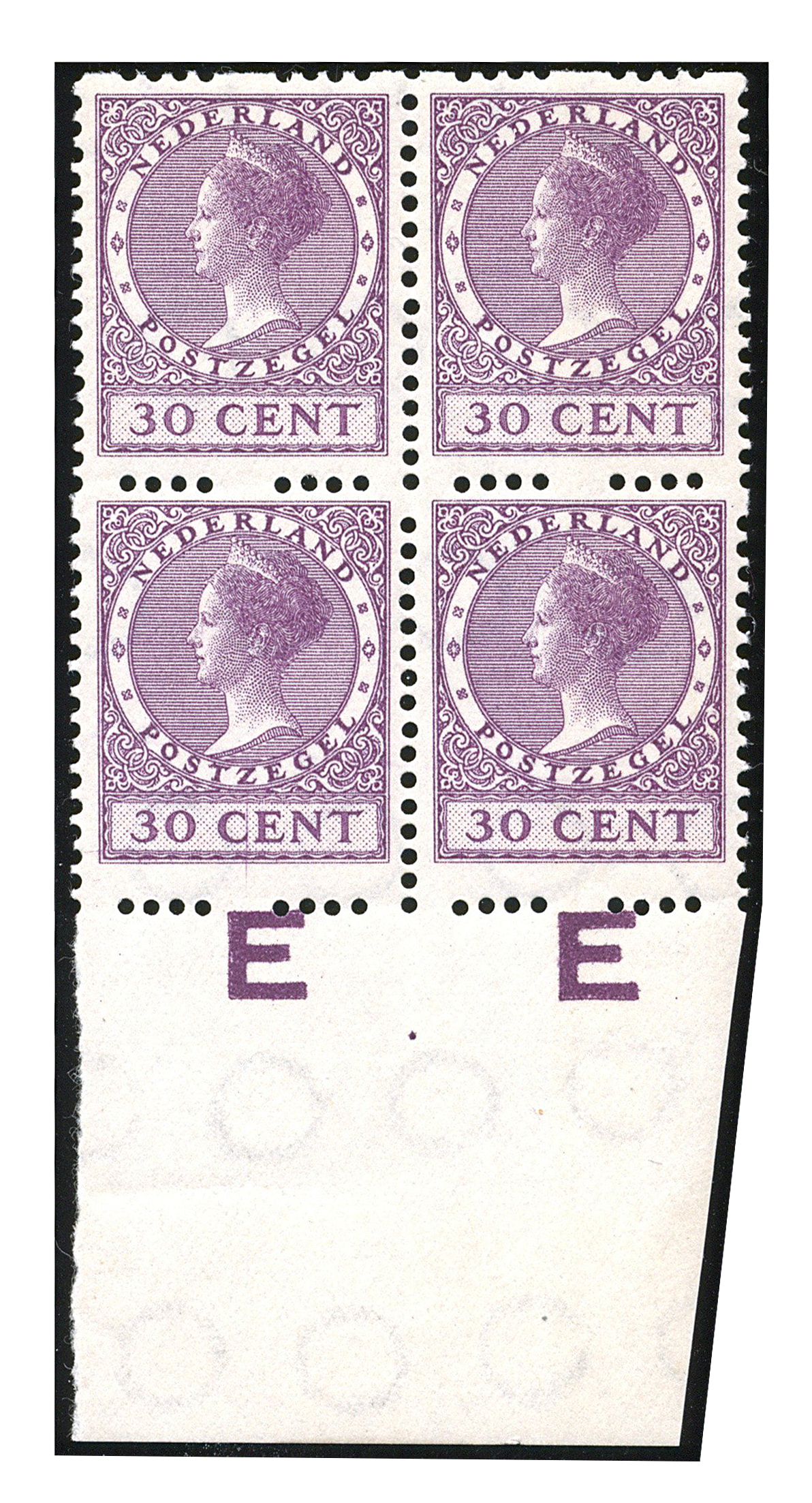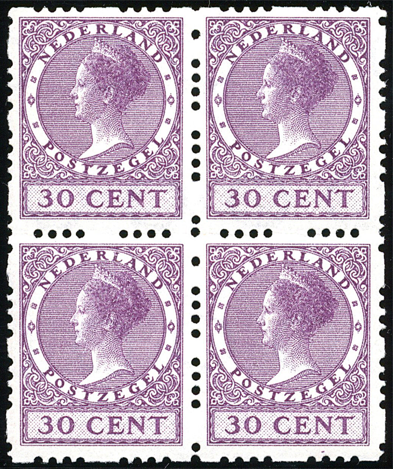 29a, 30 cent donkerlila, tweezijdige roltanding met watermerk, met afwijkende tanding links- en rechtsboven in het onderste paar van het postfrisse prachtblok. Tevens niet gecatalogiseerde plaatfout: "verticale lila kras aan de C van