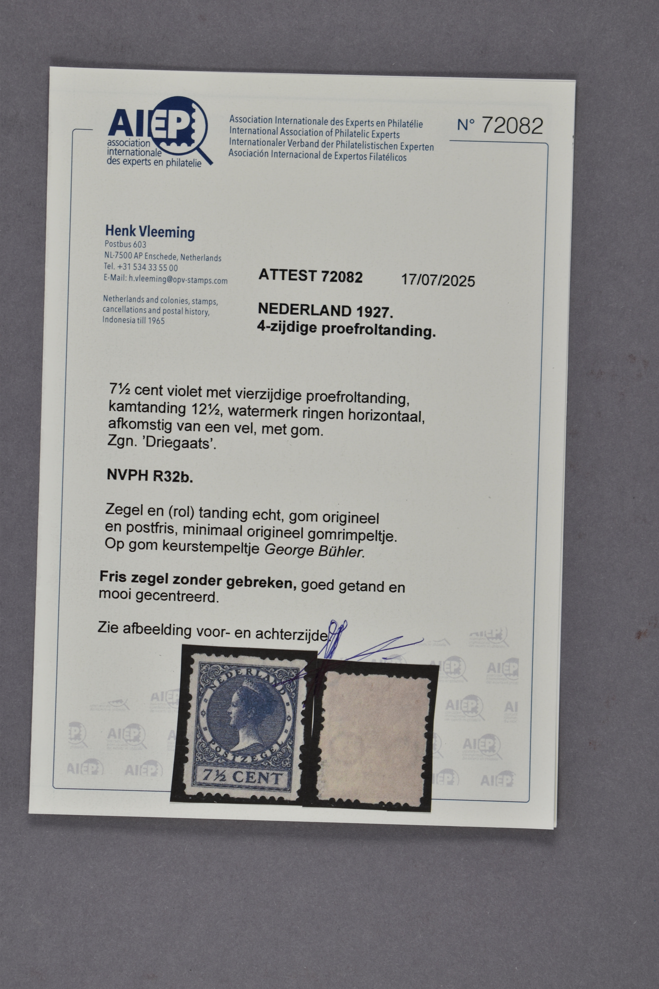 R32b, 7½ cent violet, zgn. Driegaatsroltanding, perfect gecentreerd, postfris prachtex. met licht keurstempeltje Bühler en certificaat Vleeming (2025) € 11.000