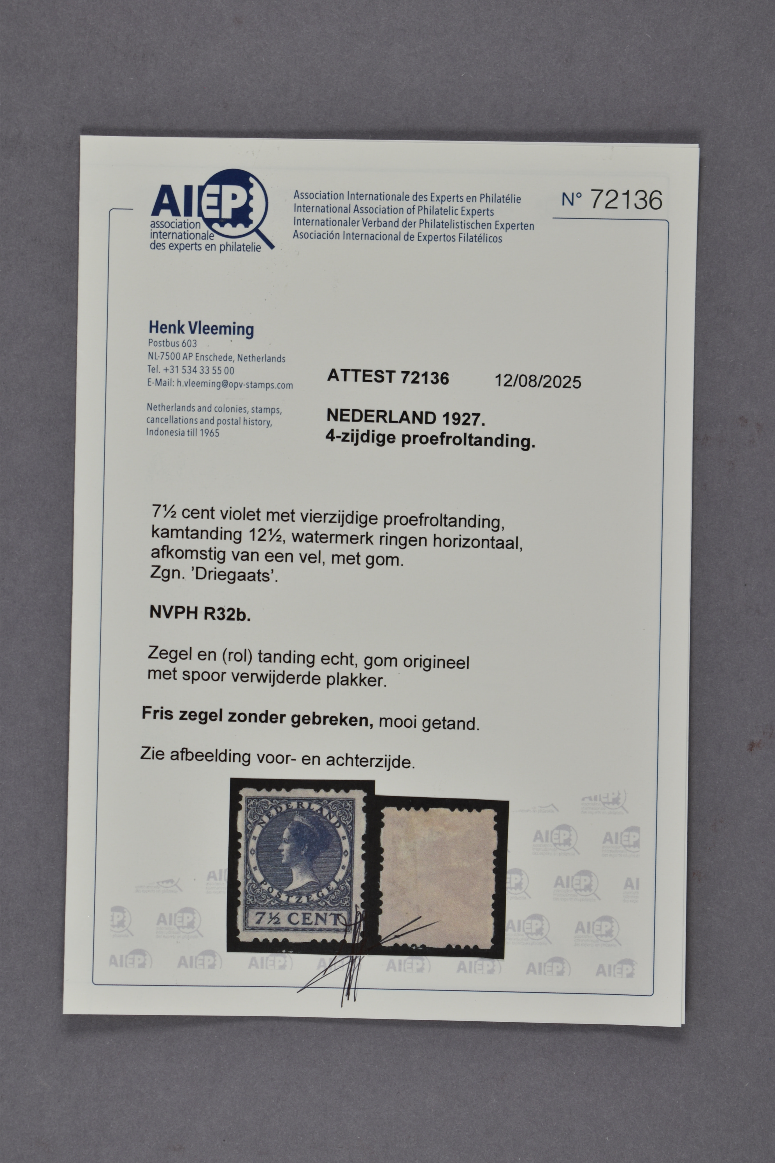 R32b, 7½ cent violet, zgn. Driegaatsroltanding, afkomstig van een vel, ongebruikt prachtex. met certificaat Vleeming (2025) € 5000 (Image) (Image2)