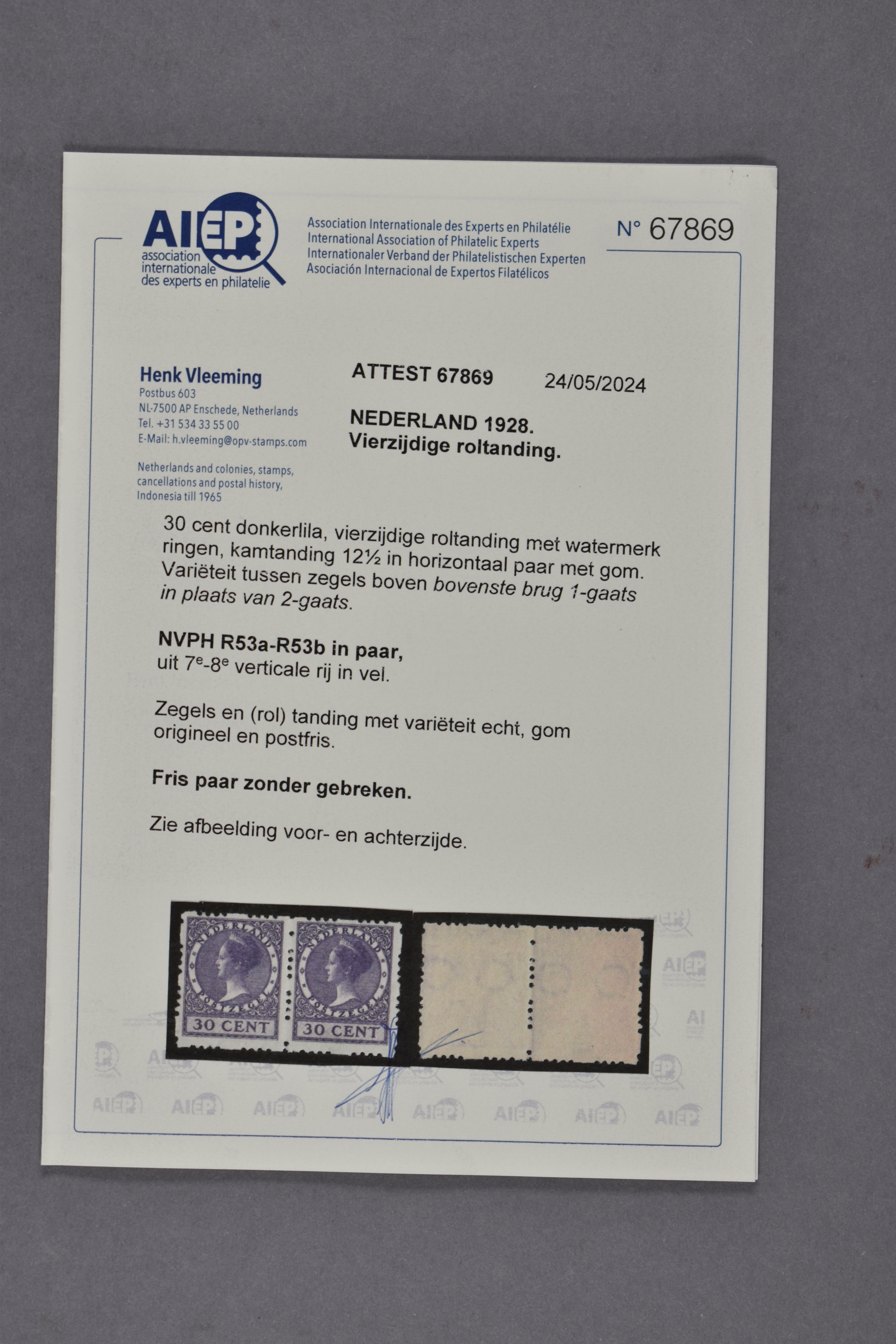 R53a-R53b, 30 cent donkerlila, vierzijdige roltanding in horizontaal paar met afwijkende tanding, postfris prachtpaar met certificaat Vleeming (2024) € 650+