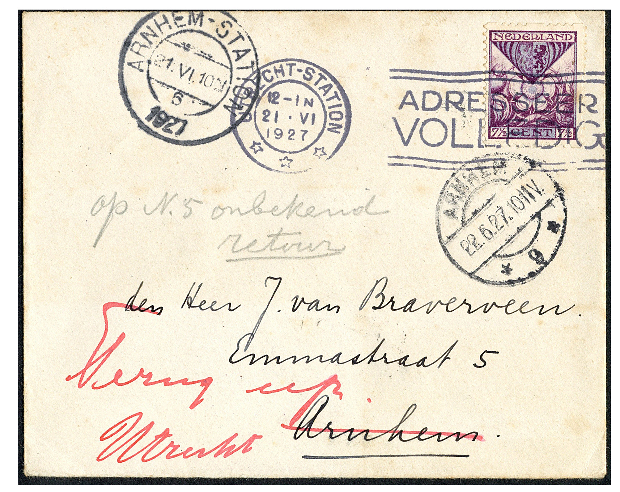 R72, 7½ Cent Kind 1925 als enkelfrankering op couvert van Utrecht-Station 21-6-1927 naar Arnhem-Station 21-6, geadresseerde onbekend op dat adres, op 22-6 retour, met op az. postale pennotitie in rood en stempel 'Adresseer volledig, /