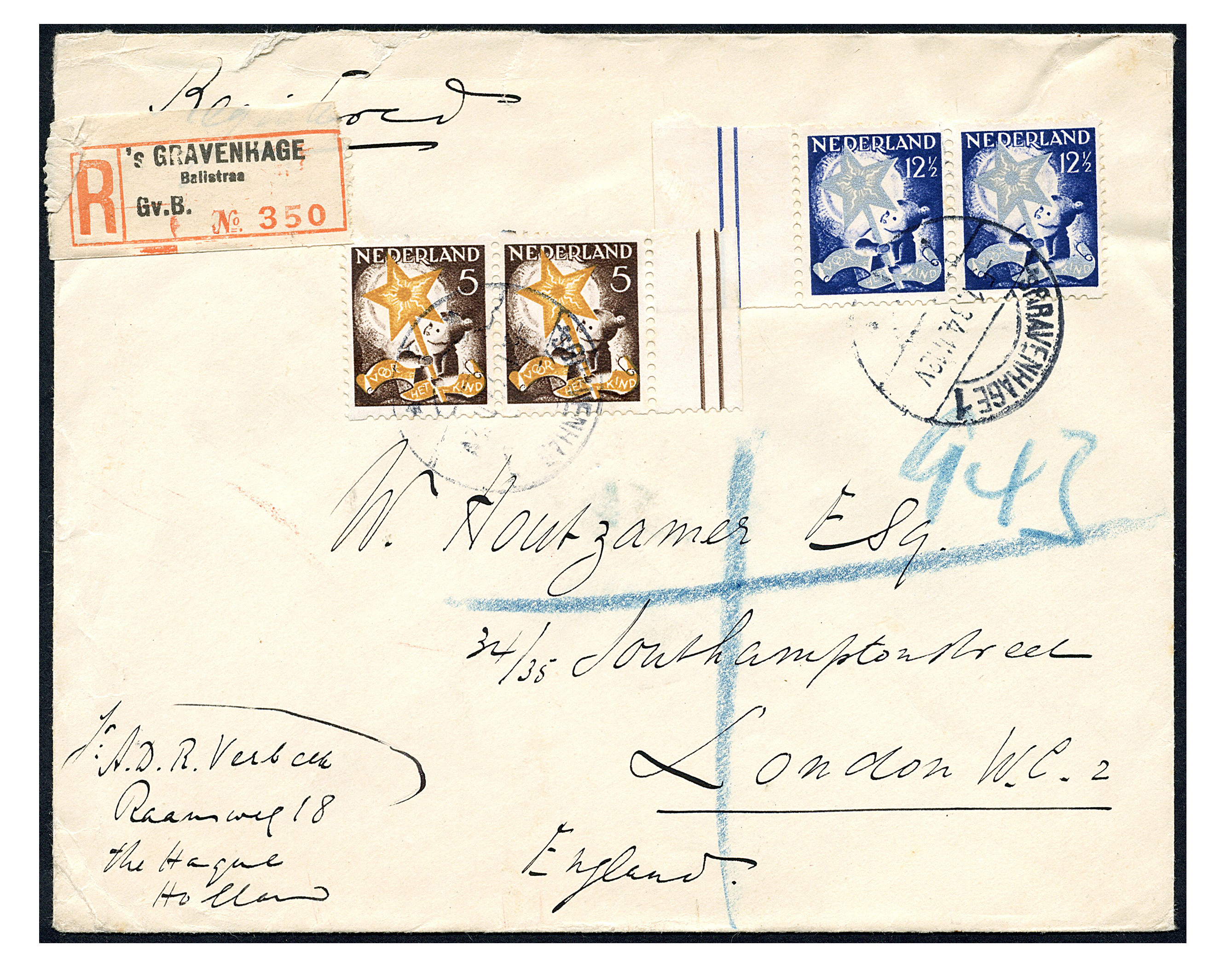 R99 en R101, 5 Cent resp. 12½ cent Kind 1933 in randparen op envelop van 'sGravenhage 1 5-1-1934 aangetekend naar Londen. R-strookje met de naam van het bijpostkantoor 'Balistraa' met ontbrekende 't' (Image)