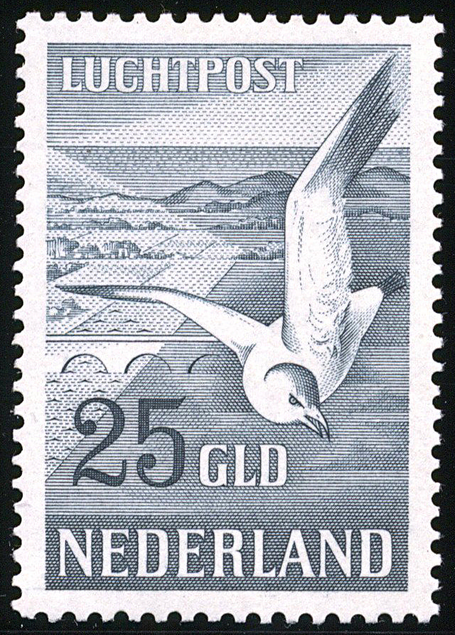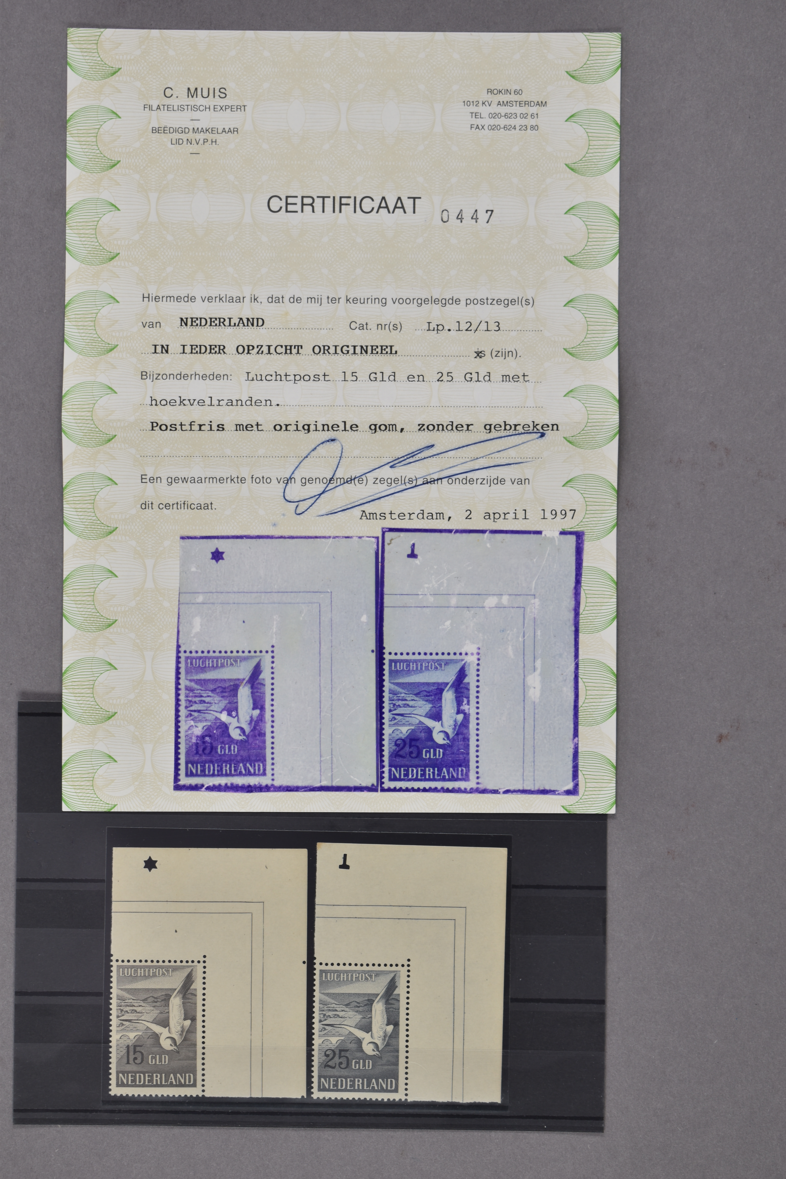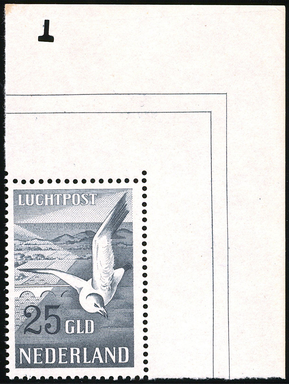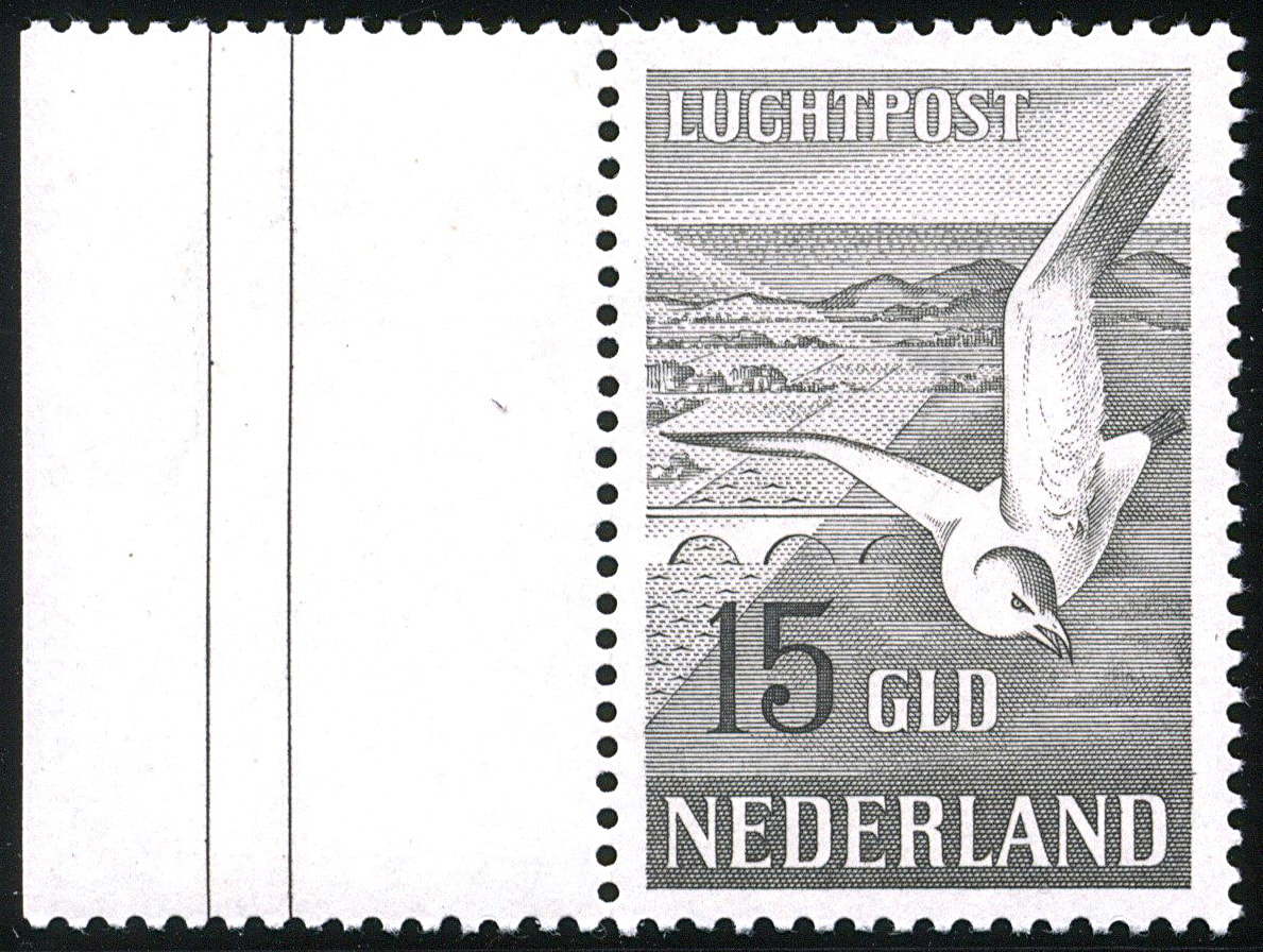 1296 nh imageLP12/13, 15 en 25 gulden Zeemeeuw als prachtige, postfrisse exemplaren met hoekvelranden waarin kniptekens, de 15 gulden heeft in de rechter velrand rechts perforatiegaten. Cert. Muis (1997). € 600+ (Image) (Image2)