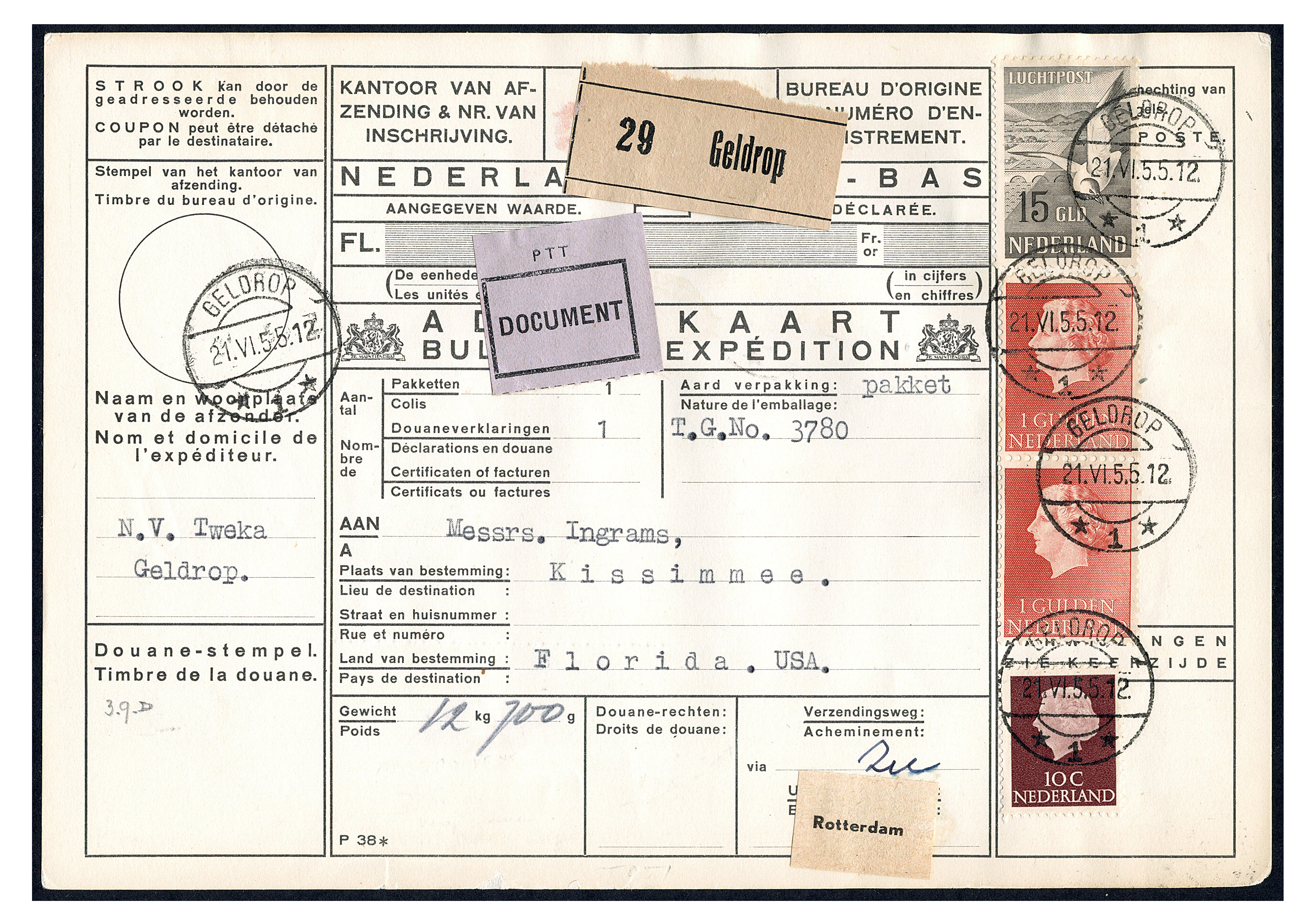 1292 on cover imageLP12, 15 gulden Zeemeeuw, 10 cent en 1 gulden in paar op een zeer frisse, complete adreskaart zonder vouwen voor een postpakket van 12.700 gram van Geldrop 21-6-1855 (21.VI.5.5.12.) via Rotterdam per luchtpost naar Florida (Image)