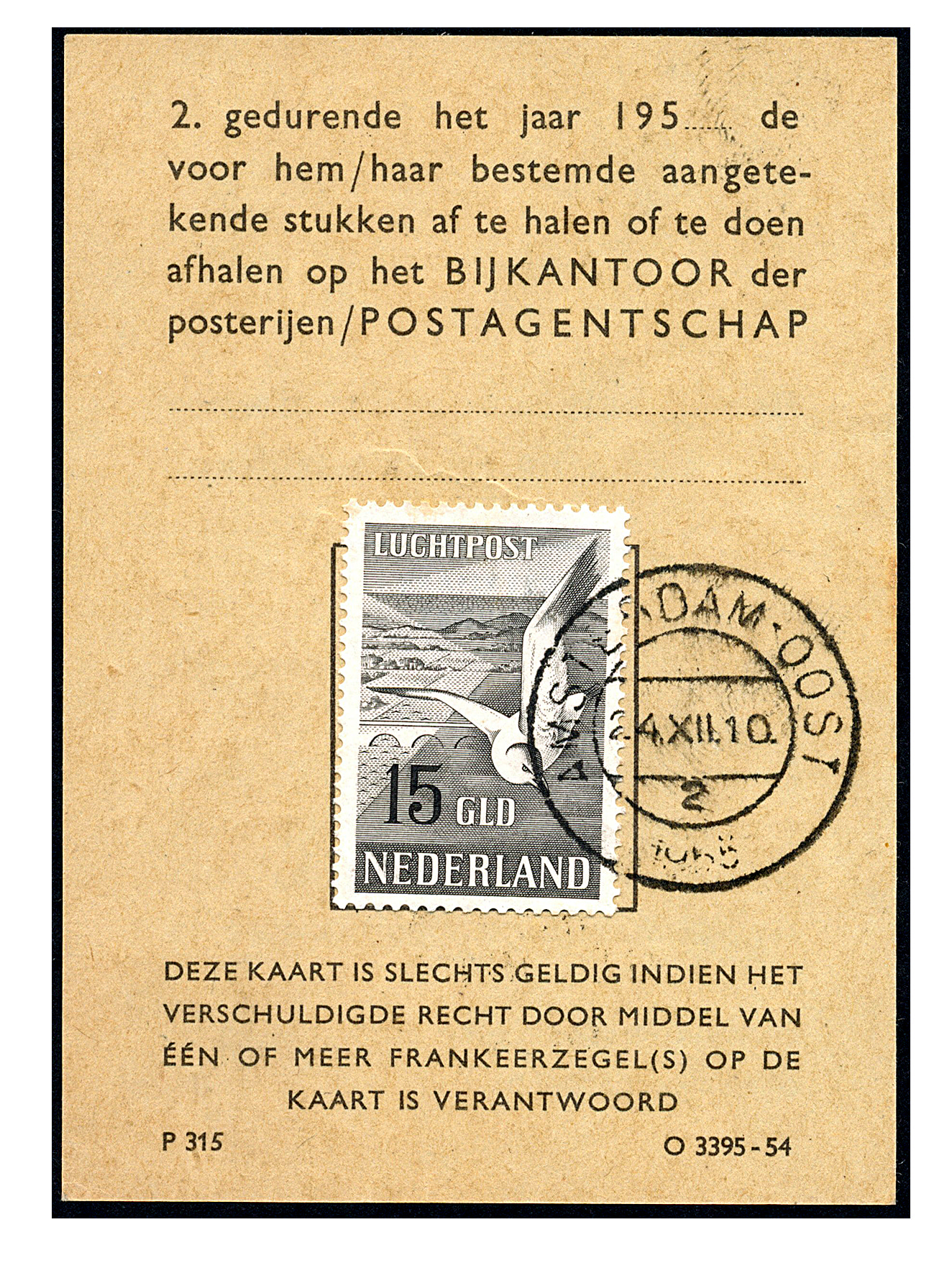 1294 on cover imageLP12, 15 gulden Zeemeeuw tegen de voorschriften gebruikt op een postbuskaartje voor het voldoen van het busrecht voor het 2e, 3e en 4e kwartaal van 1956 op het postkantoor Amsterdam-Oost, afgestempeld 24-12-1955. Busrecht was 500 cent per kwartaal voor de postkantoren in de 8 grootste steden (zie: HPN TAR-C-35, Tarieflijst C44). Zeer zeldzaam poststuk! Zie: HPN D6-10, afb. 14 (Image)