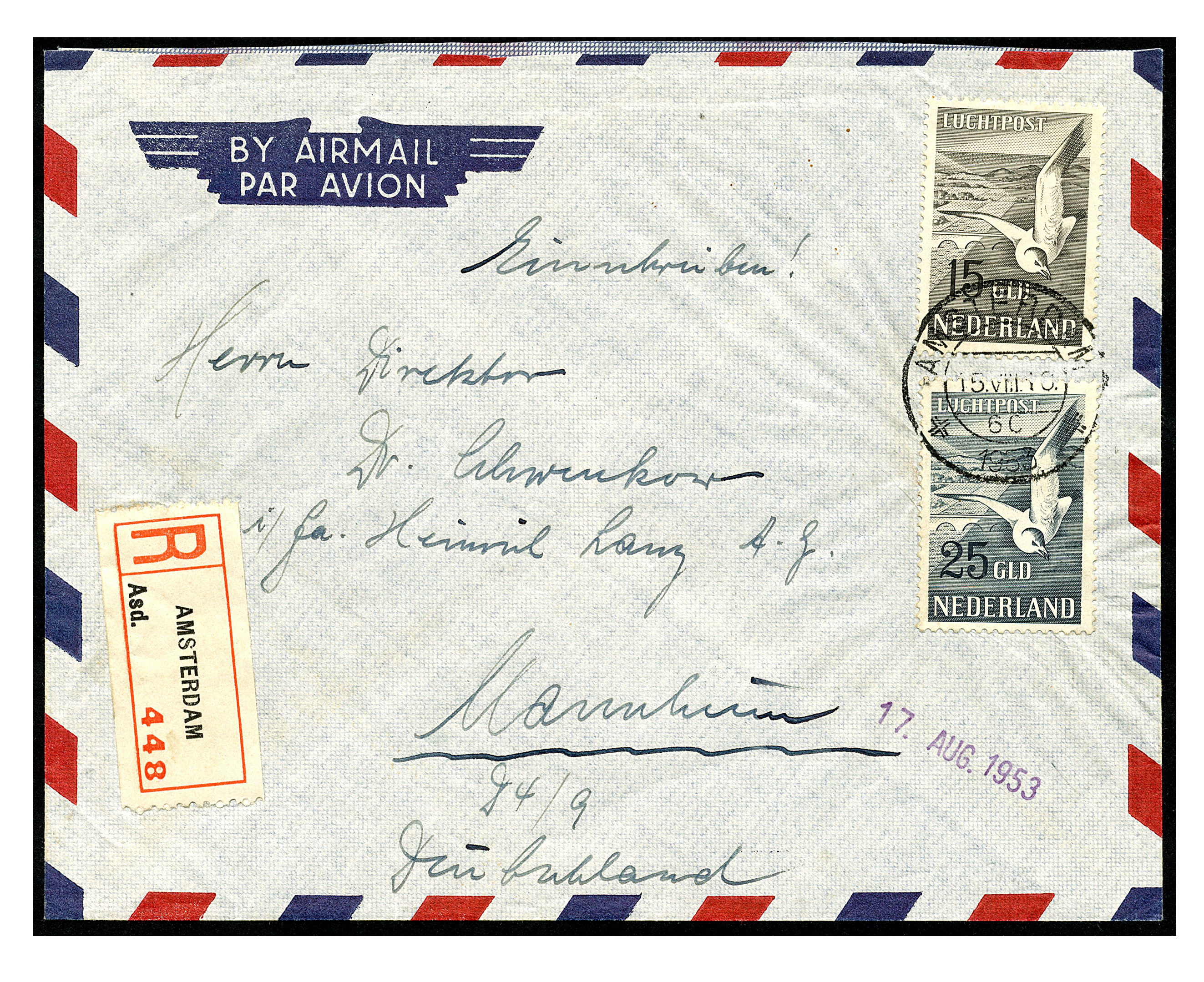 1295 on cover imageLP12/13, 15 en 25 gulden Vliegende Meeuw, prachtex. op luchtpostenvelop van Amsterdam 15-8-1953 aangetekend per luchtpost naar Mannheim 16-8-1853. Verzamelaarspost, maar als serie zeldzaam op poststuk! (Image)
