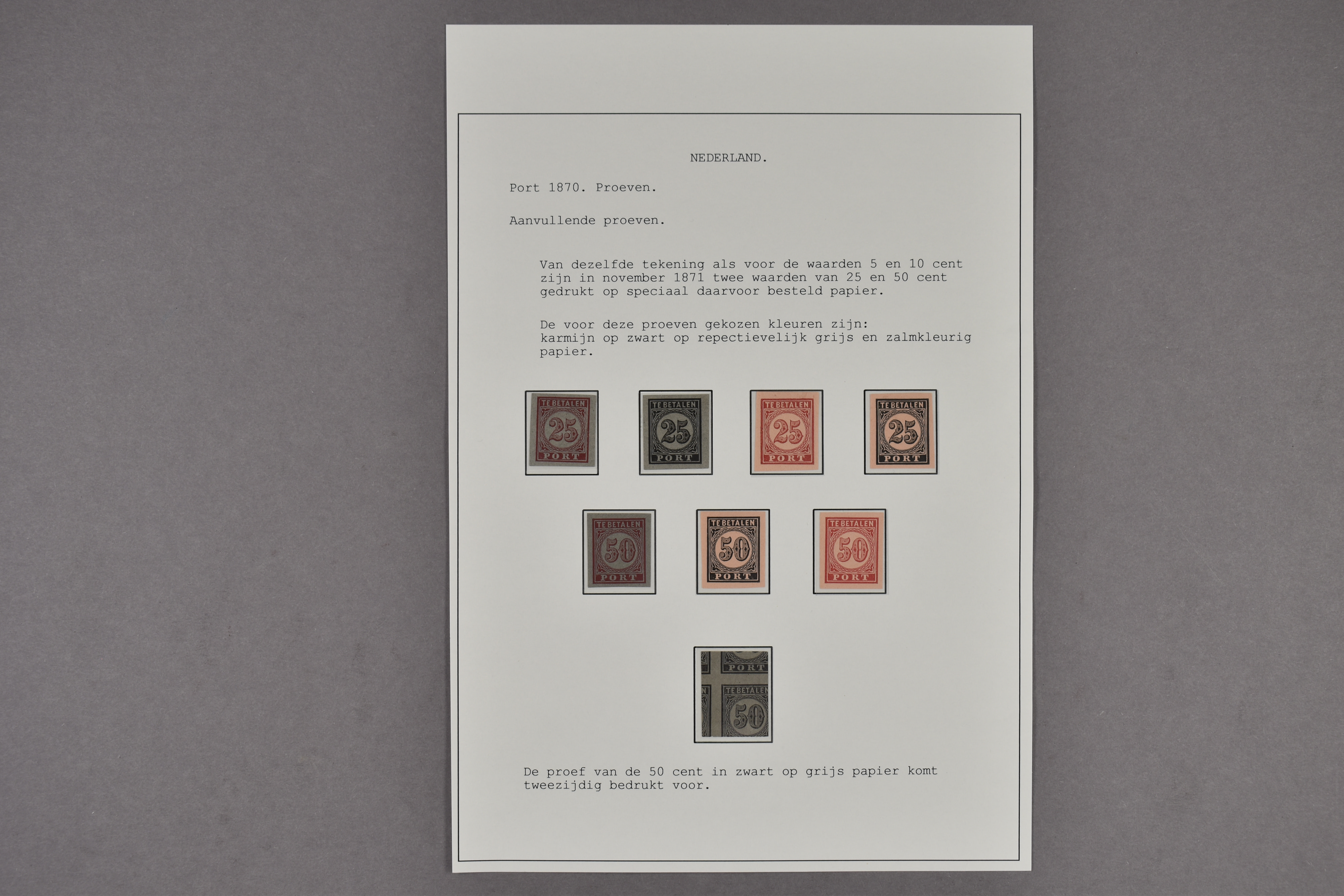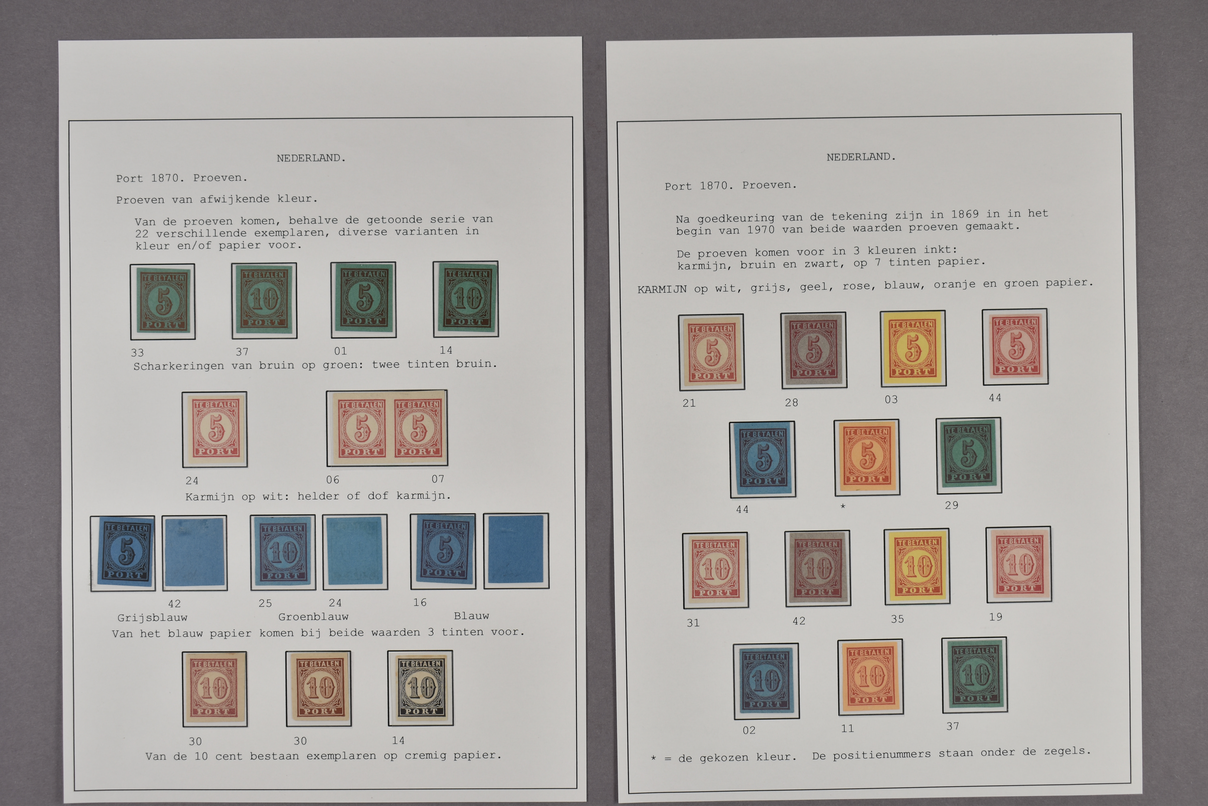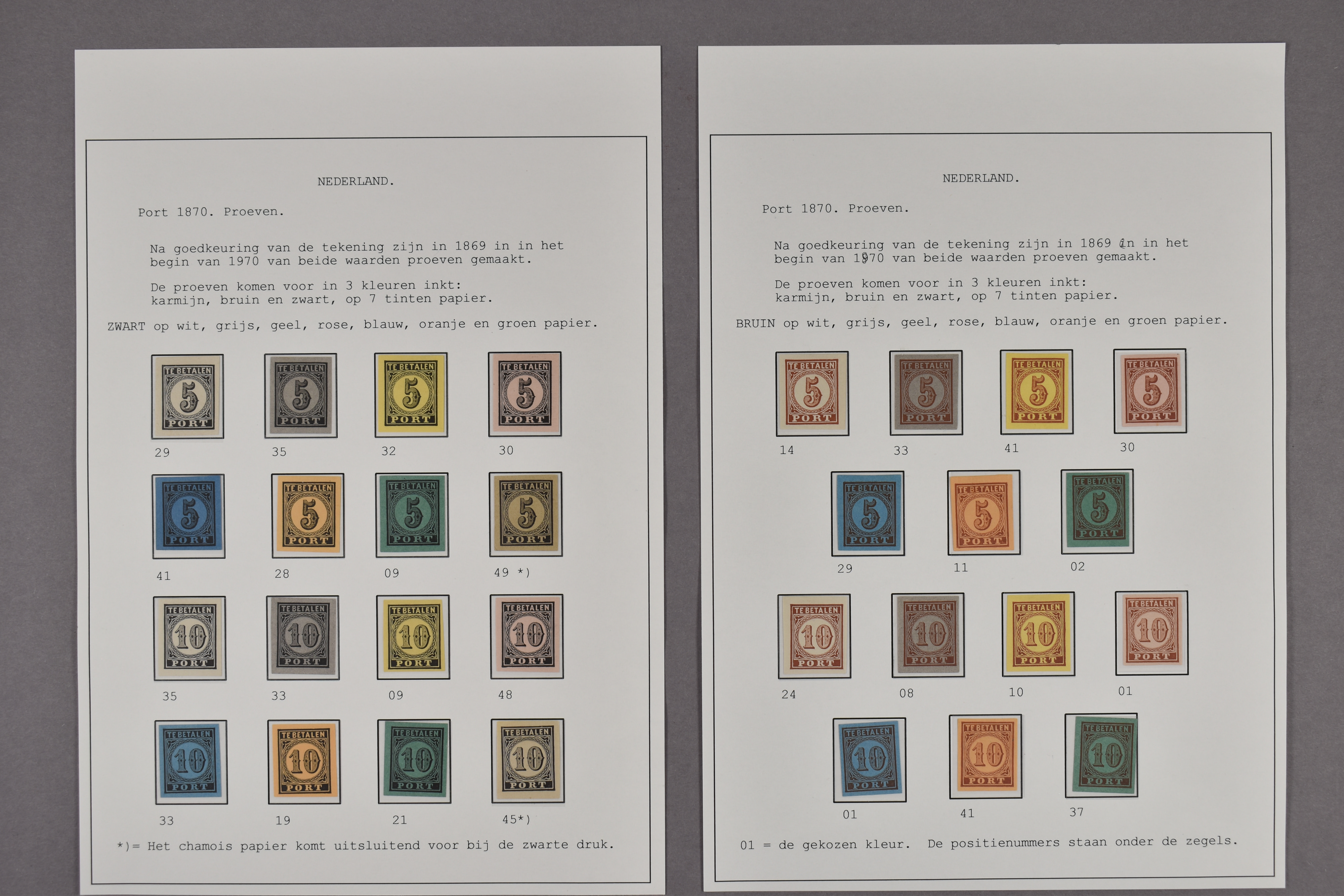 1299 (og) image1870, Ongetande, ongegomde kleurproeven van de 5 cent PCP3a t/m v en PCP4a t/m v, PcP5(4) en PCP6(3), PCP6a tweezijdig bedrukt, alsmede een 15-tal proeven in afwijkende kleuren. Prachtkoop voor de specialist! (Image) (Image2) (Image3) (Image4)