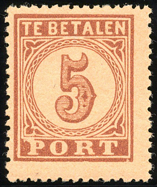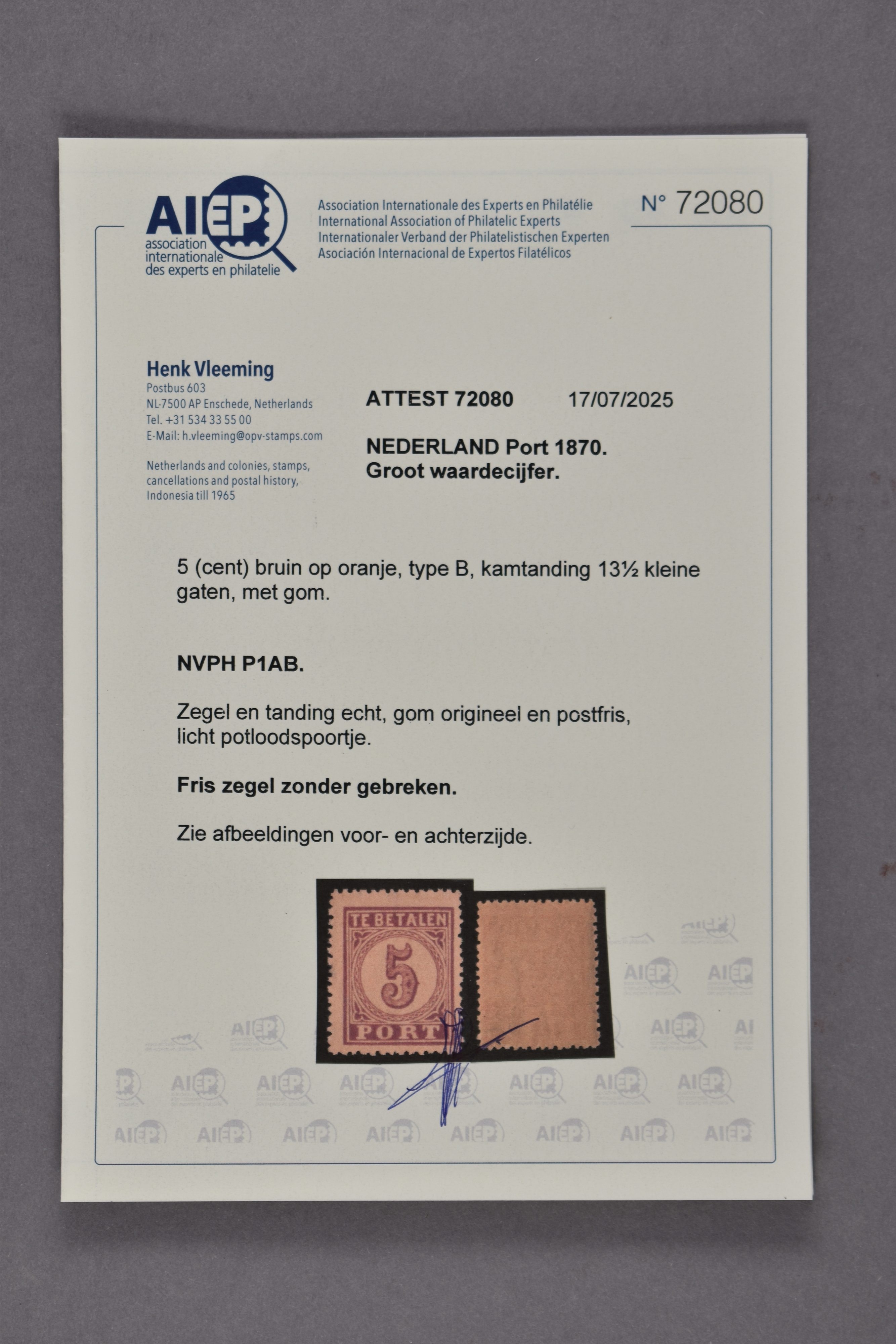 1300 nh imageP1AB, 5 cent bruin op oranje, Kt. 13½ kl.g., postfris prachtex. met variëteit: "vlekje boven P van Port", met certificaat Vleeming (2025) € 750+ (Image)
