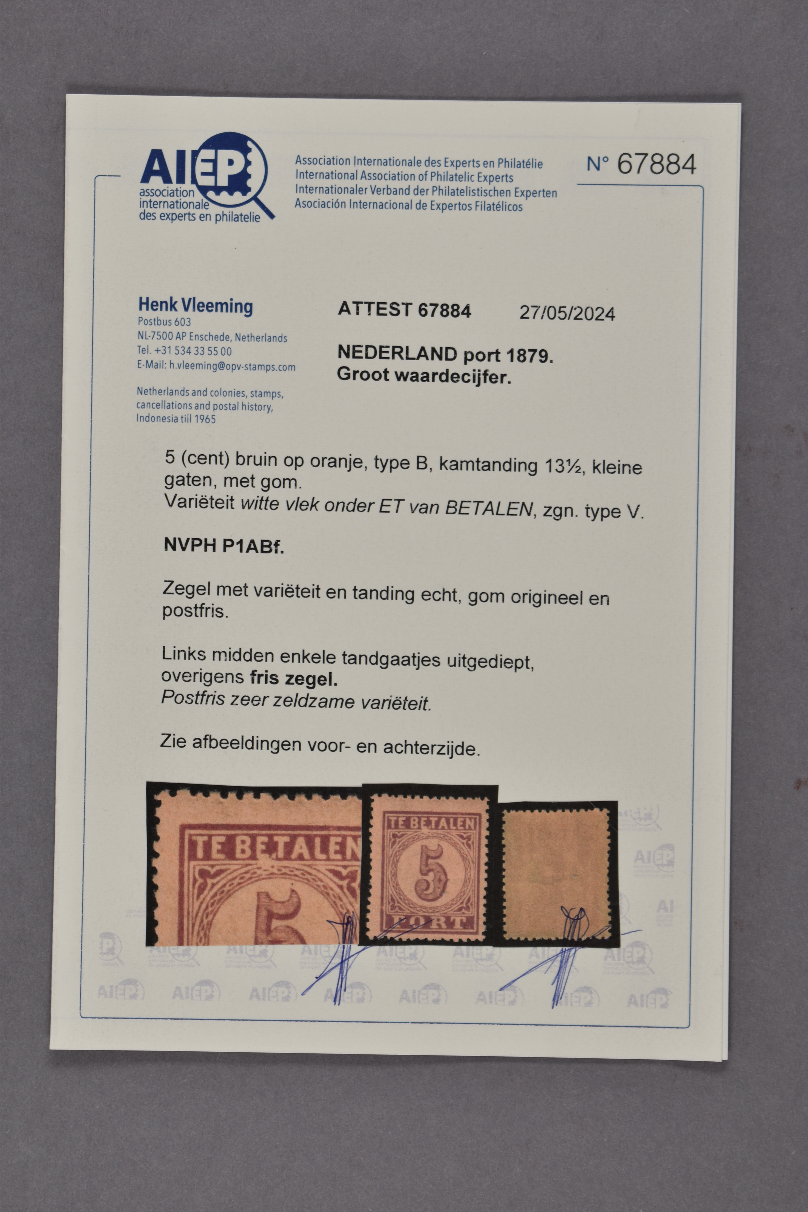 1302 nh imageP1ABf, 5 cent bruin op oranje, type B, Kt. 13½ kl.g., met variëteit: "witte vlek onder ET van betalen, zgn. type V", postfris vrijwel prachtex. met aan linkerzijde enkele uitgediepte tandgaatjes. Certificaat Vleeming (2024) Cataloguswaarde voor ongebruikt € 400+ (Image) (Image2)