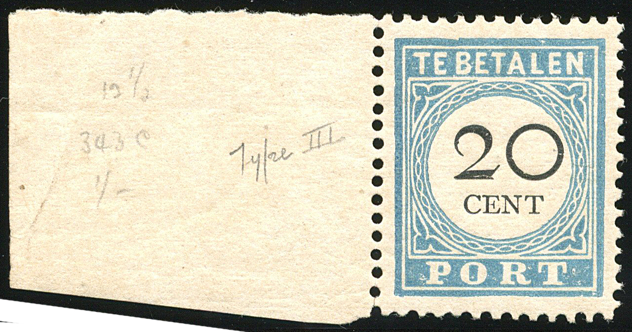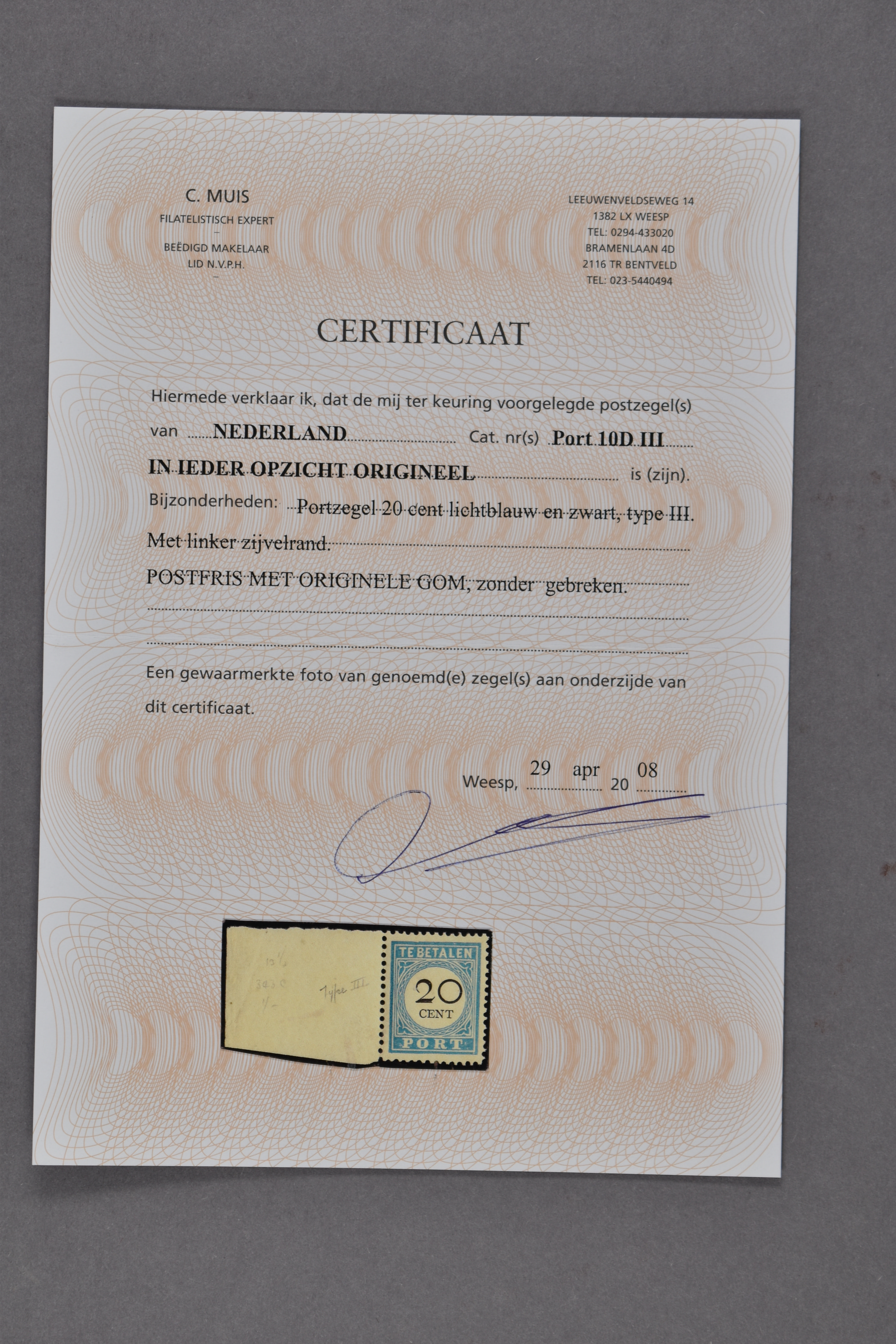 1309 nh imageP10DIII, 20 cent lichtblauw en zwart, Kt. 12½, postfris prachtex. met enkele originele zwarte puntjes in de gom en linker-velrand en met certificaat Muis (2008) € 250 (Image) (Image2)