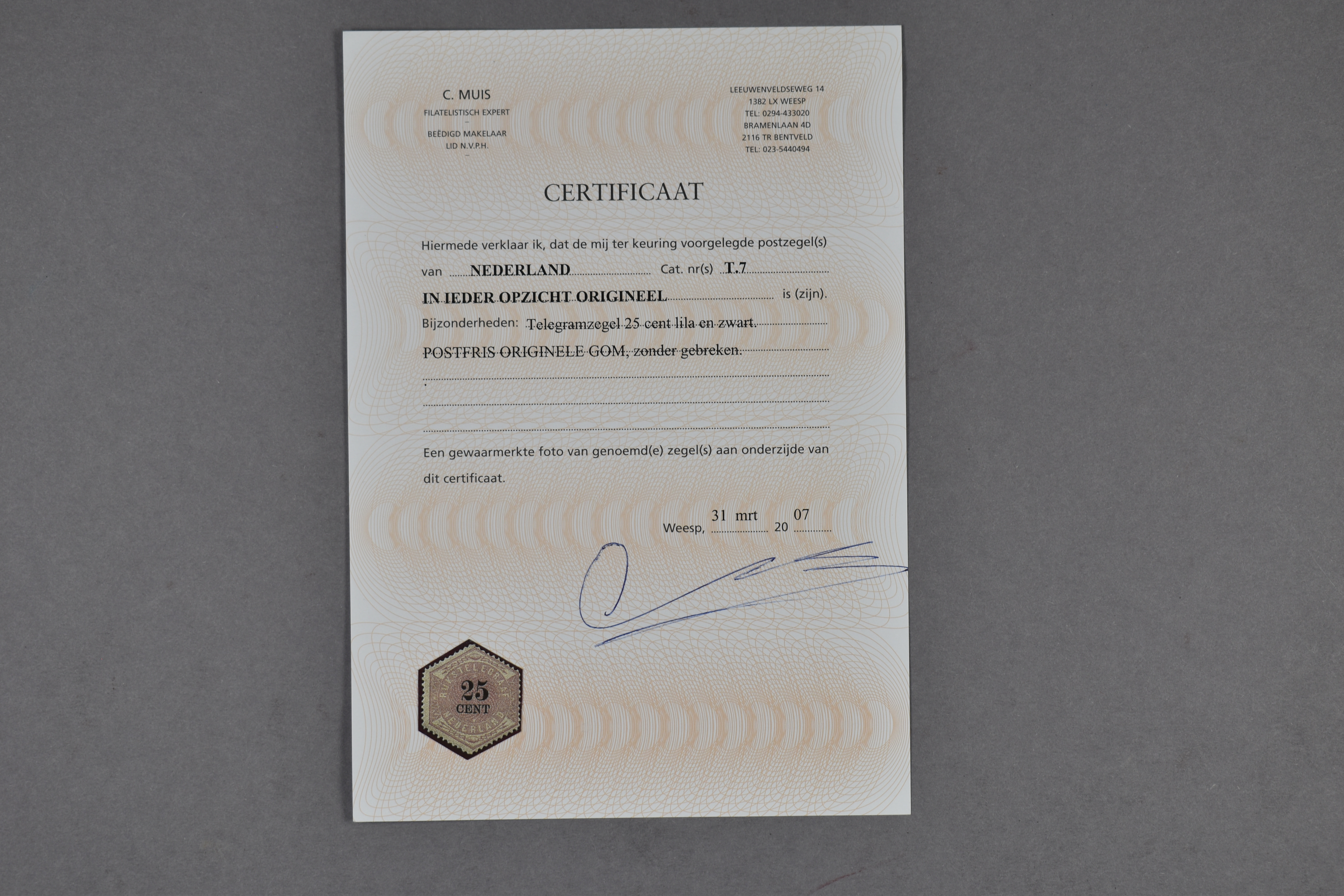 1352 og imageTG7, 25 cent lila en zwart, ongebruikt prachtex. met certificaat Vleeming (2025) € 2100 (Image) (Image2)