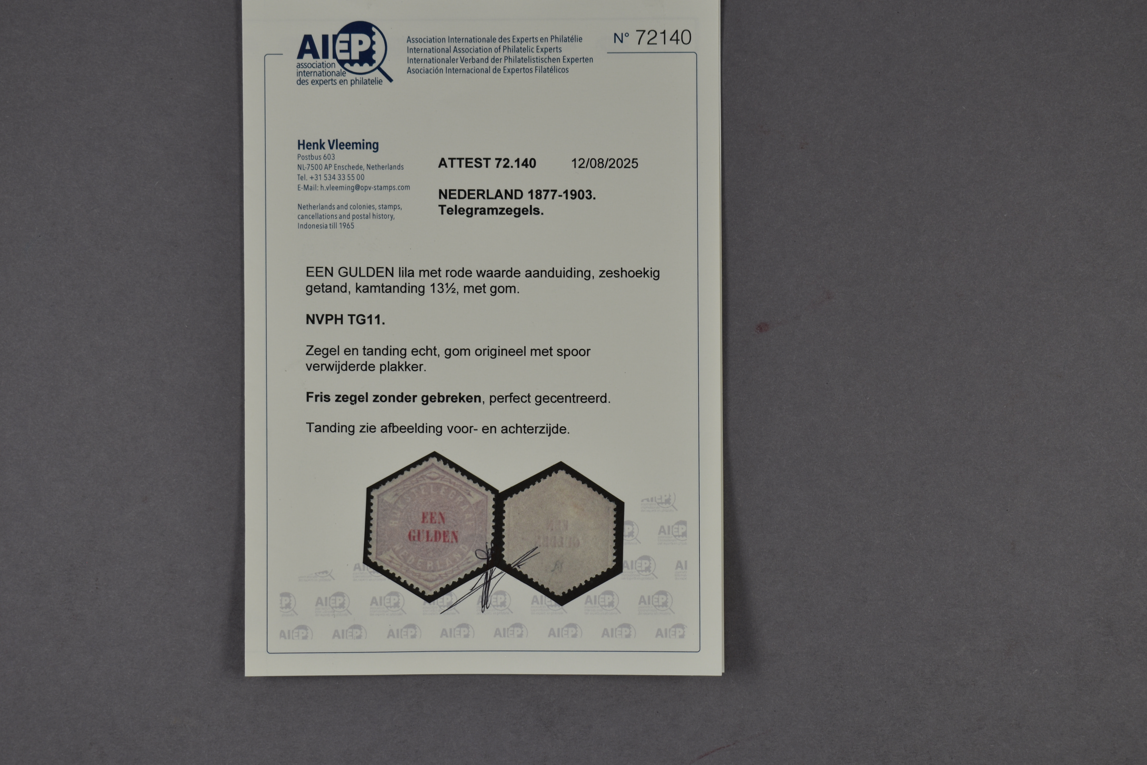 1360 og imageTG11, Een gulden lila en rood, ongebruikt, perfect gecentreerd prachtex. met certificaat Vleeming (2025) € 2300 (Image) (Image2)
