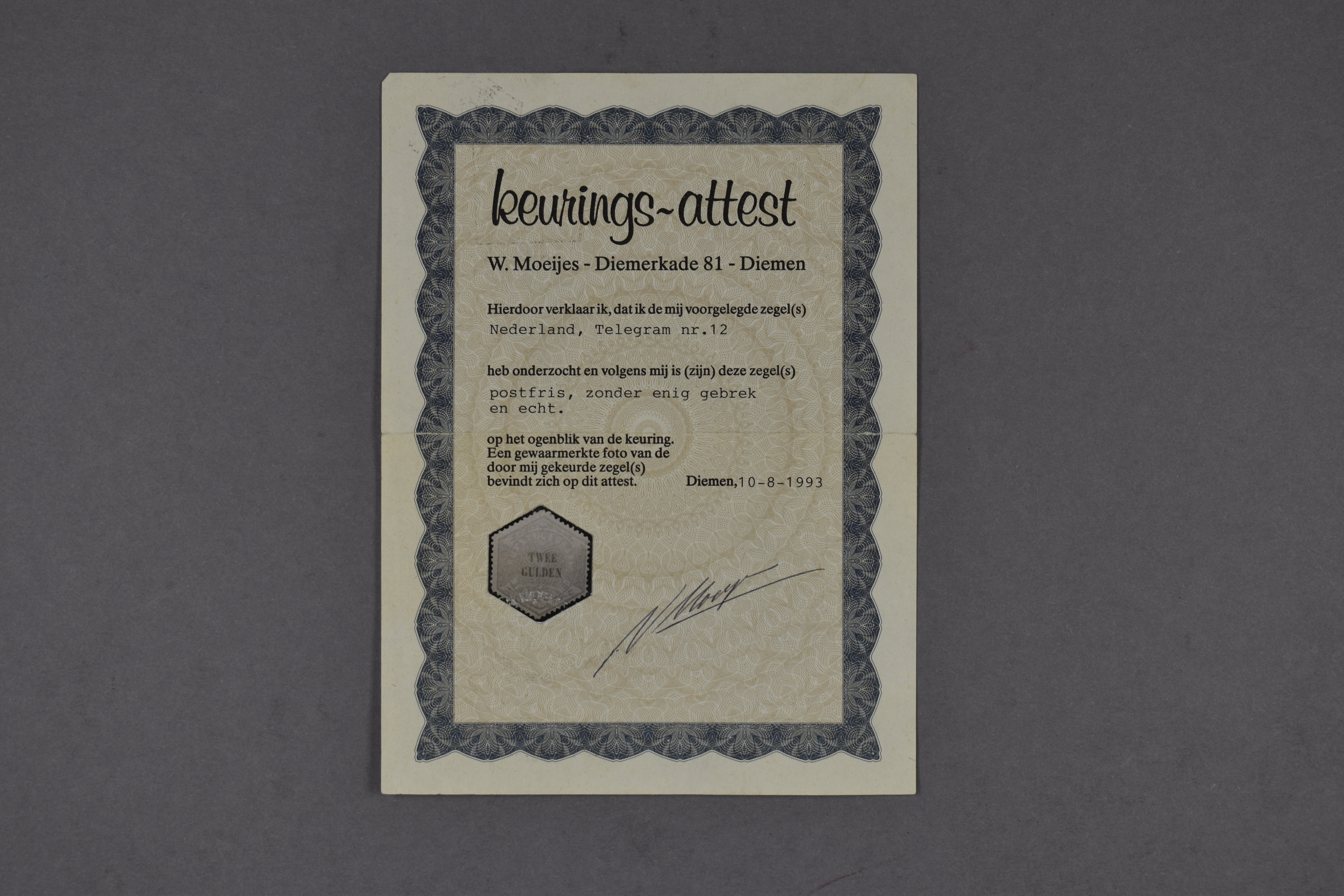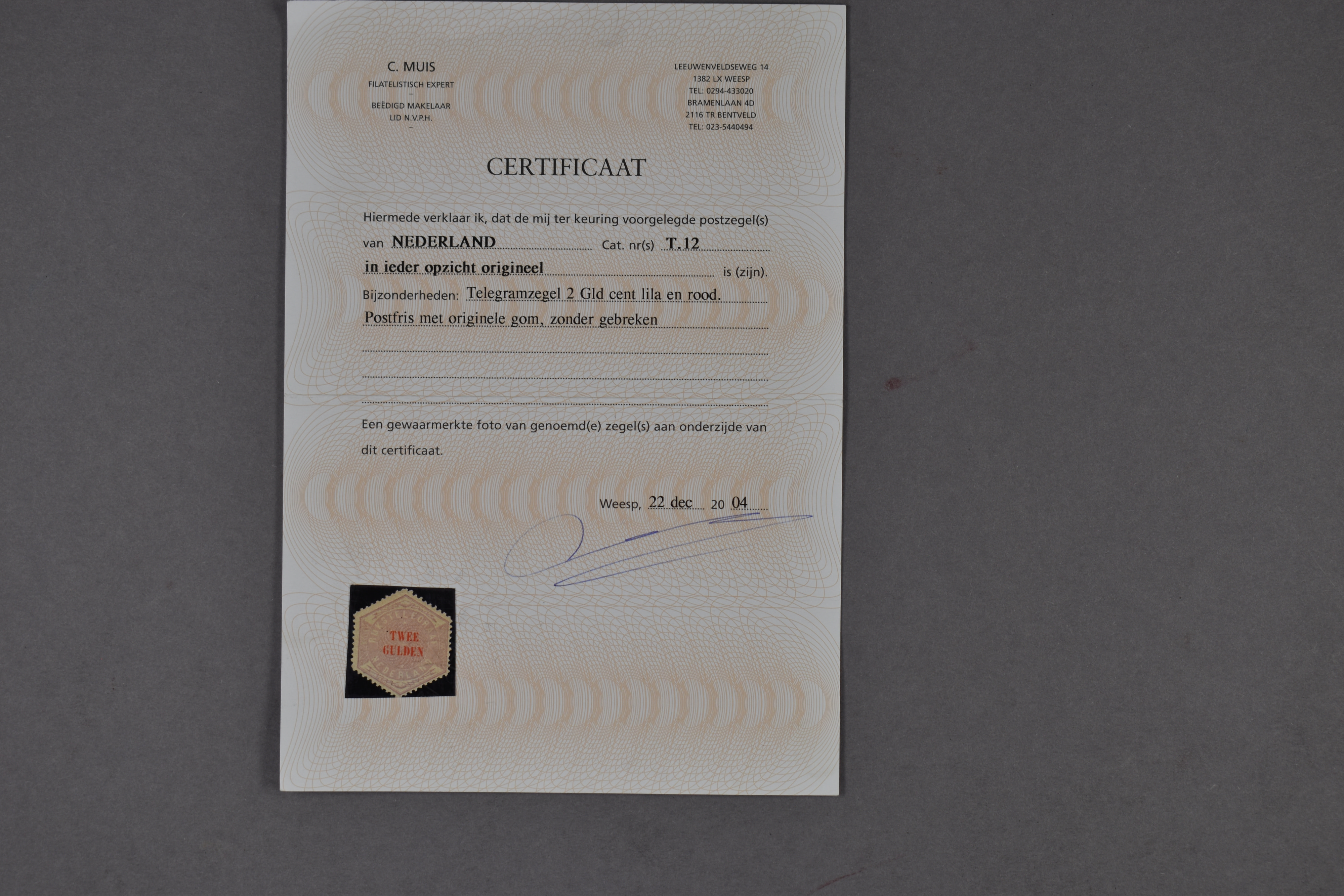 1361 nh imageTG12, Twee gulden, lila en rood, postfris prachtex. met certificaat Moeijes (1993) en Muis (2004) € 13.000 (Image) (Image2)