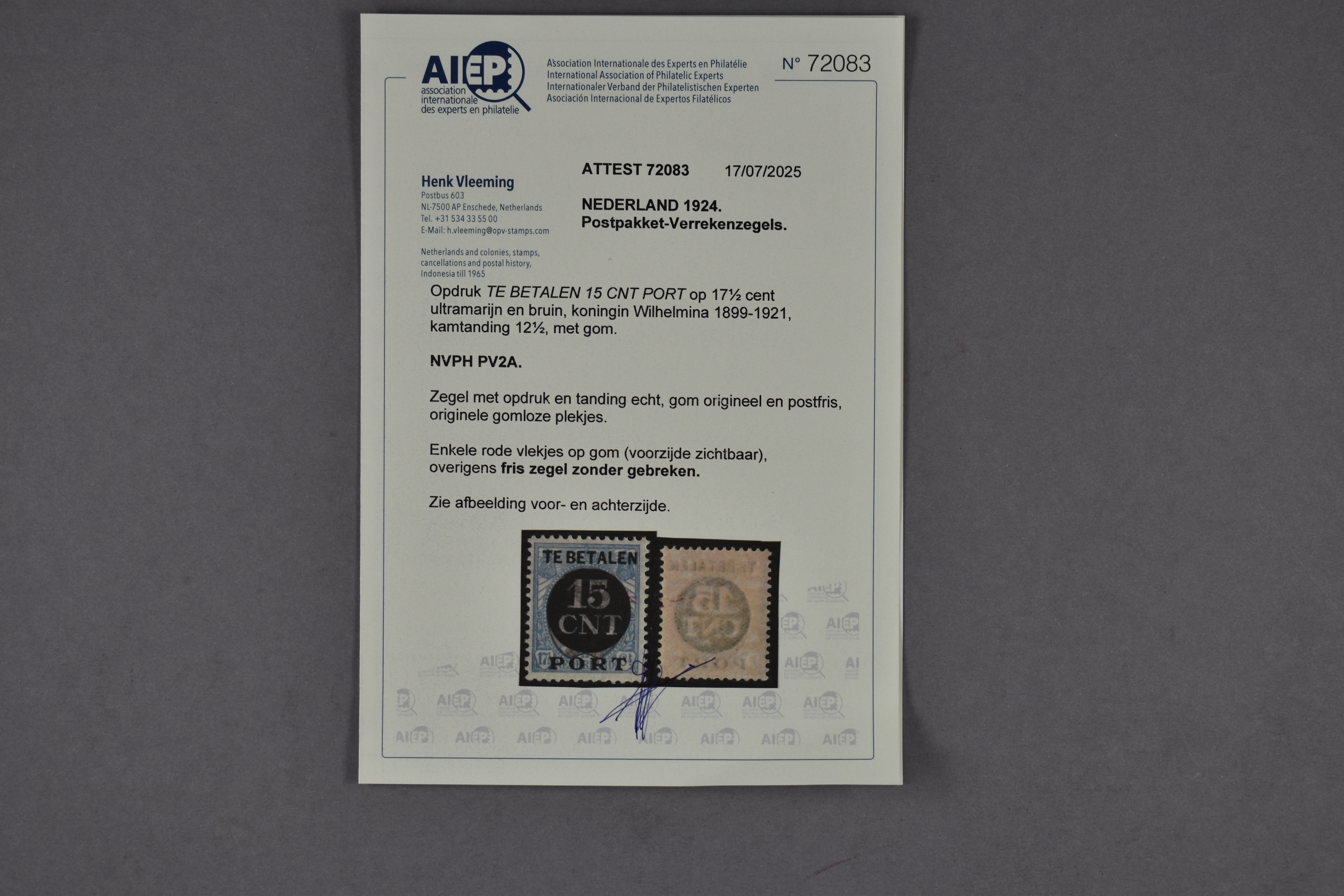 1363 nh imagePV2A, 15 CNT op 17½ cent ultramarijn en bruin, postfris prachtex. met licht rood vlekje en certificaat Vleeming (2025) € 20.000 (Image) (Image2)