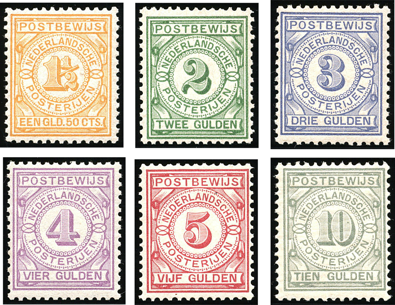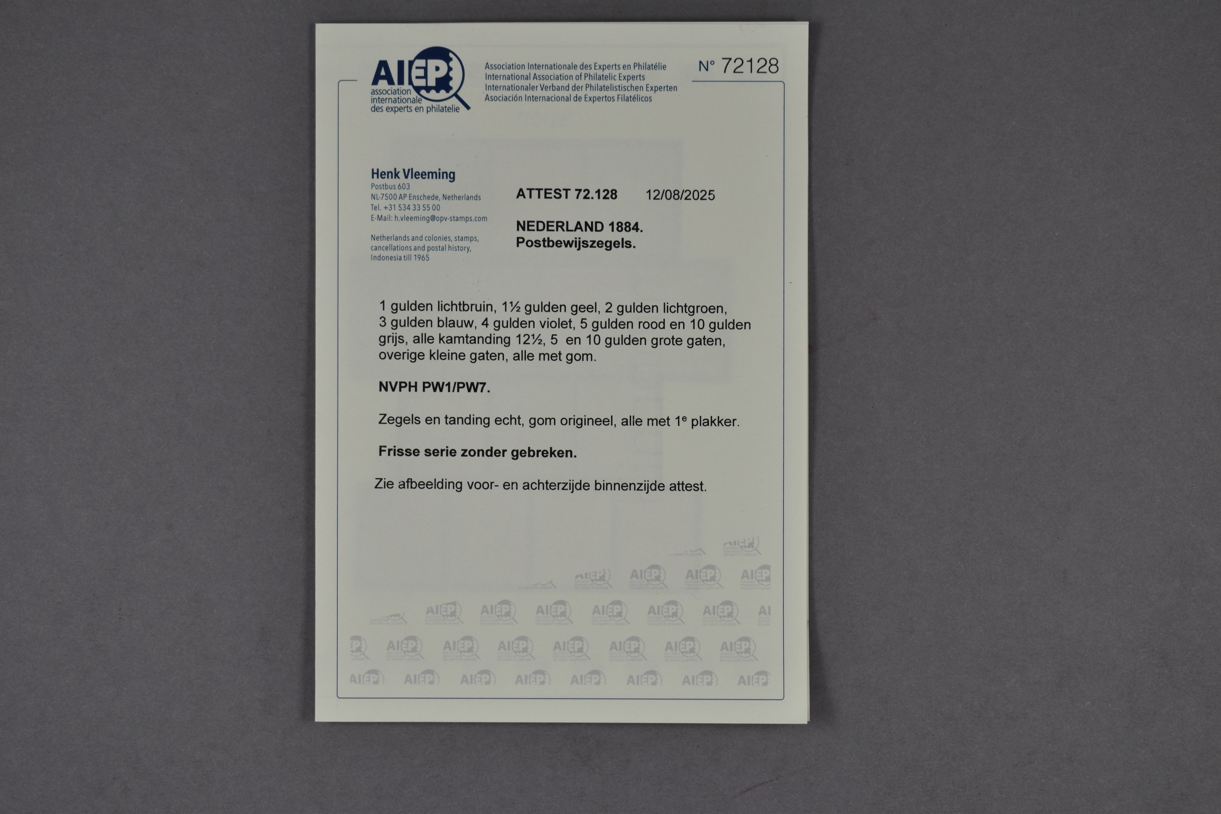 1364 nh imagePW1/PW7, 1 t/m 10 gulden, complete postfrisse prachtserie met certificaat Vleeming (2025): "10 gulden doffe gomplek, ov. frisse serie, mooi getand". € 10.000 (Image) (Image2)